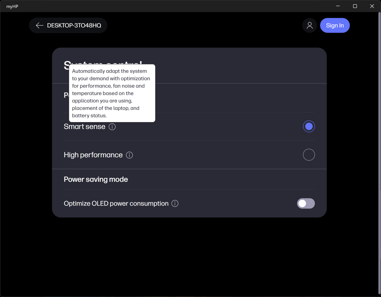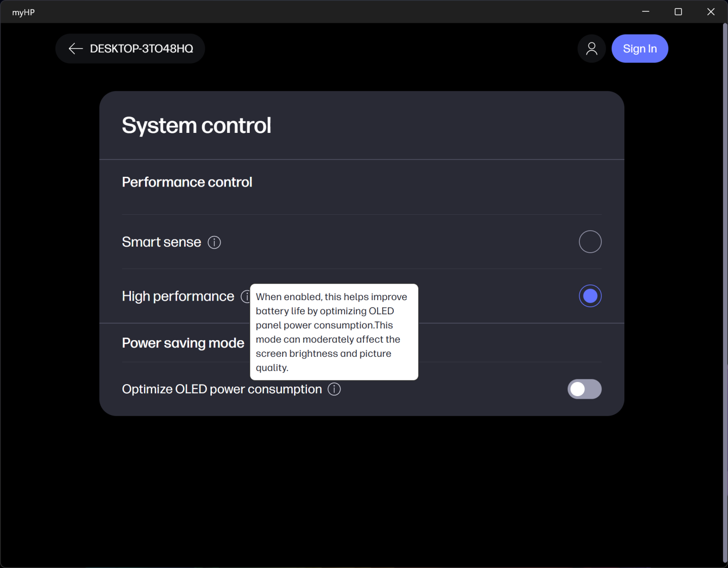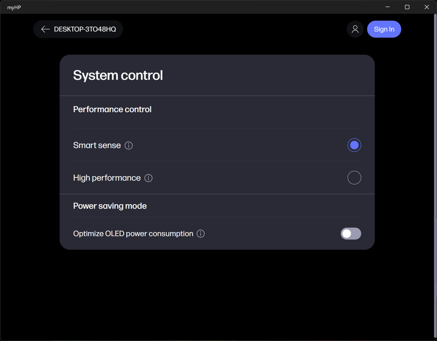 Через фірмовий застосунок HP пропонує нехитре перемикання між двома режимами роботи — Smart Sense та Performance. У другому випадку дещо підвищується швидкодія процесора ціною певного росту й енергоспоживання. Також є режим економії споживання OLED-панелі:
