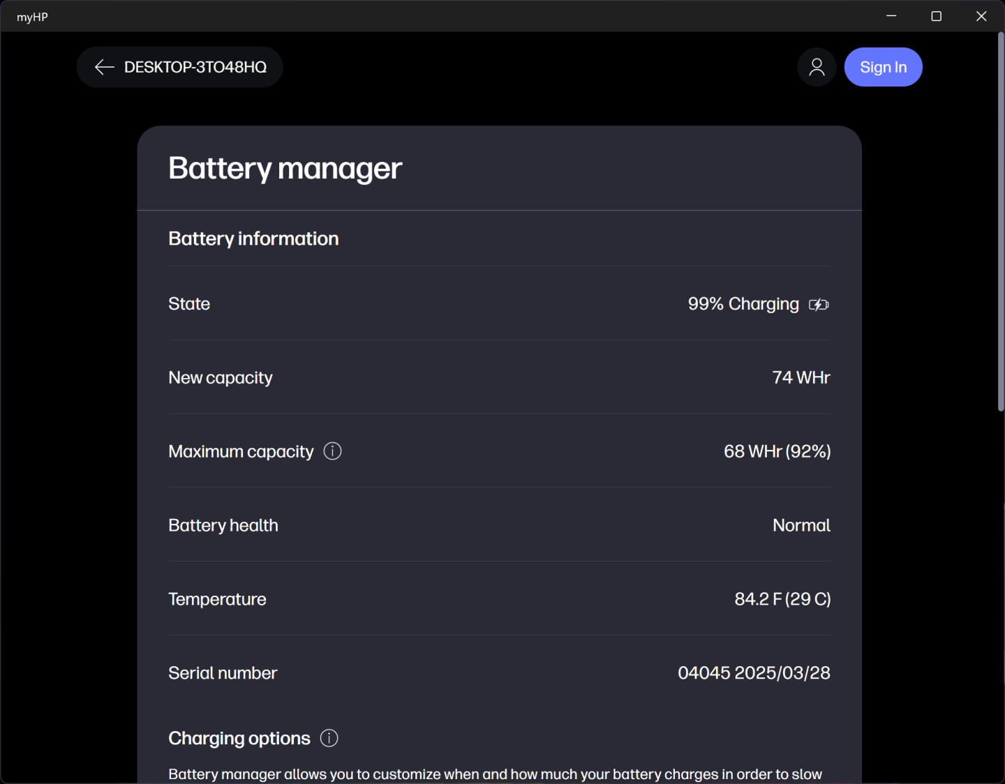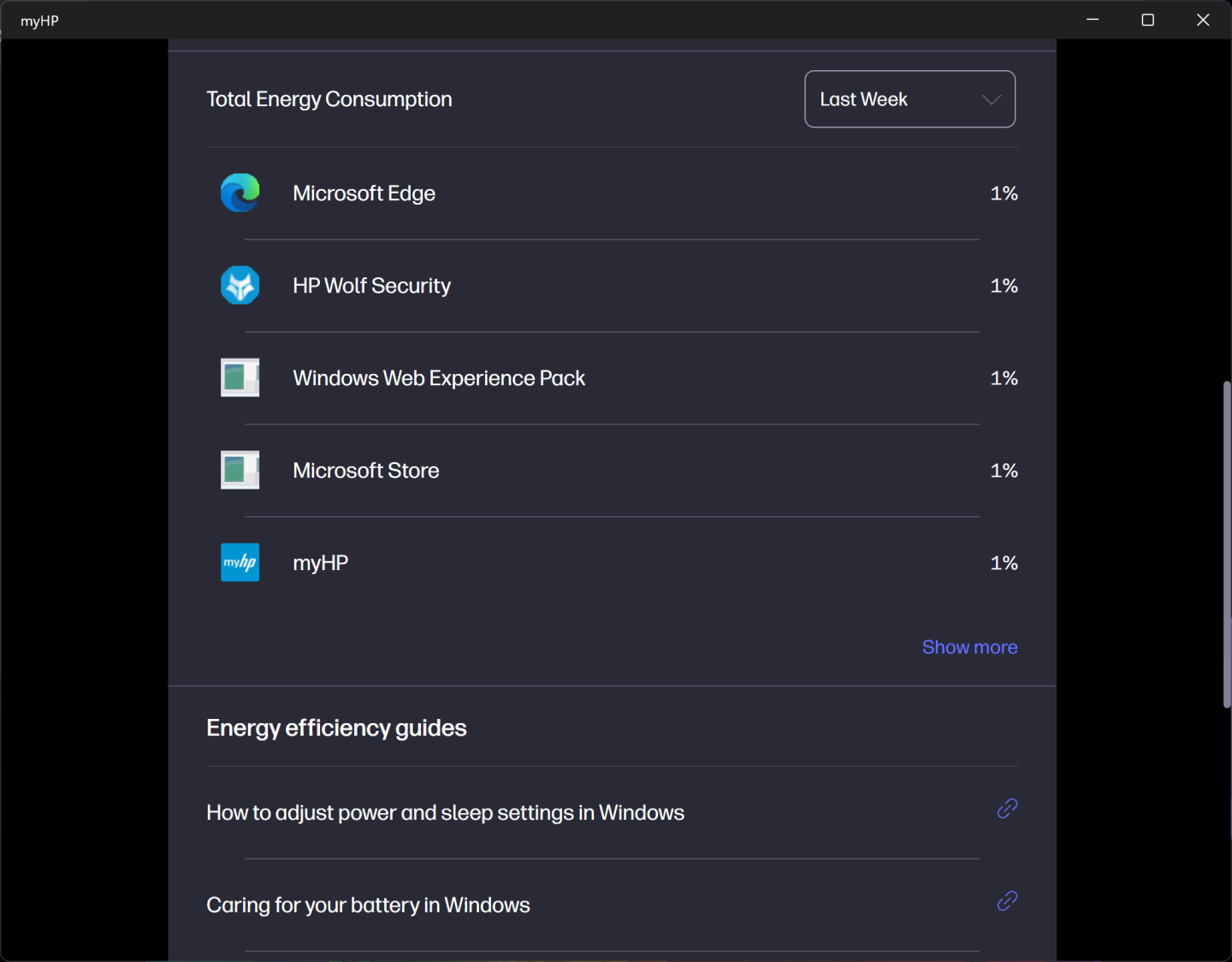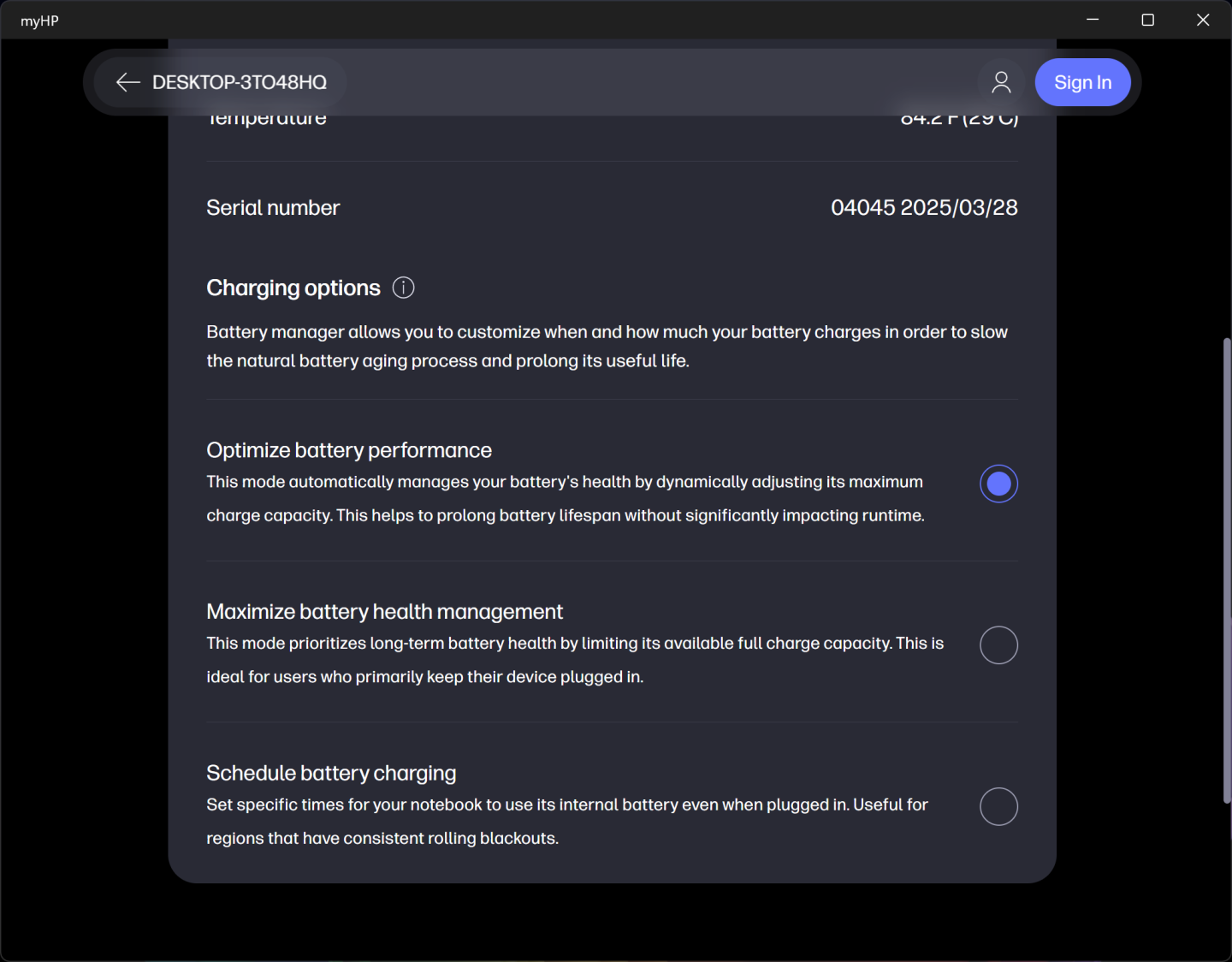 Через фірмовий застосунок HP пропонує нехитре перемикання між двома режимами роботи — Smart Sense та Performance. У другому випадку дещо підвищується швидкодія процесора ціною певного росту й енергоспоживання. Також є режим економії споживання OLED-панелі: