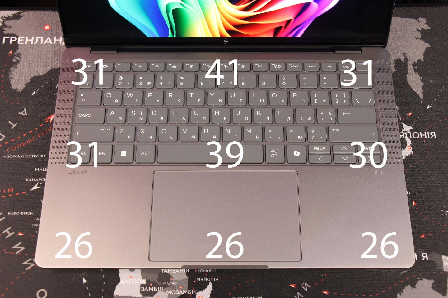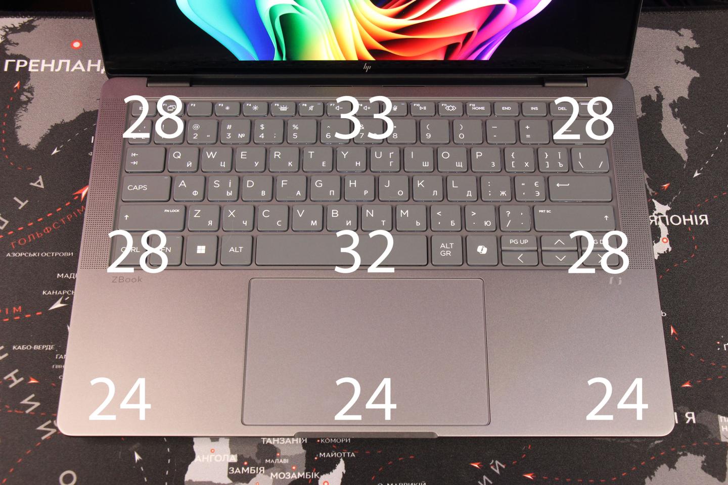 Клавіатура з білим підсвічуванням, рівноцінно добре читаються легенди англійською та українською мовами. Хід клавіш м’який з чітким відгуком забезпечує комфортний набір тексту. Розкладка стандартна без цифрового блоку, що природно для 14-дюймового формату.