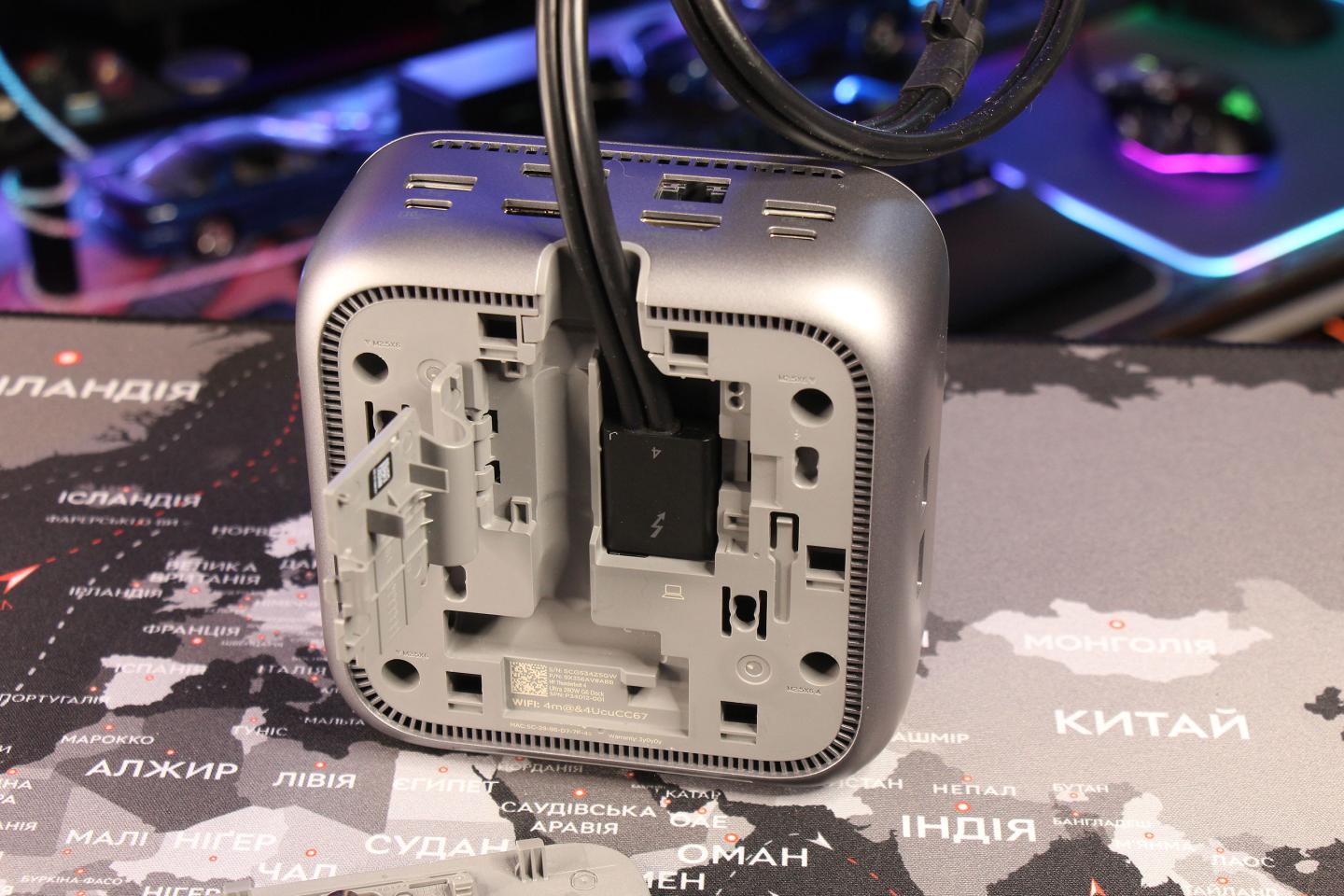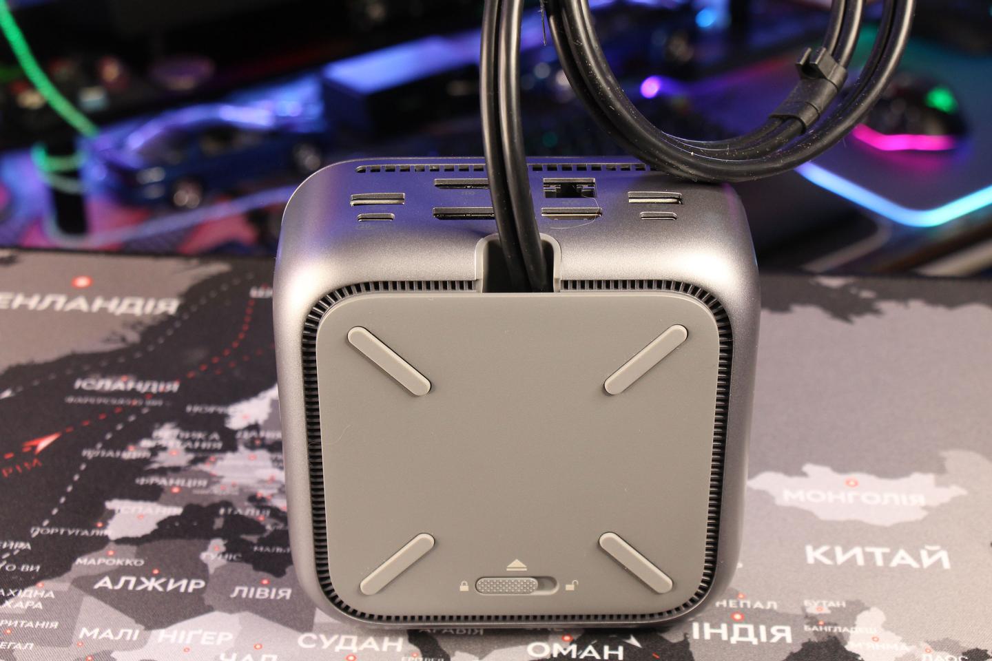Док-станція виконана в сучасному стилі з металевим корпусом та підсвічуванням кнопки живлення. Підключення до ноутбука здійснюється одним Thunderbolt 4 кабелем, що одночасно забезпечує передачу даних, відео та живлення.