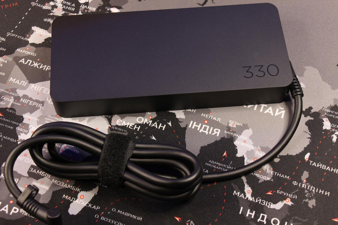 В комплекті постачається компактний блок живлення потужністю 140 Вт з зафіксованим дротом USB‑C та знімним дротом 220 В.