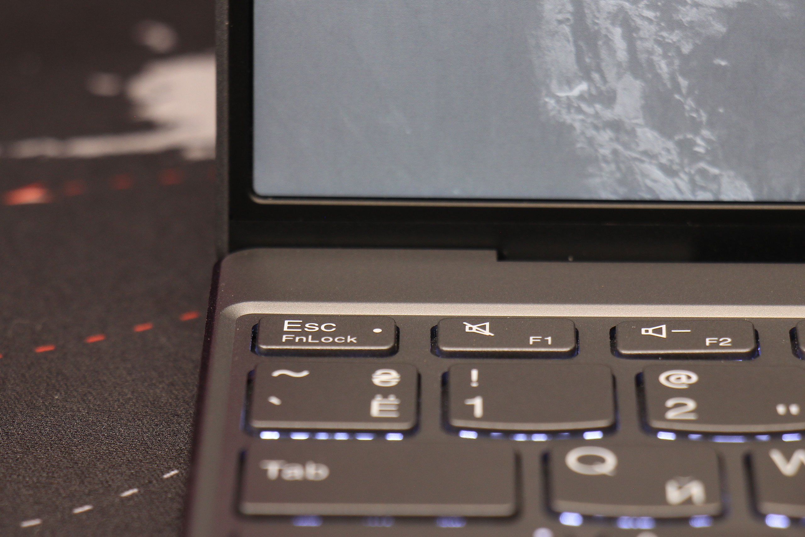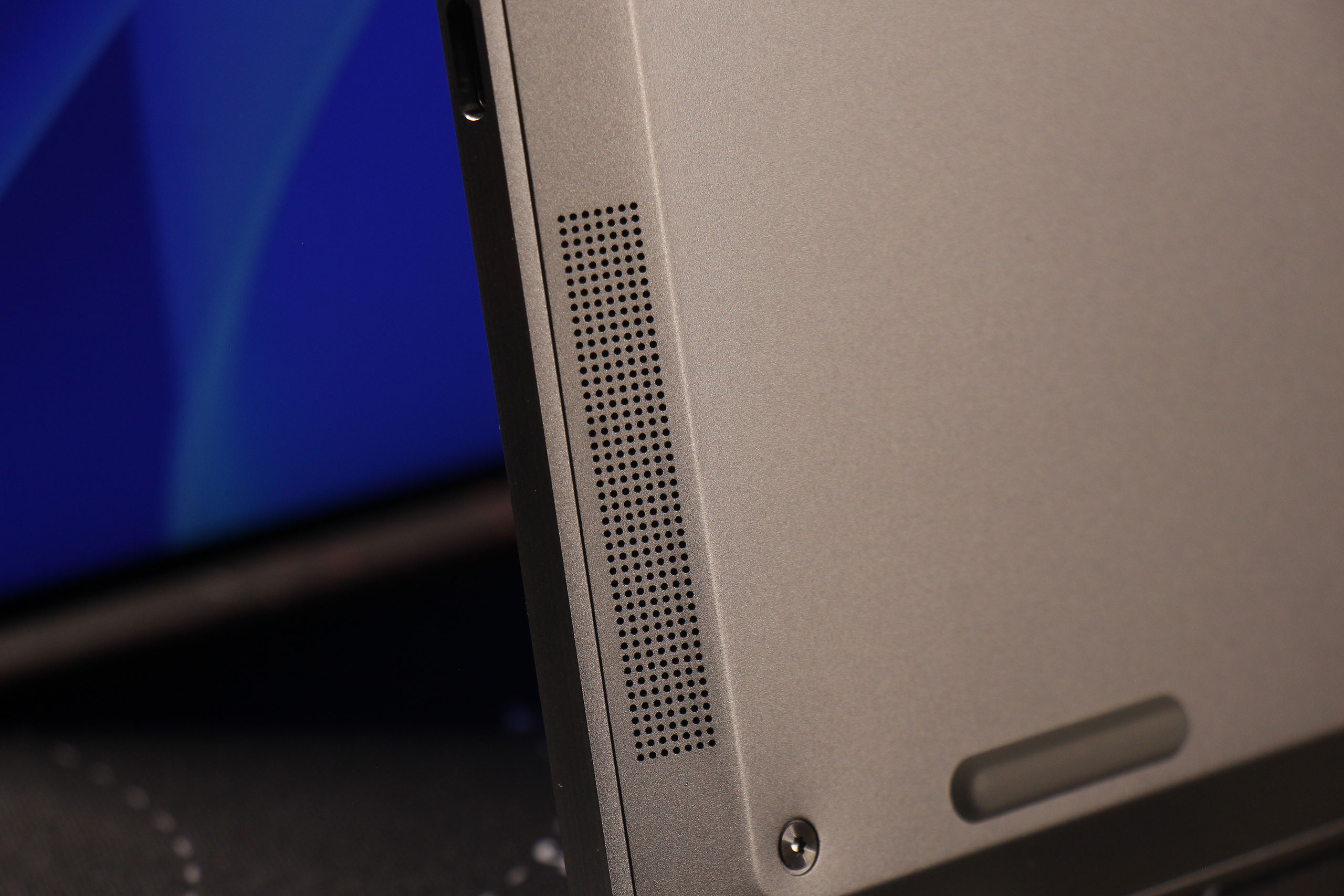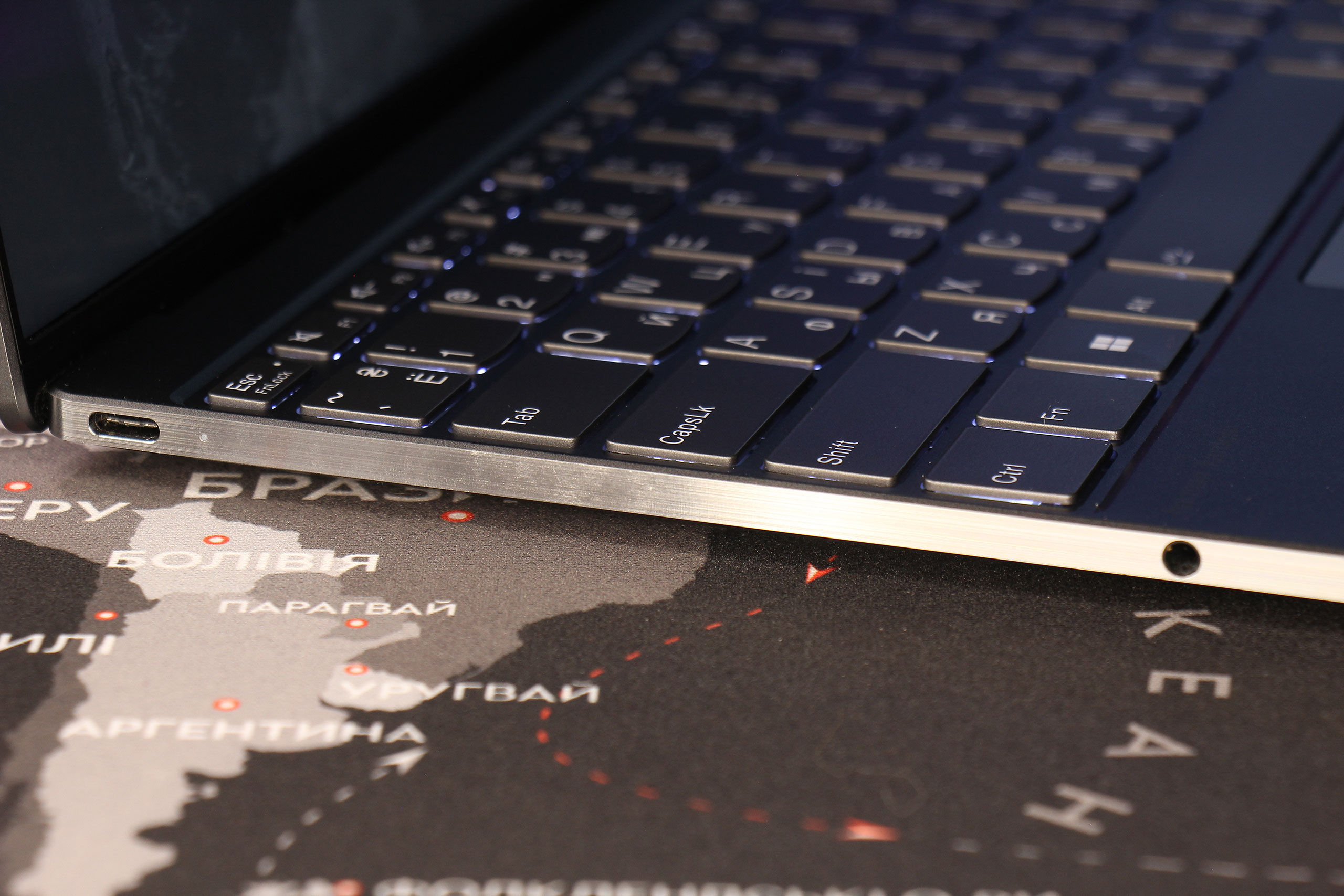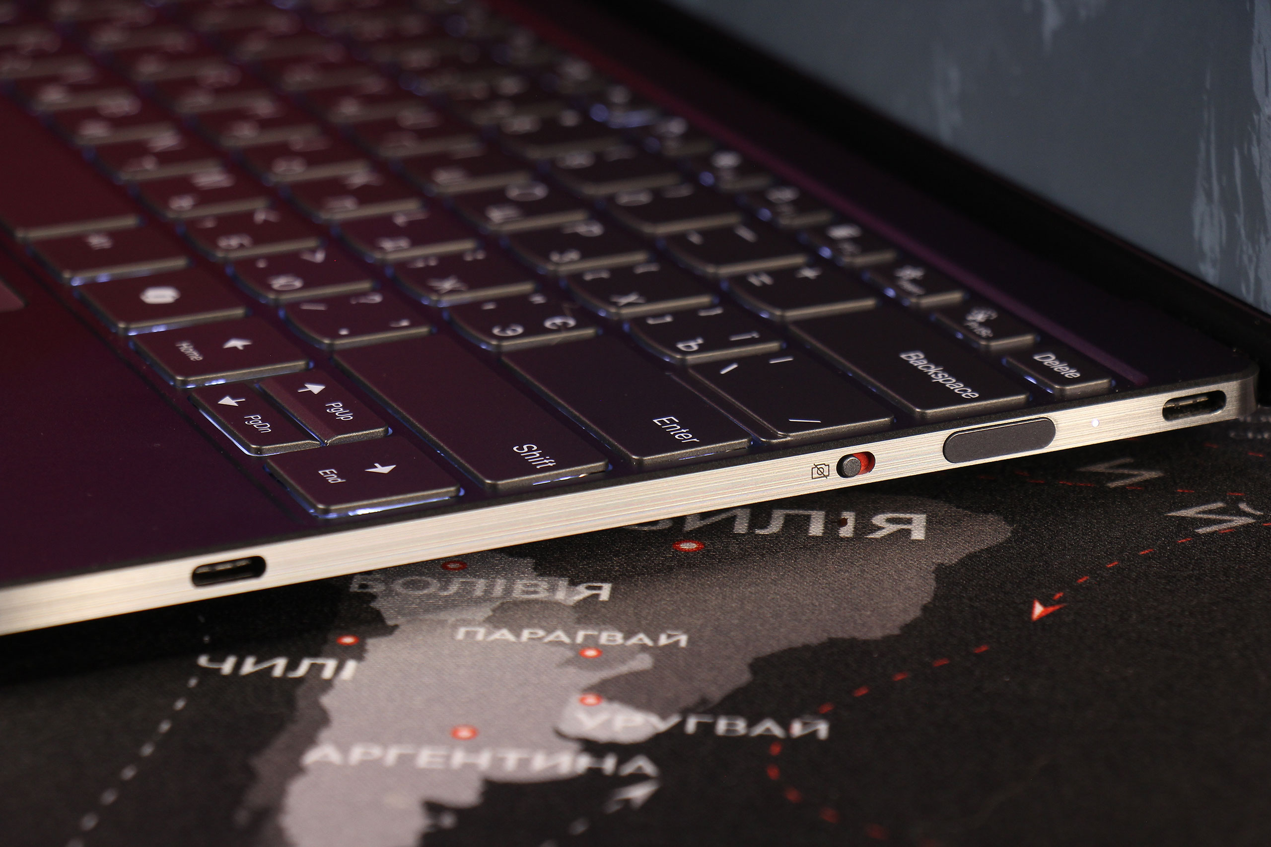 Кнопка ввімкнення з вбудованим сканером відбитка пальця розміщена на правому торці, а не на клавіатурі, як це популярно зараз — і це плюс. В тому числі дозволяє вмикати та вимикати ноутбук у зачиненому стані, що корисно, якщо він використовується на робочому місці з додатковою периферією та монітором.