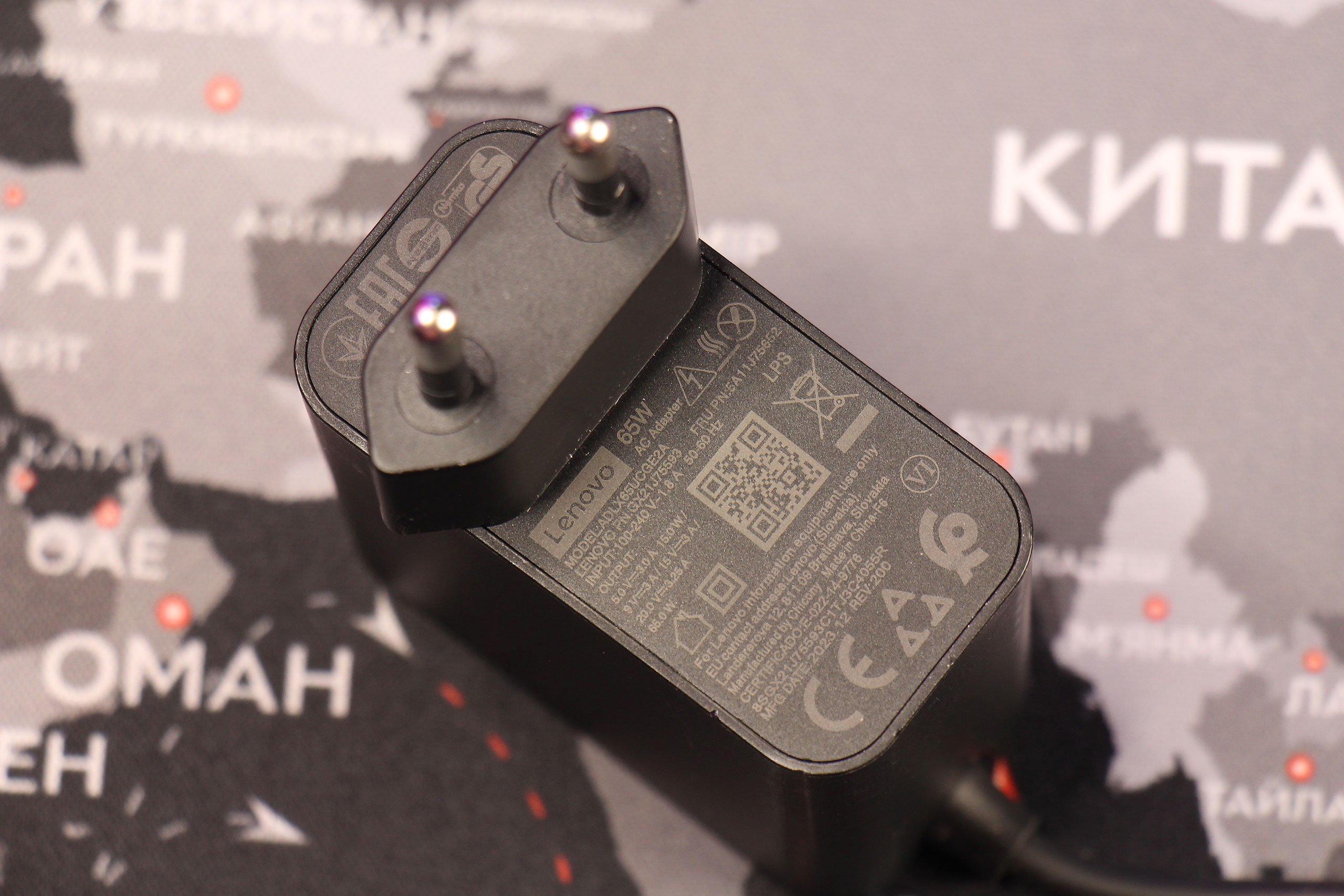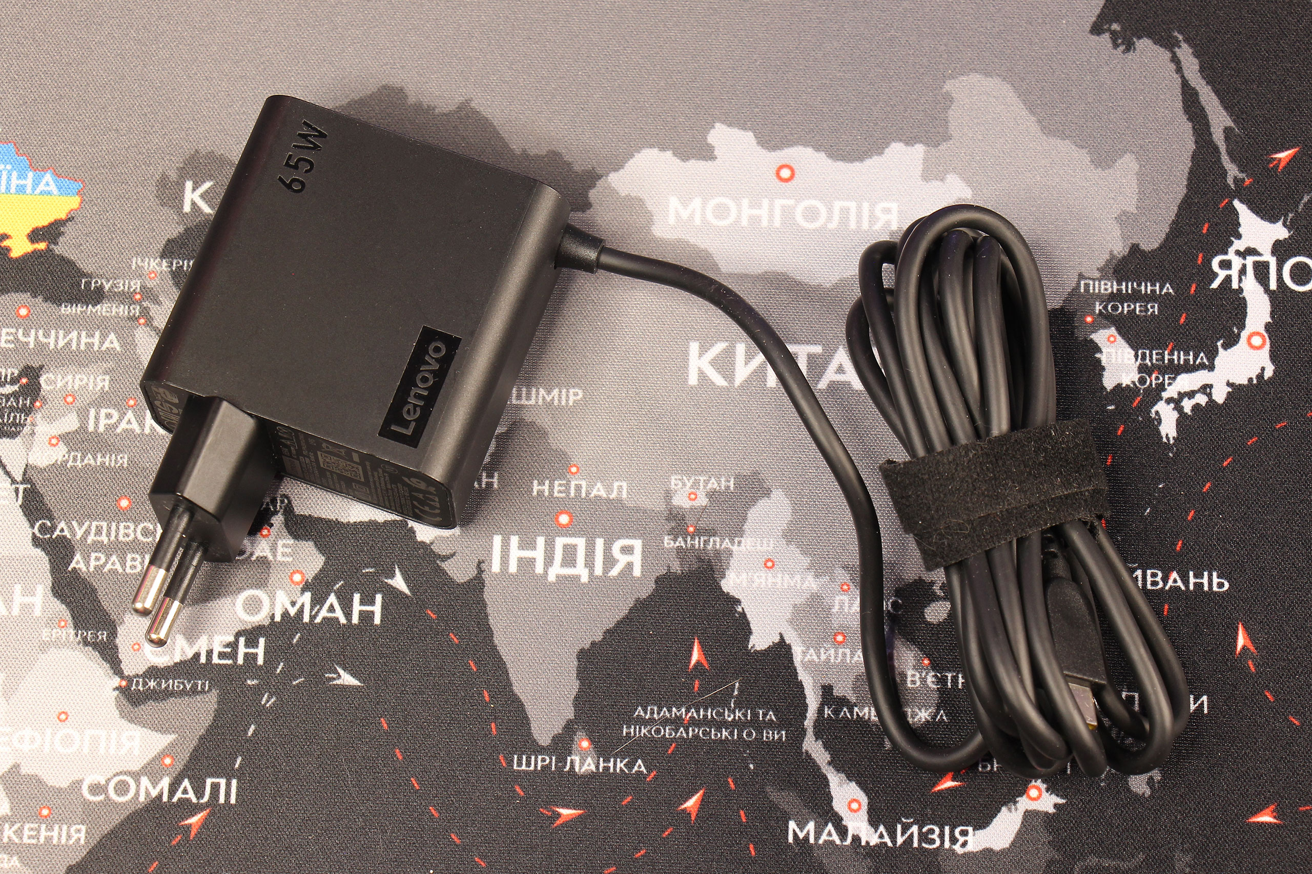 Комплектний блок живлення нічим особливим не виділяється: 65 Вт, роз’єм USB-C (звісно, який ще?), дріт незнімний.