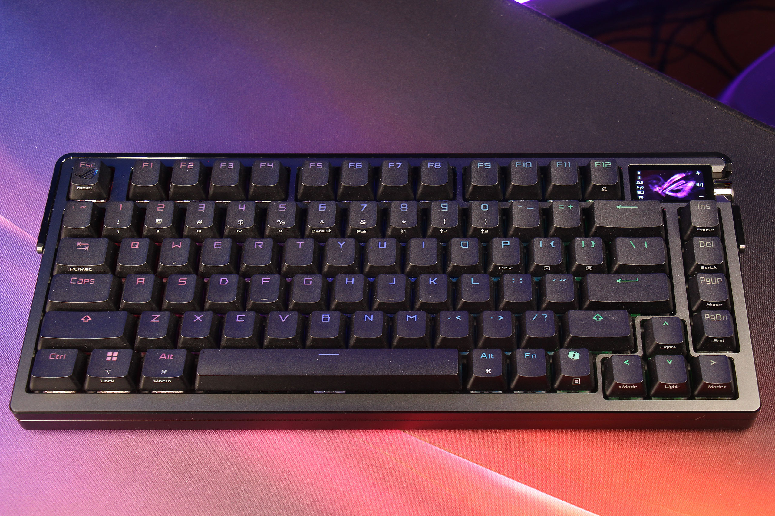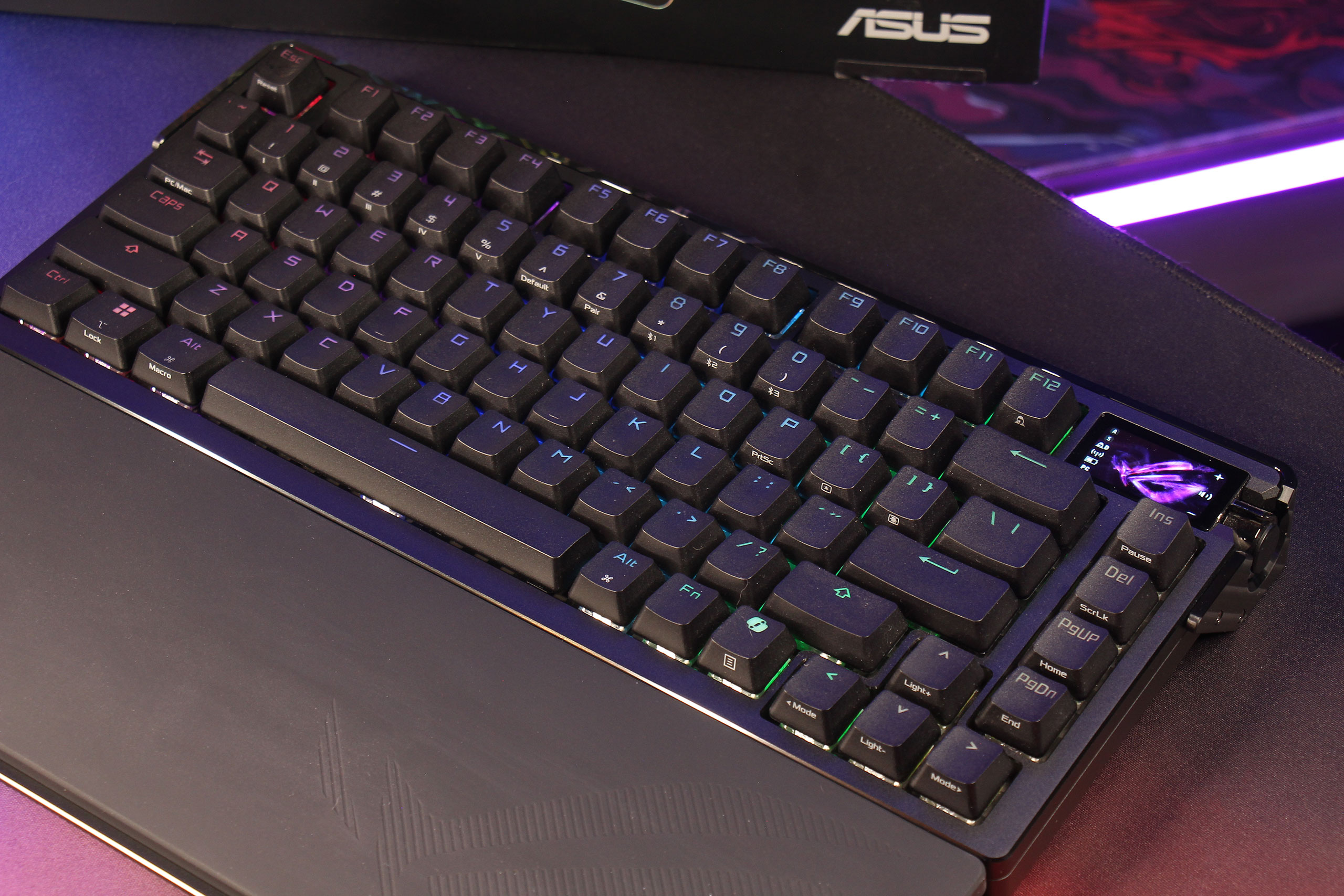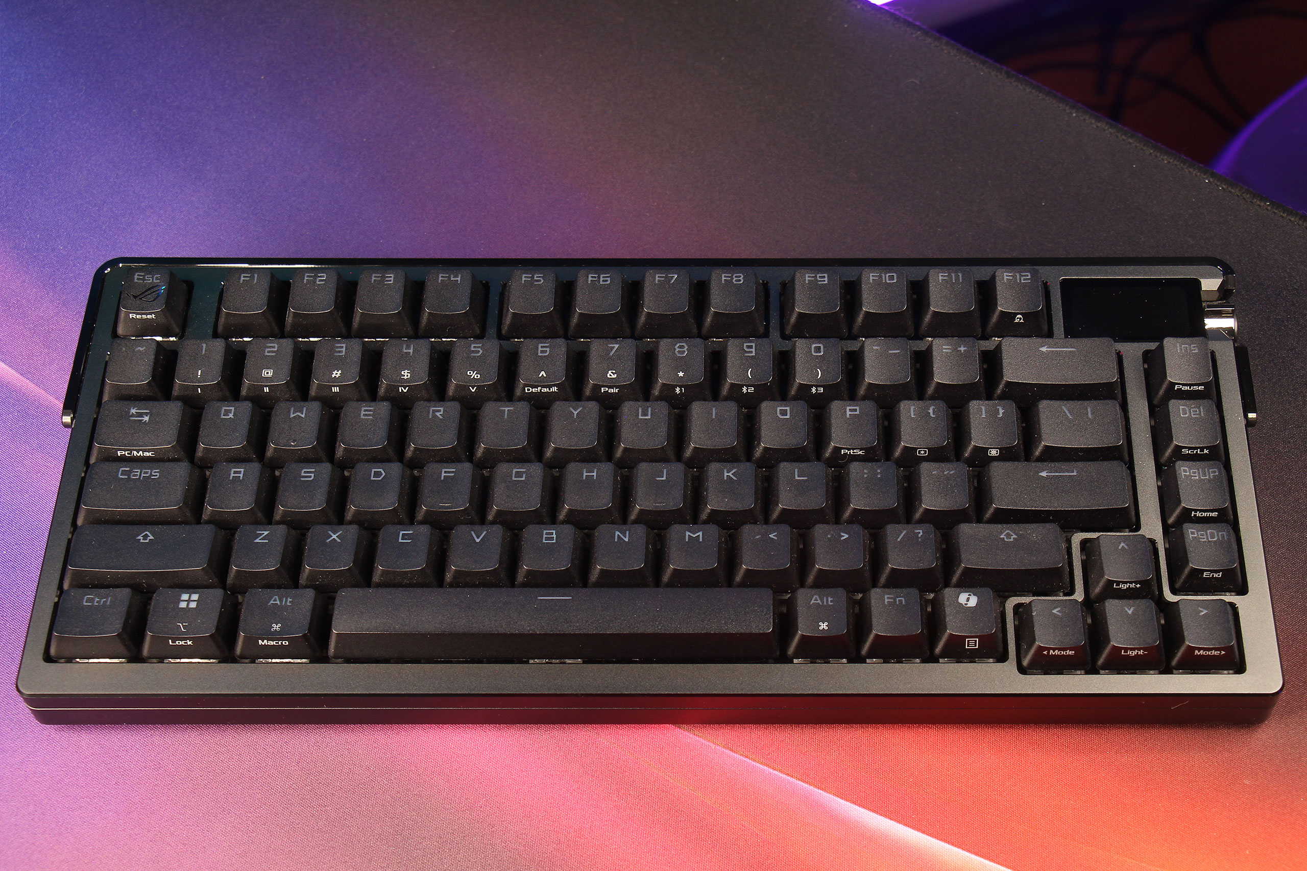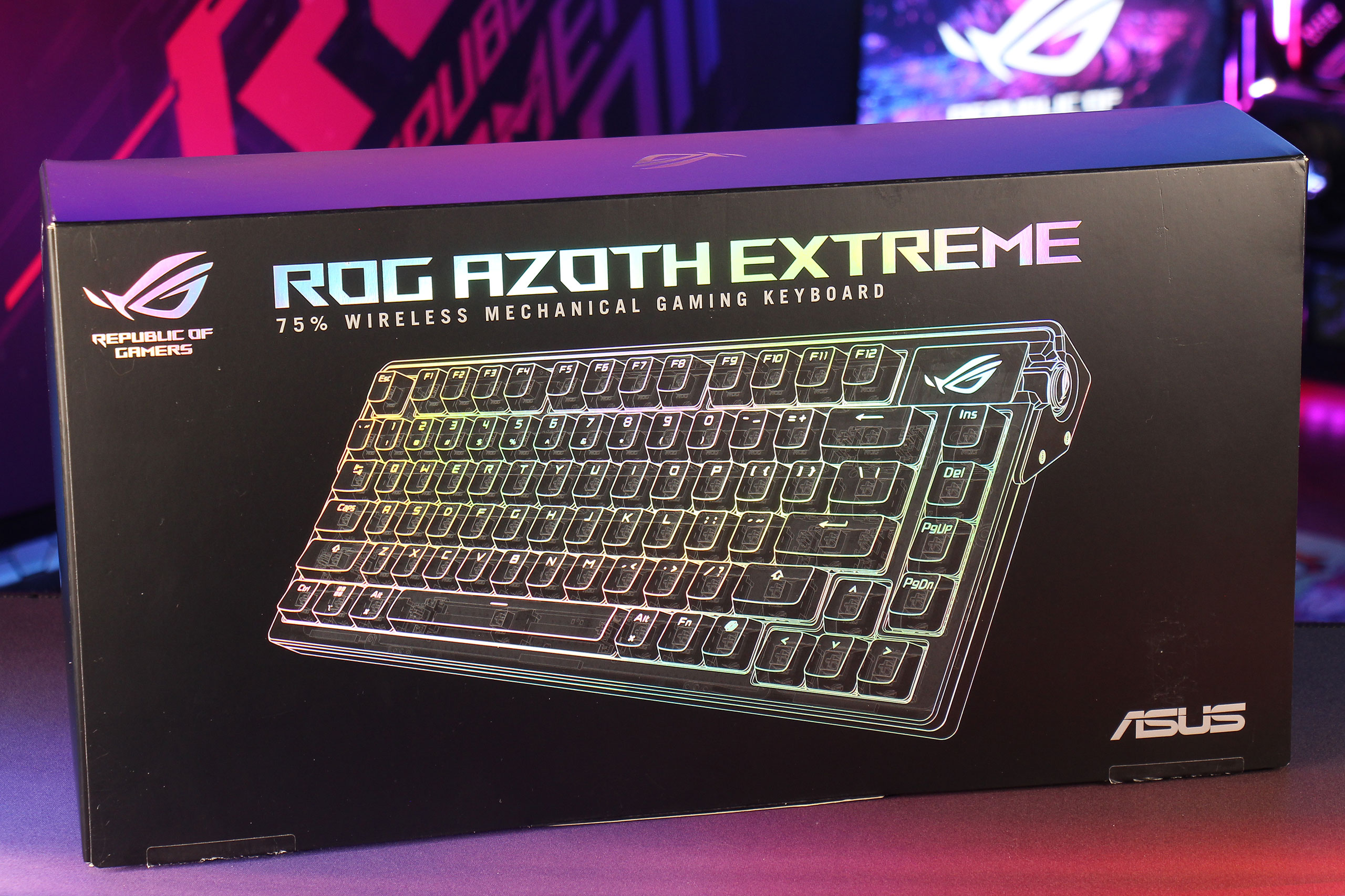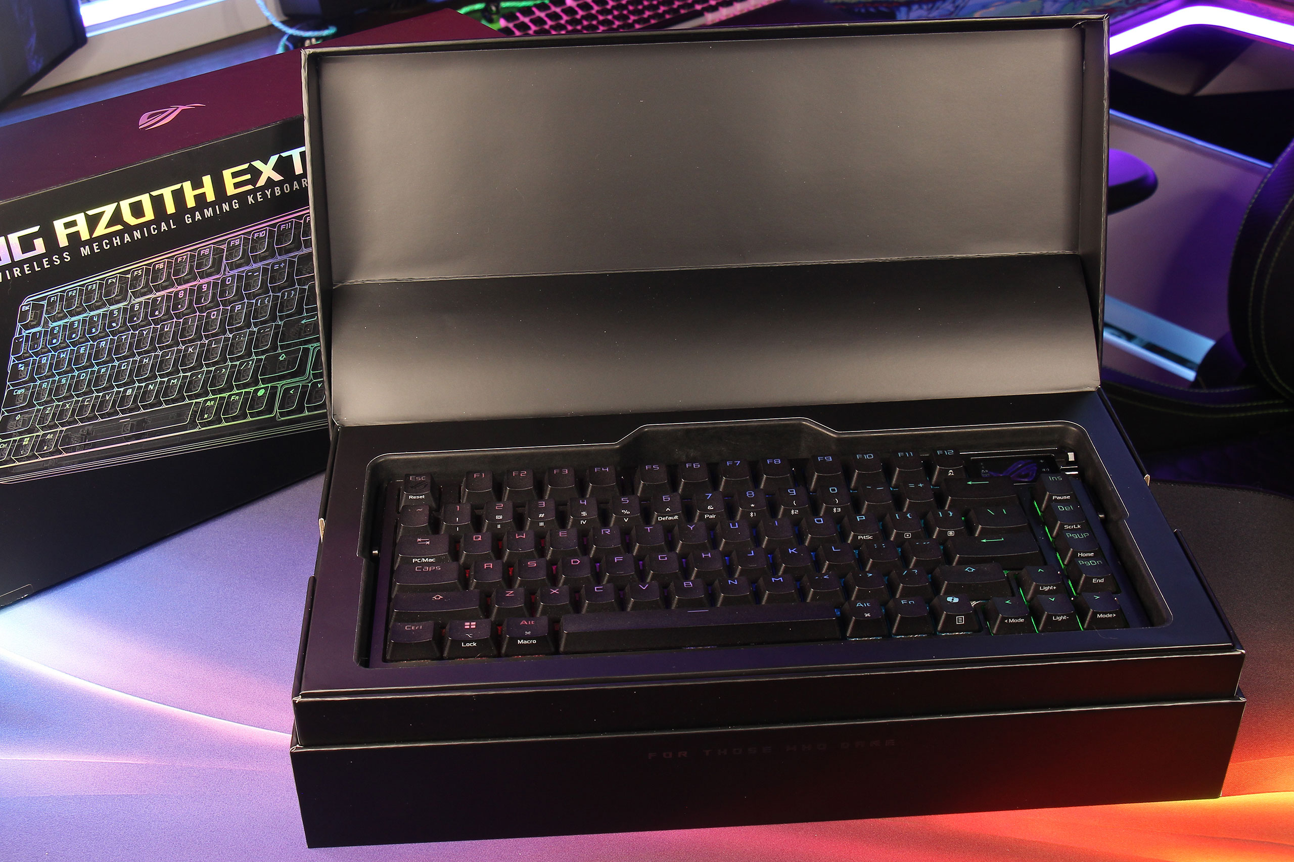 ROG Azoth Extreme використовує компактний 75% формат з 81 клавішею, що останнім часом набув значної популярності серед ентузіастів механічних клавіатур. Такий формат являє собою оптимальний компроміс між повнорозмірною та компактною клавіатурою: збережено функціональний ряд F1–F12, повноцінні стрілки та навігаційні клавіші, але прибрано цифровий блок та стандартний навігаційний острівець. Компонування ROG Azoth Extreme відрізняється від типових 75% тим, що навігаційні клавіші та стрілки формують окремі блоки.