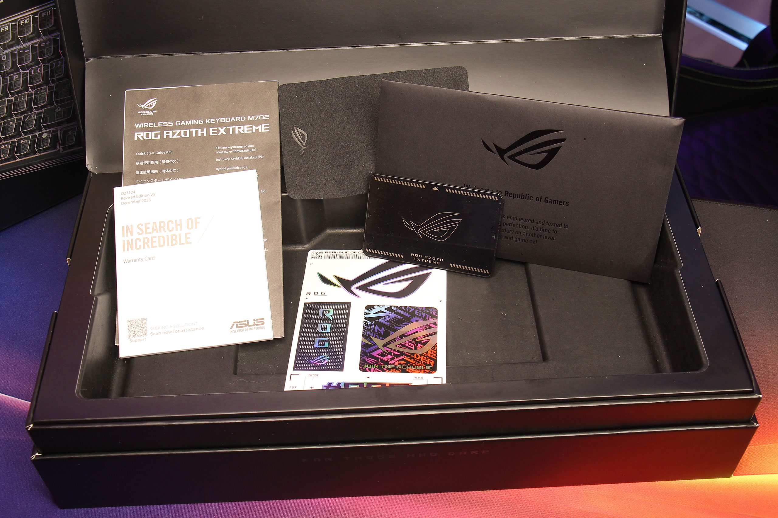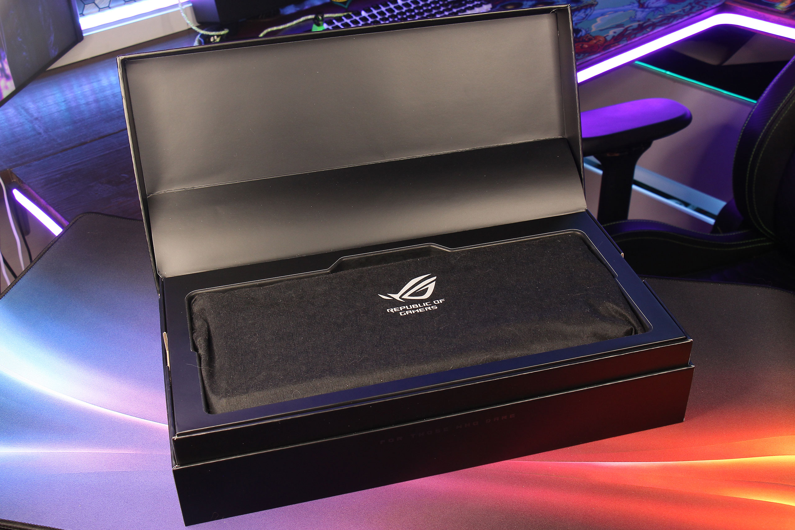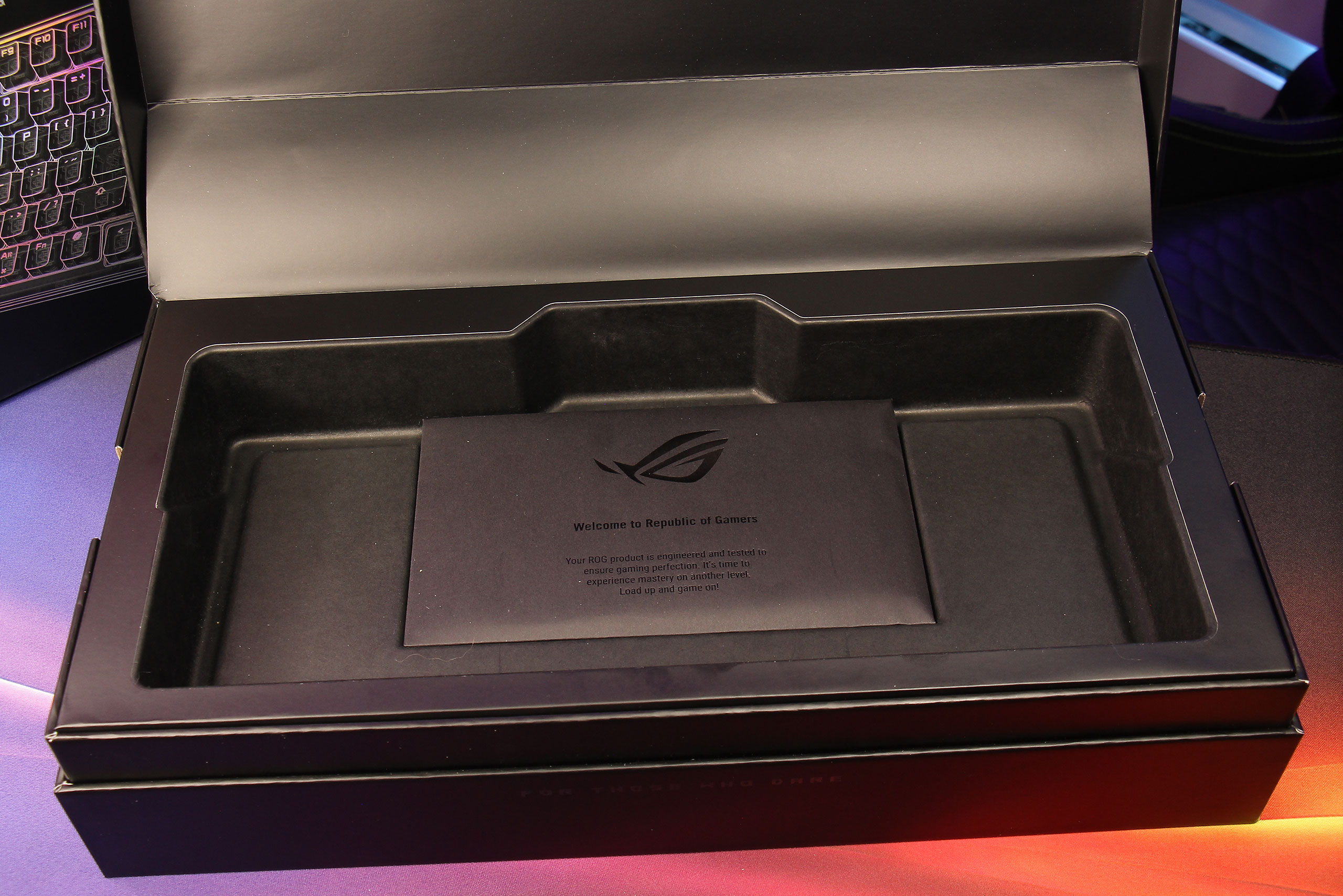 Коробка ROG Azoth Extreme відразу демонструє преміальний статус продукту. На відміну від звичайних упаковок, тут використовується багаторівнева конструкція з товстого картону, що відкривається плавно та елегантно. Сама коробка важить майже 1,5 кг — і це без клавіатури.