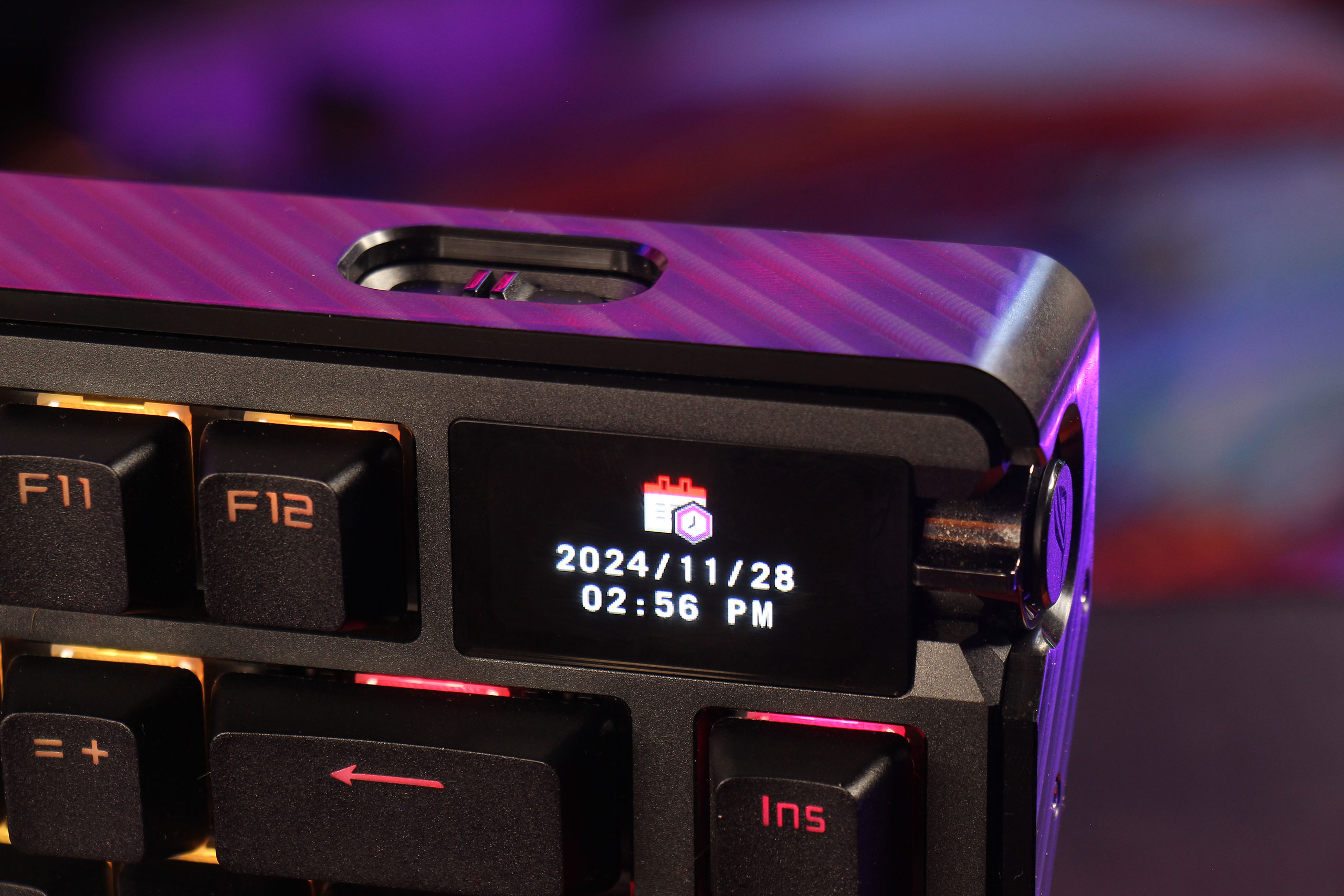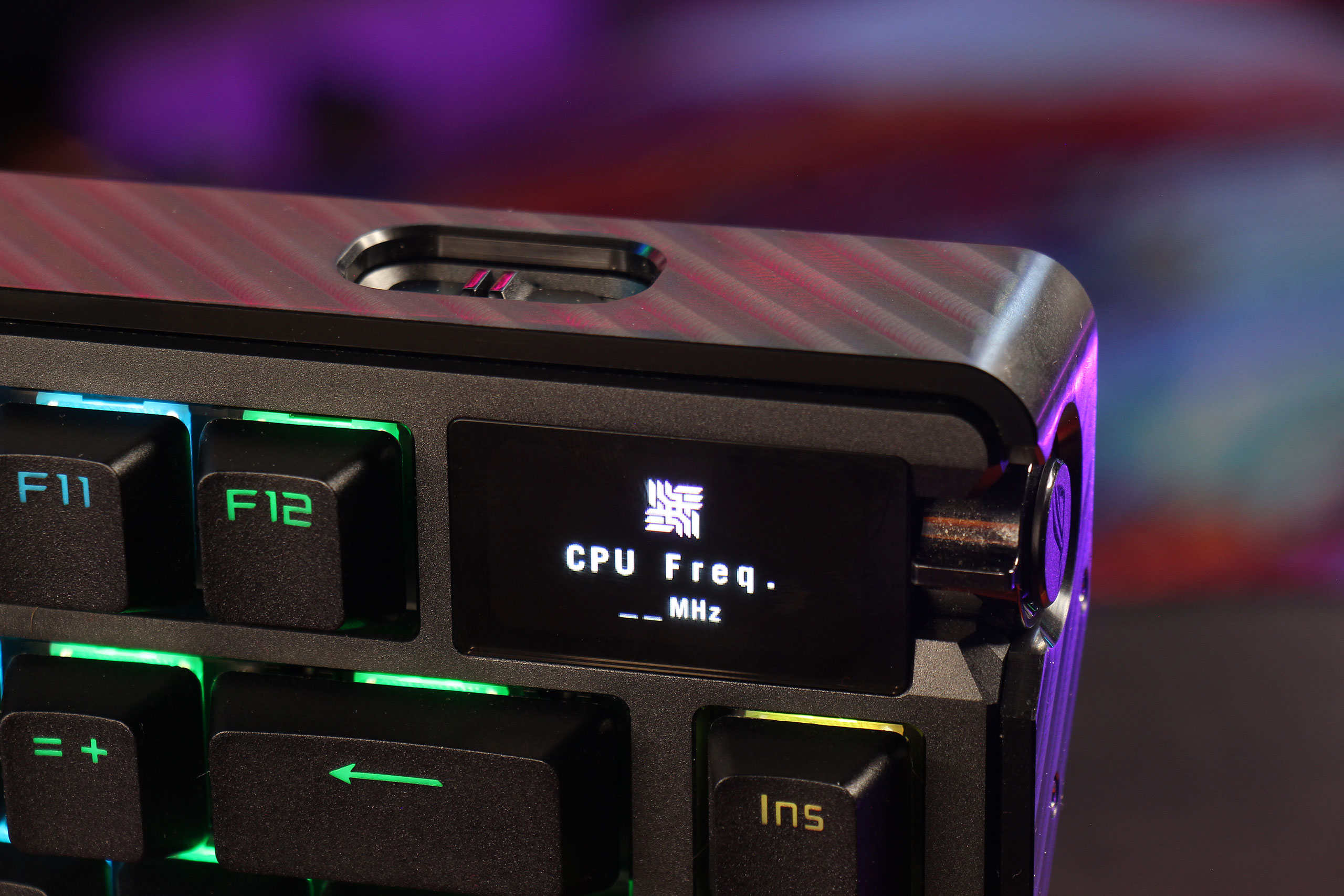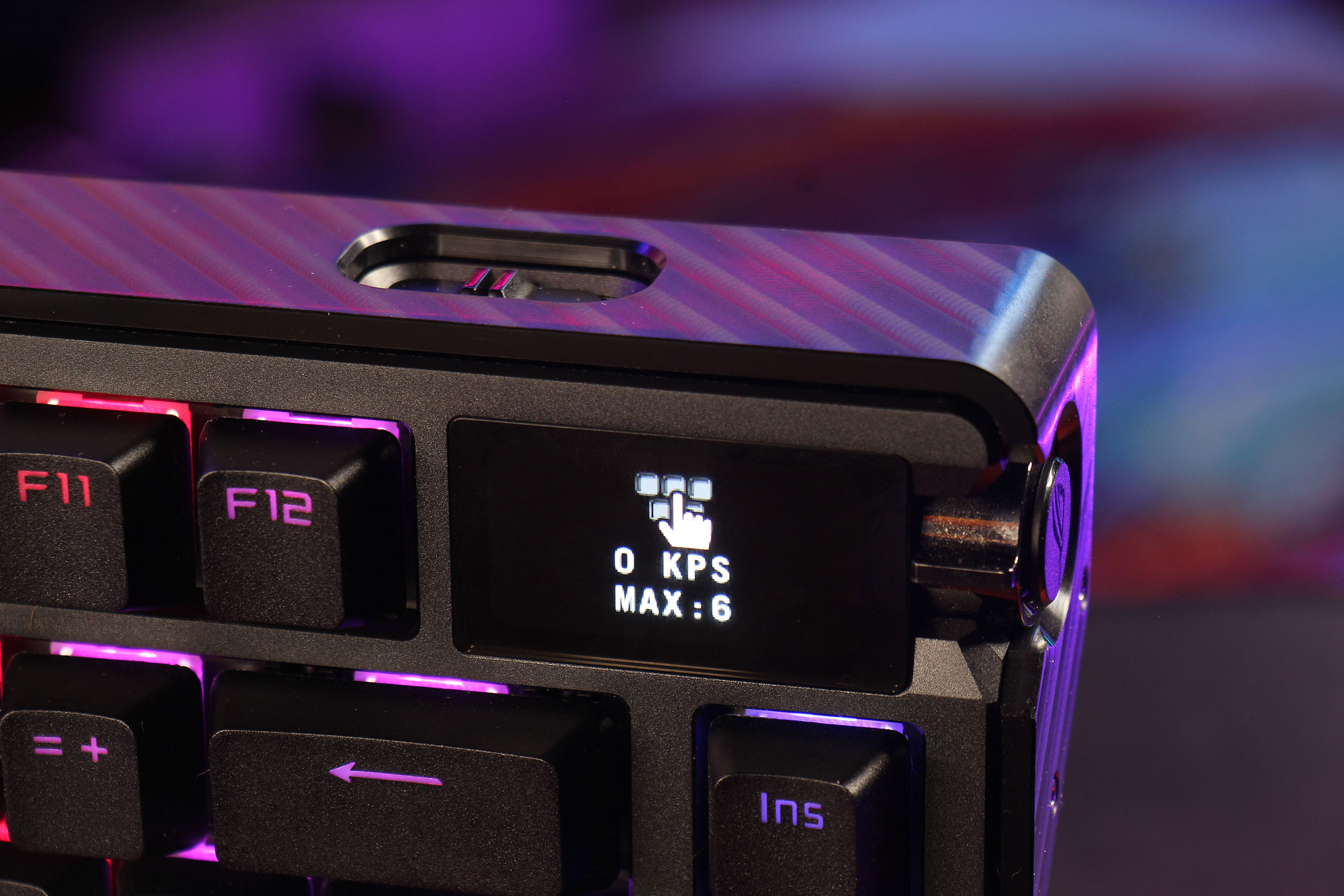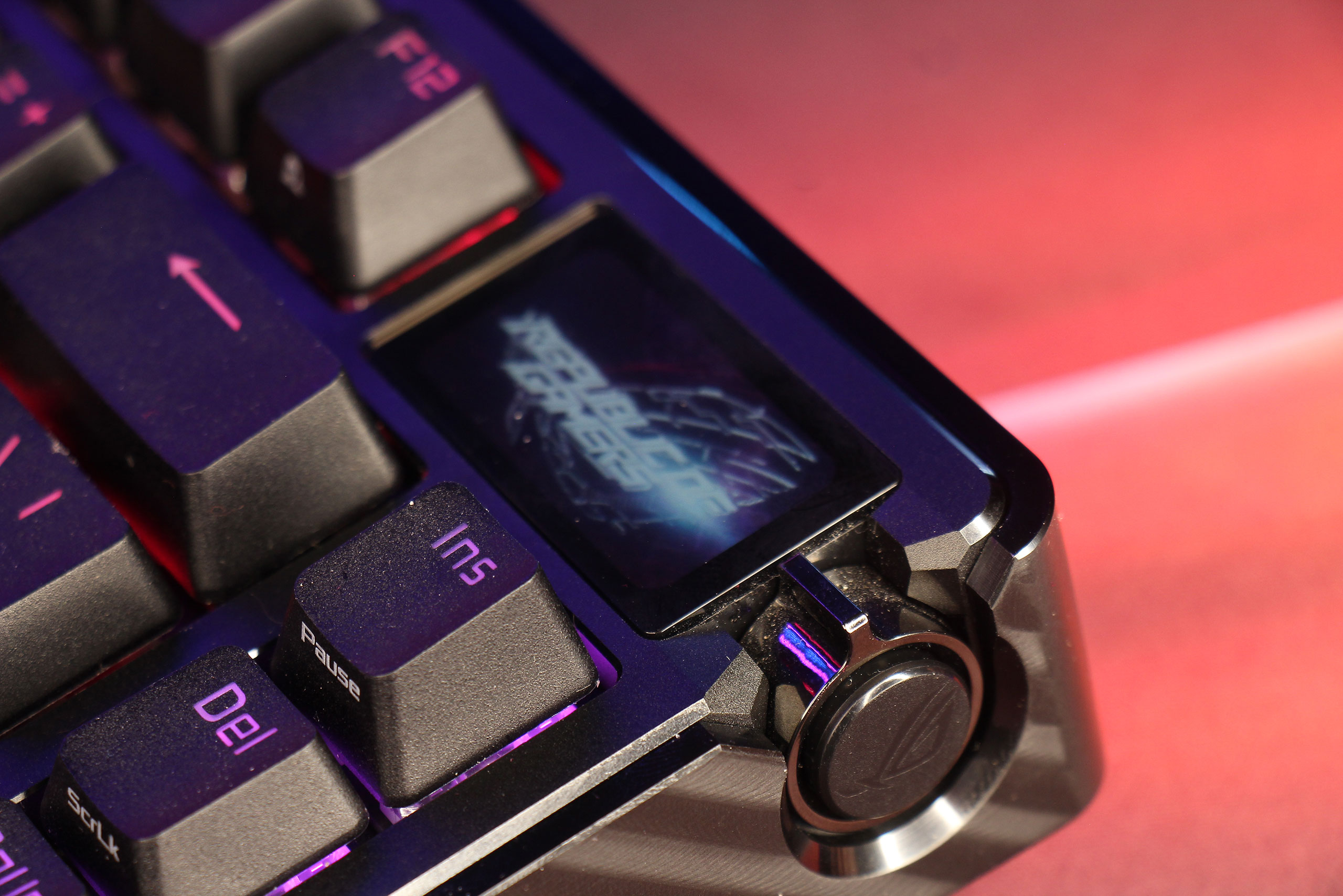 Поруч з дисплеєм розташоване трьохпозиційне коліщатко з додатковою кнопкою, що дозволяє швидко регулювати гучність, яскравість підсвітки, перемикати треки та налаштовувати інші параметри без входу в програмне забезпечення. Взаємодія коліщатка та OLED-екрану робить керування клавіатурою інтуїтивним та зручним навіть при використанні з пристроями, де немає можливості встановити Armoury Crate. Якість виробництва цього елементу можна ставити у приклад тим виробникам, які для роботи подібного коліщатка у своїх клавіатурах застосовують звичайний енкодер коліщатка миші — маючи потужні виробничі можливості, ASUS навіть в цій деталі не зробила жодного компромісу.