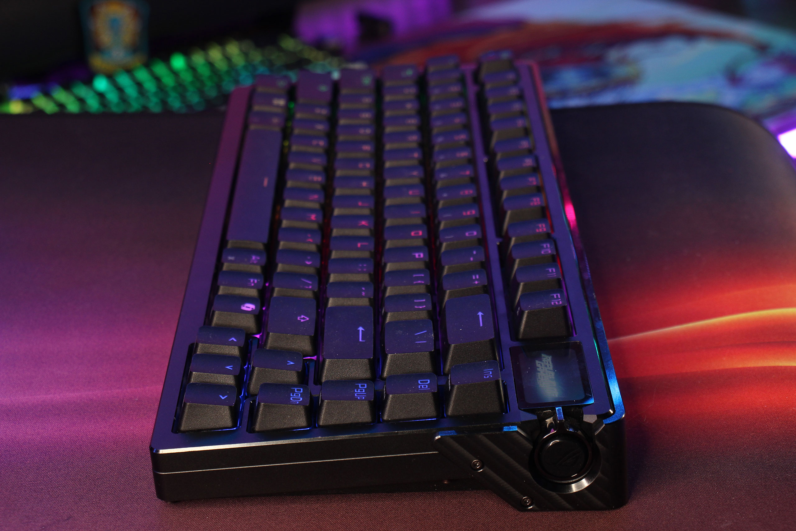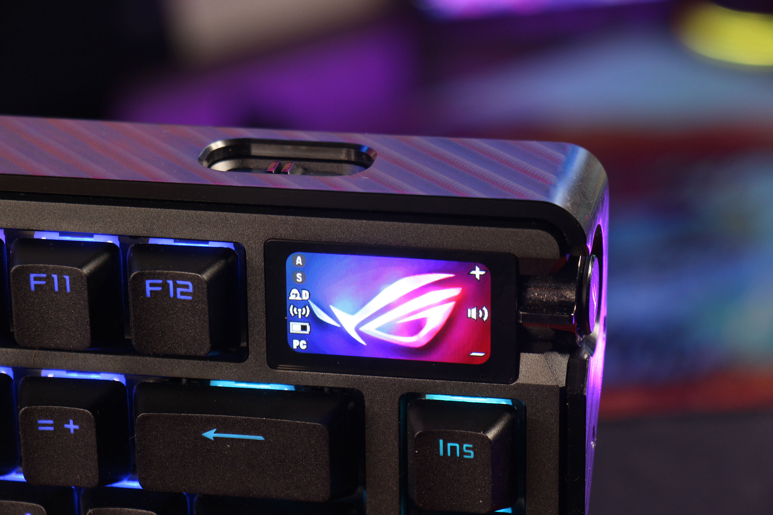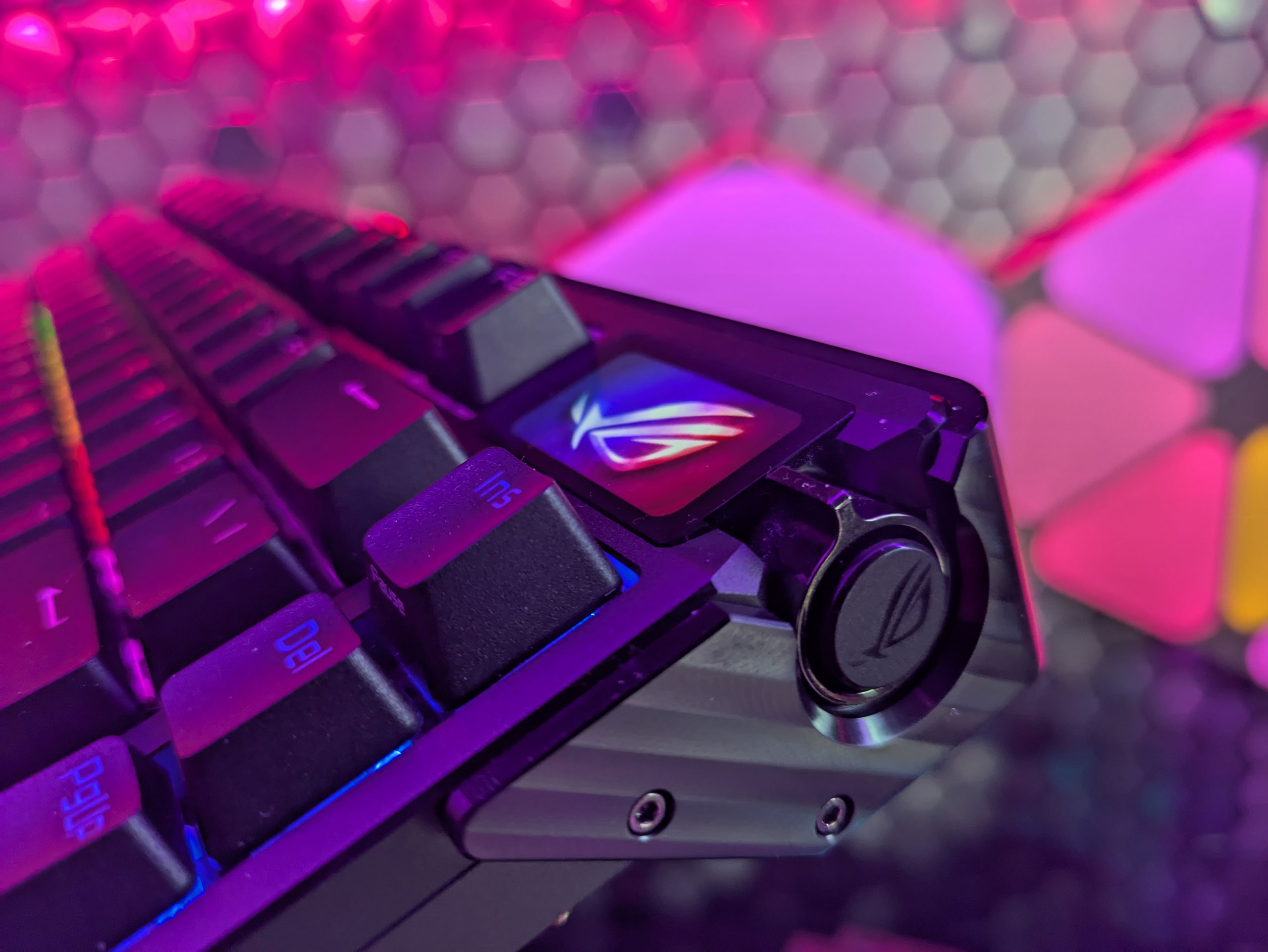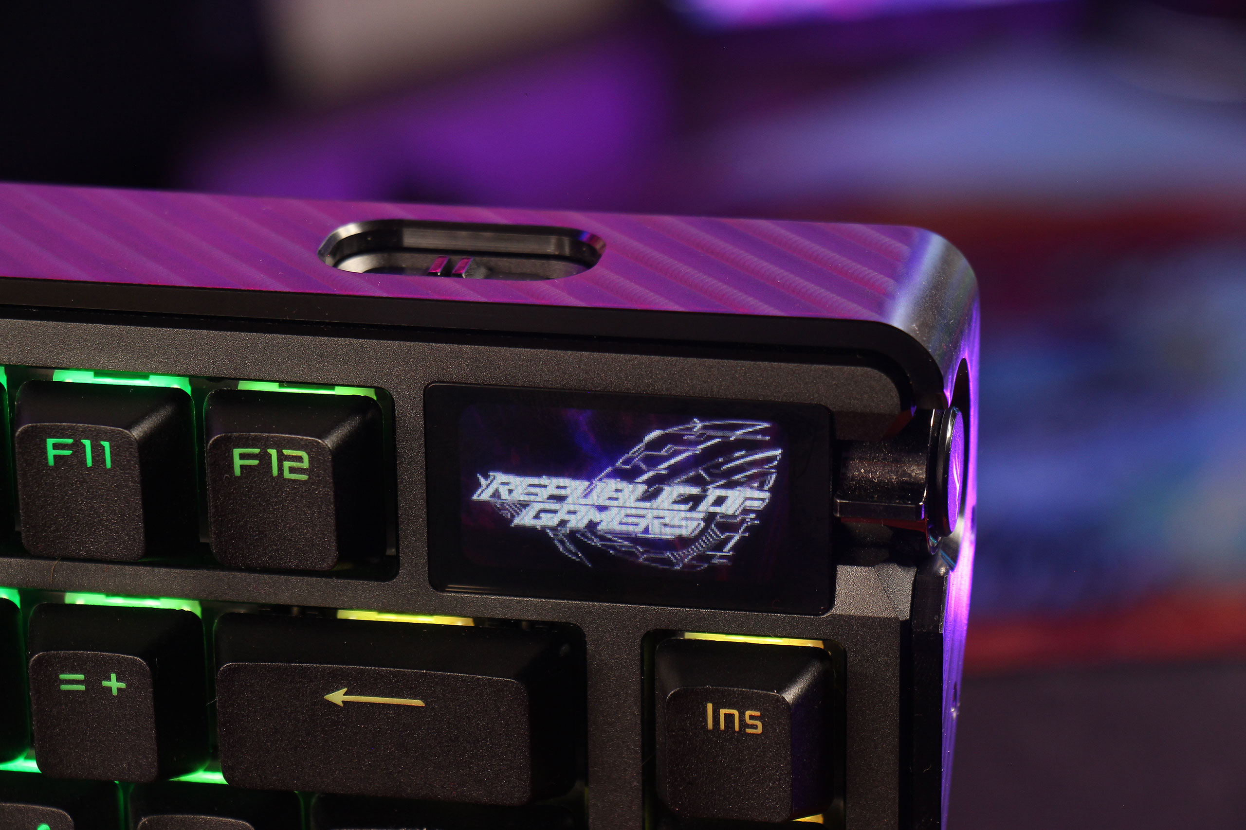 Поруч з дисплеєм розташоване трьохпозиційне коліщатко з додатковою кнопкою, що дозволяє швидко регулювати гучність, яскравість підсвітки, перемикати треки та налаштовувати інші параметри без входу в програмне забезпечення. Взаємодія коліщатка та OLED-екрану робить керування клавіатурою інтуїтивним та зручним навіть при використанні з пристроями, де немає можливості встановити Armoury Crate. Якість виробництва цього елементу можна ставити у приклад тим виробникам, які для роботи подібного коліщатка у своїх клавіатурах застосовують звичайний енкодер коліщатка миші — маючи потужні виробничі можливості, ASUS навіть в цій деталі не зробила жодного компромісу.