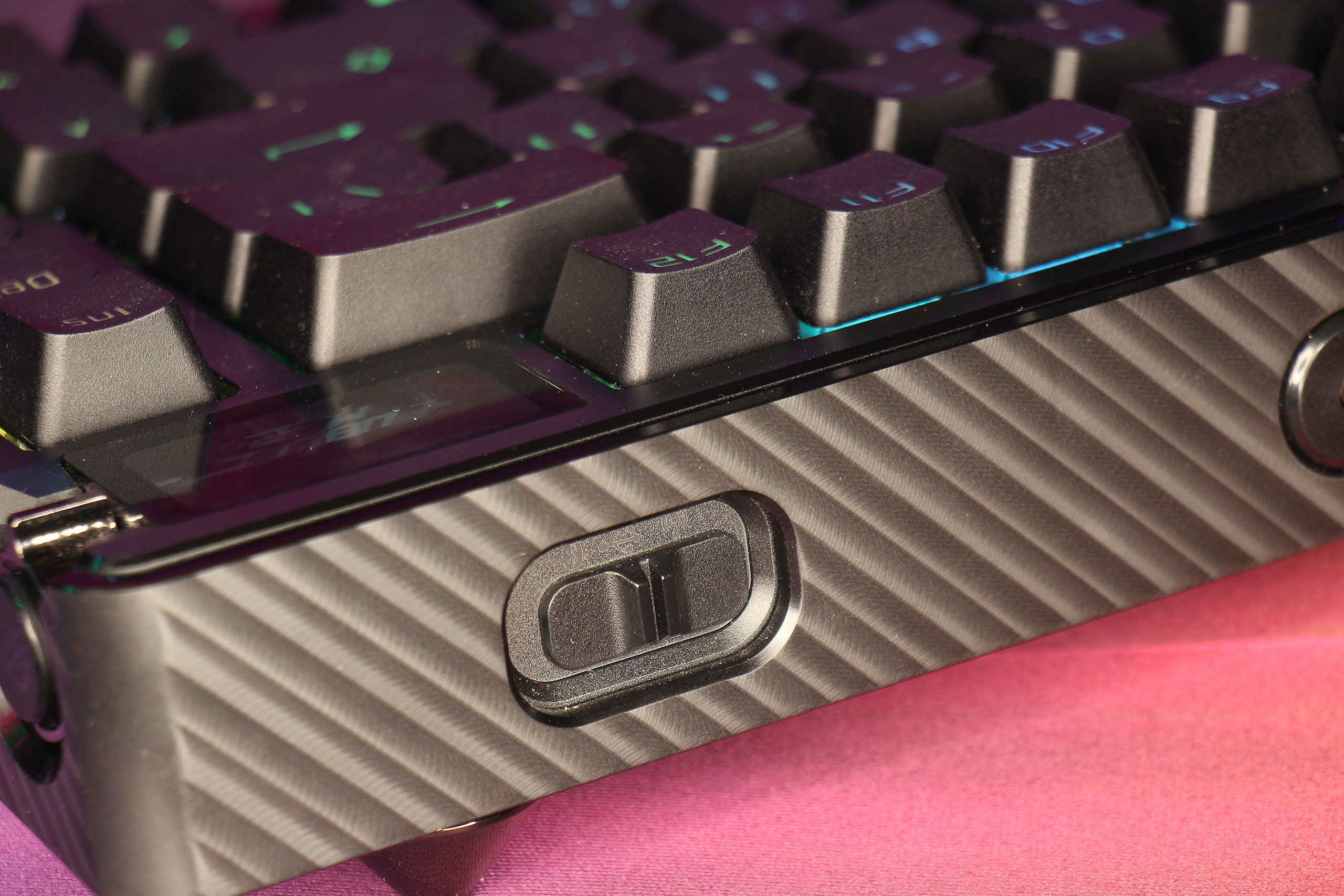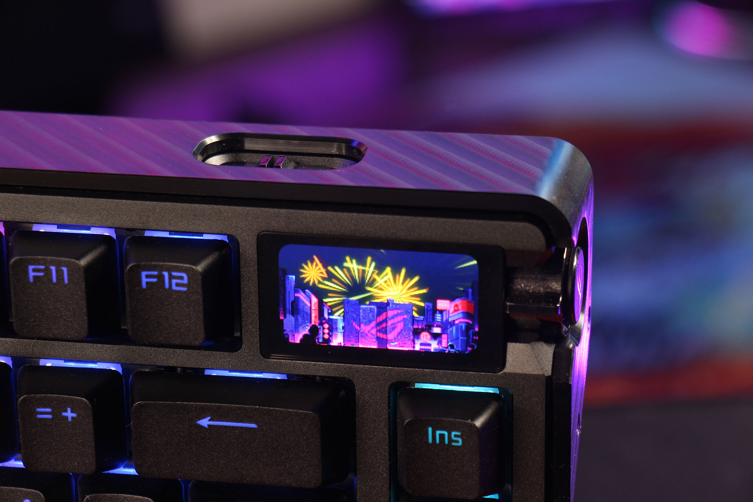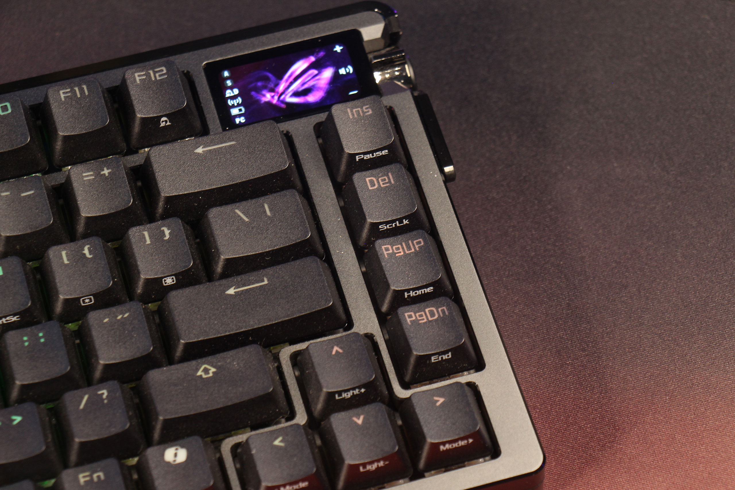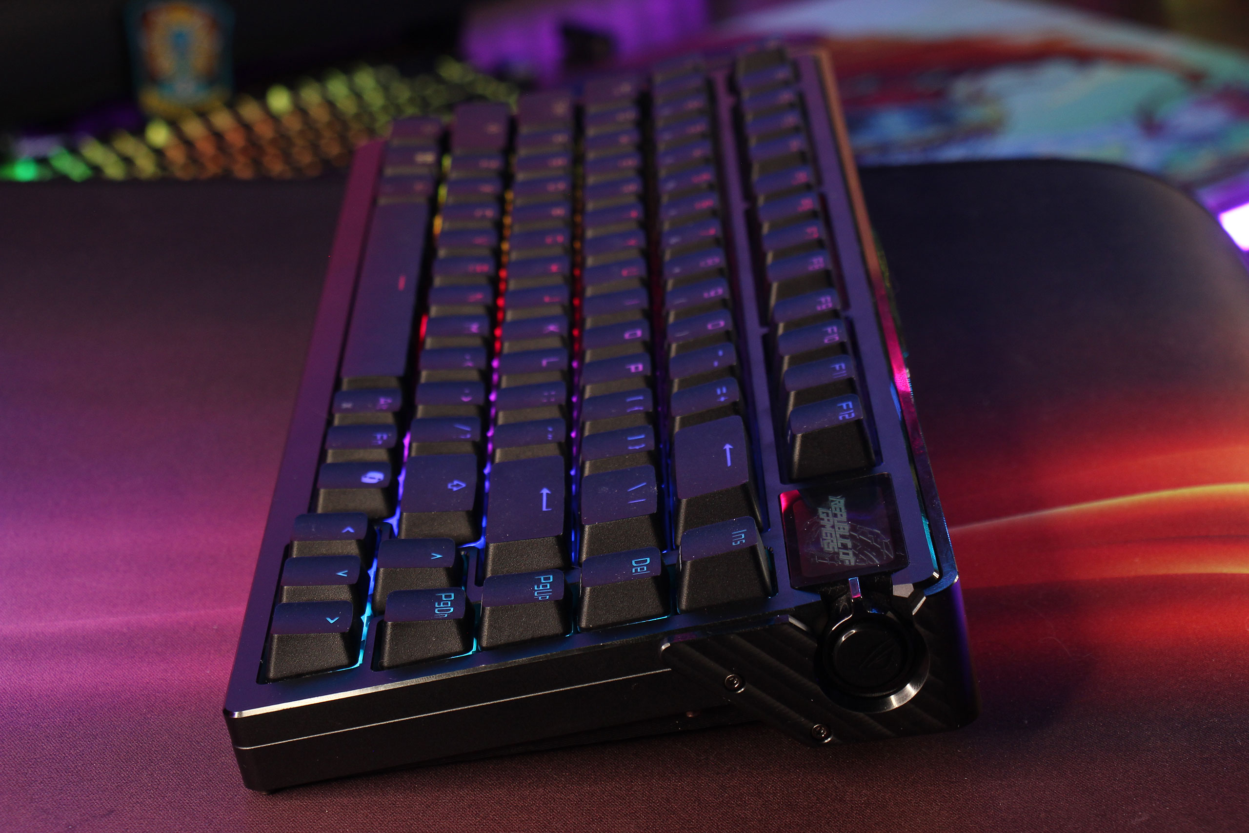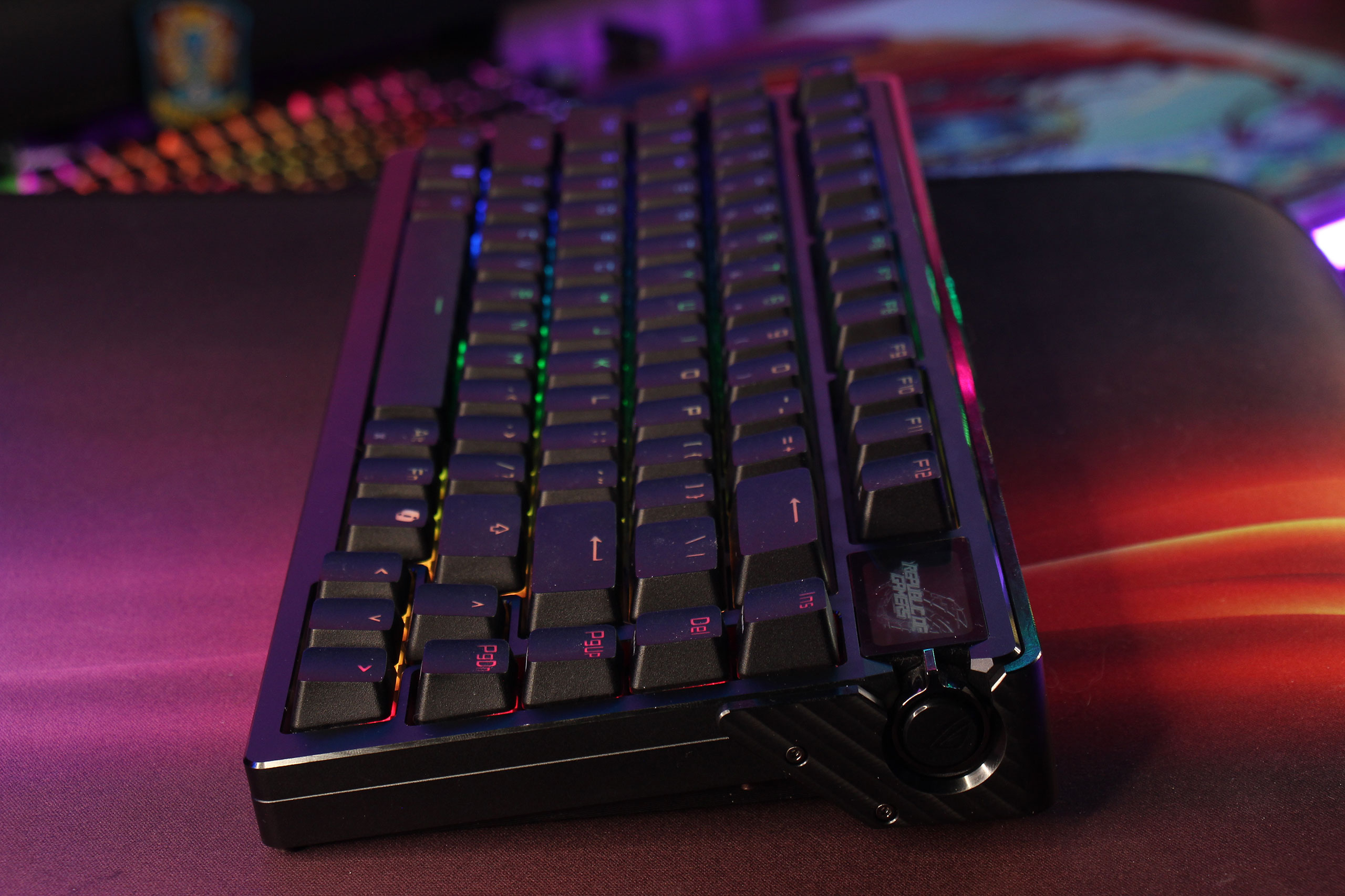 Поруч з дисплеєм розташоване трьохпозиційне коліщатко з додатковою кнопкою, що дозволяє швидко регулювати гучність, яскравість підсвітки, перемикати треки та налаштовувати інші параметри без входу в програмне забезпечення. Взаємодія коліщатка та OLED-екрану робить керування клавіатурою інтуїтивним та зручним навіть при використанні з пристроями, де немає можливості встановити Armoury Crate. Якість виробництва цього елементу можна ставити у приклад тим виробникам, які для роботи подібного коліщатка у своїх клавіатурах застосовують звичайний енкодер коліщатка миші — маючи потужні виробничі можливості, ASUS навіть в цій деталі не зробила жодного компромісу.