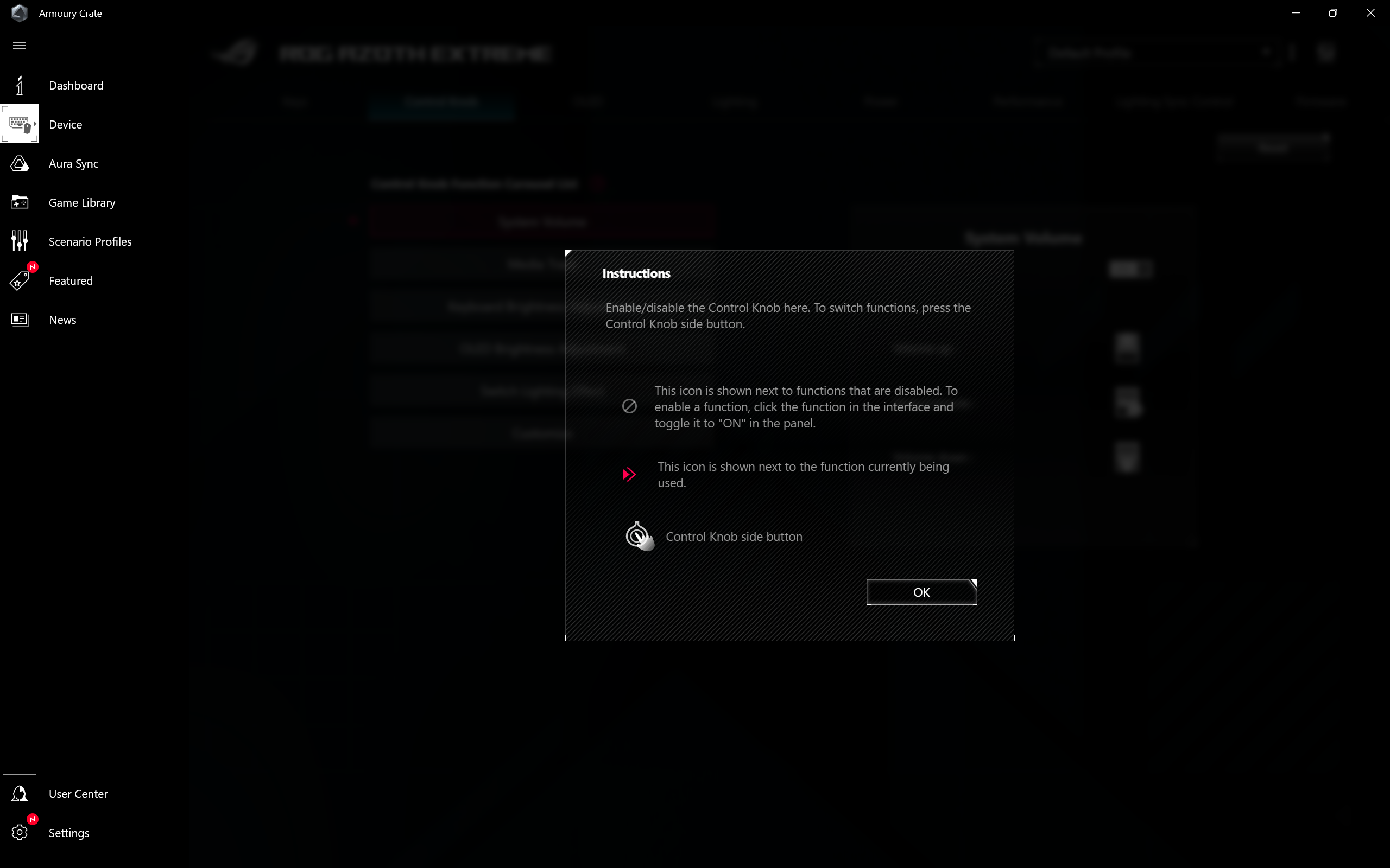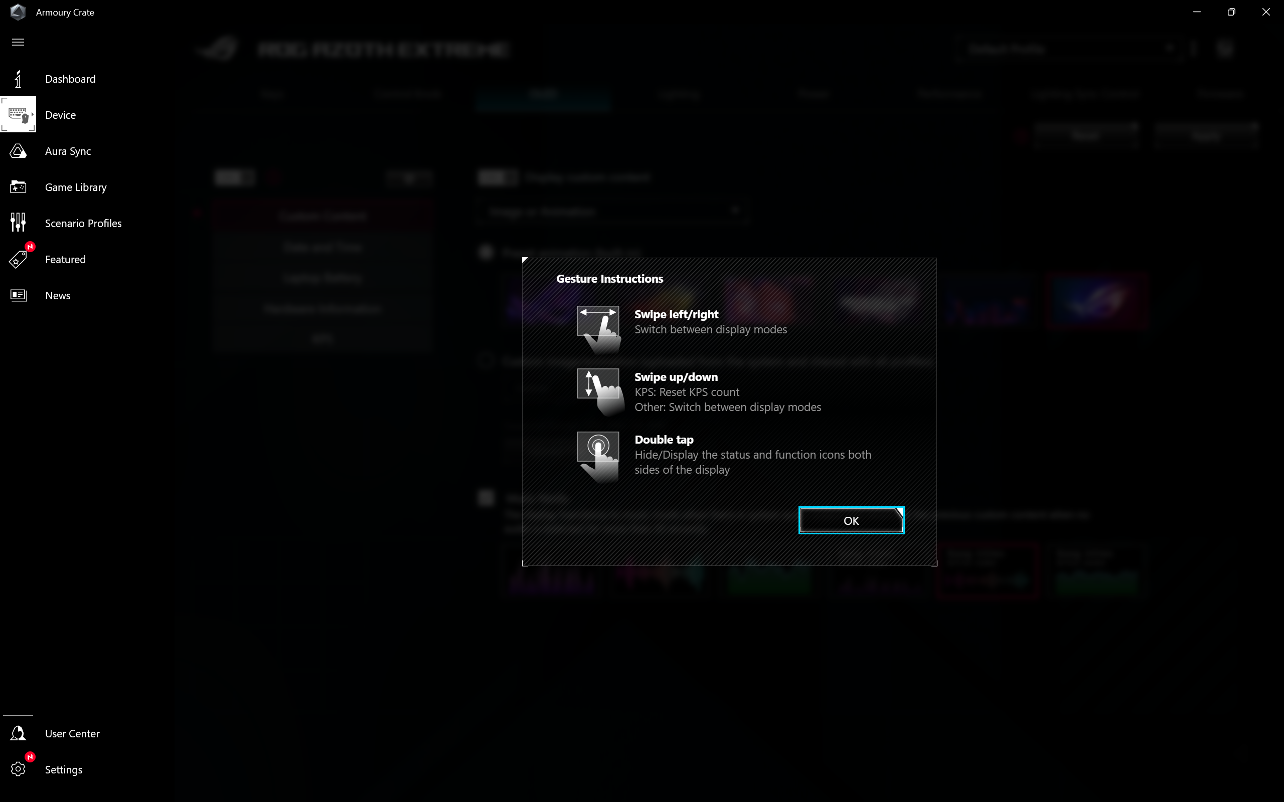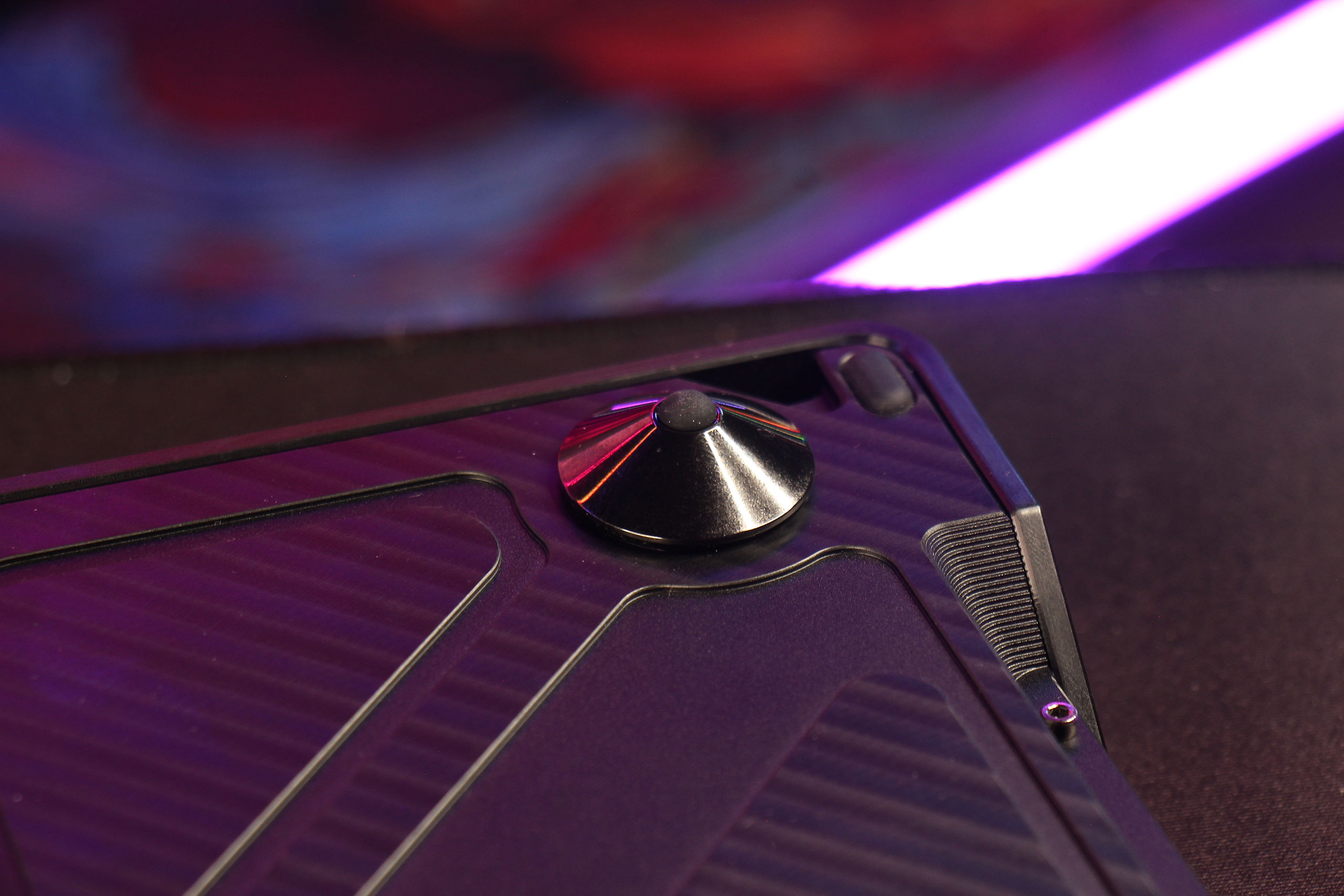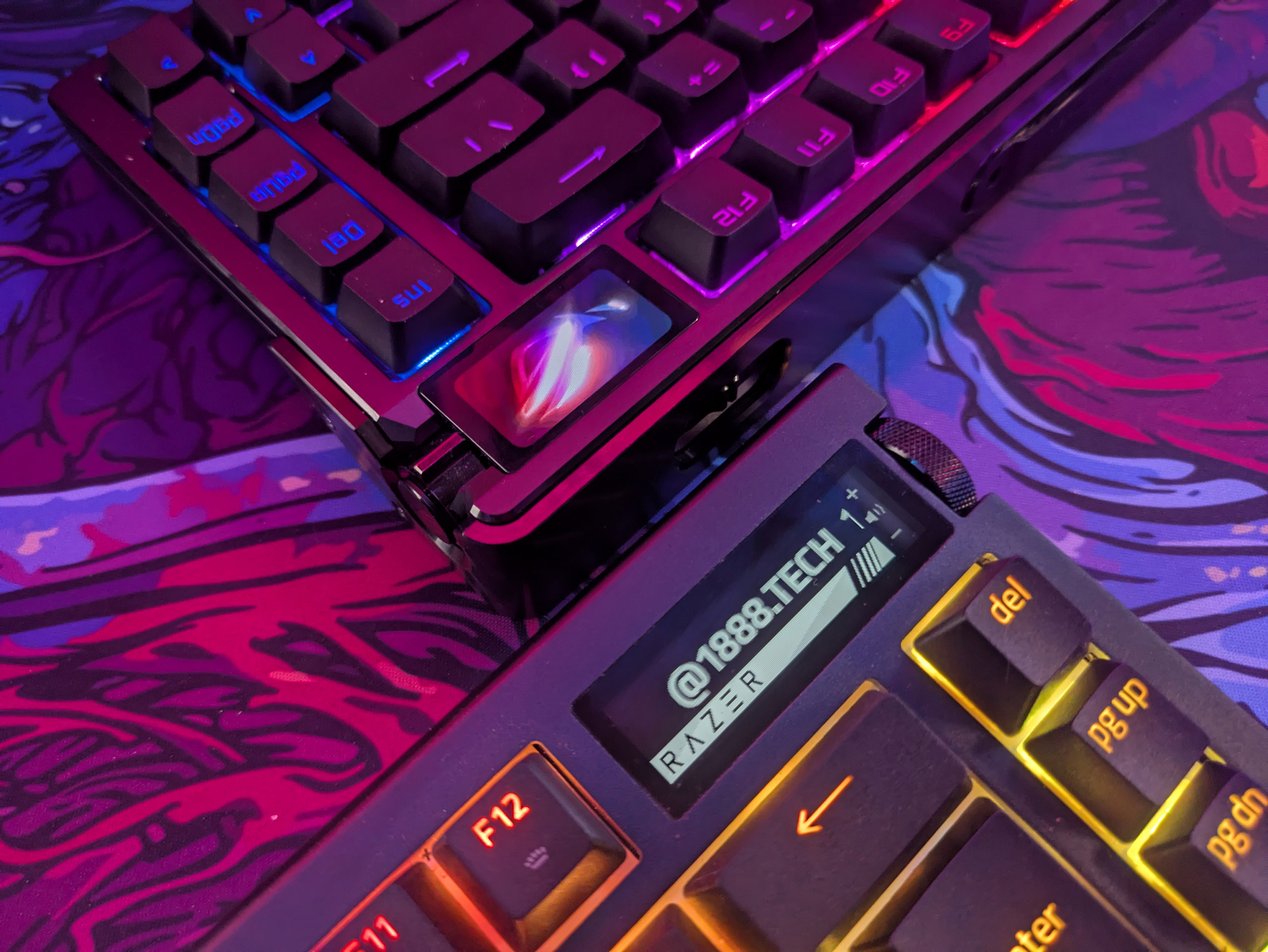 Поруч з дисплеєм розташоване трьохпозиційне коліщатко з додатковою кнопкою, що дозволяє швидко регулювати гучність, яскравість підсвітки, перемикати треки та налаштовувати інші параметри без входу в програмне забезпечення. Взаємодія коліщатка та OLED-екрану робить керування клавіатурою інтуїтивним та зручним навіть при використанні з пристроями, де немає можливості встановити Armoury Crate. Якість виробництва цього елементу можна ставити у приклад тим виробникам, які для роботи подібного коліщатка у своїх клавіатурах застосовують звичайний енкодер коліщатка миші — маючи потужні виробничі можливості, ASUS навіть в цій деталі не зробила жодного компромісу.