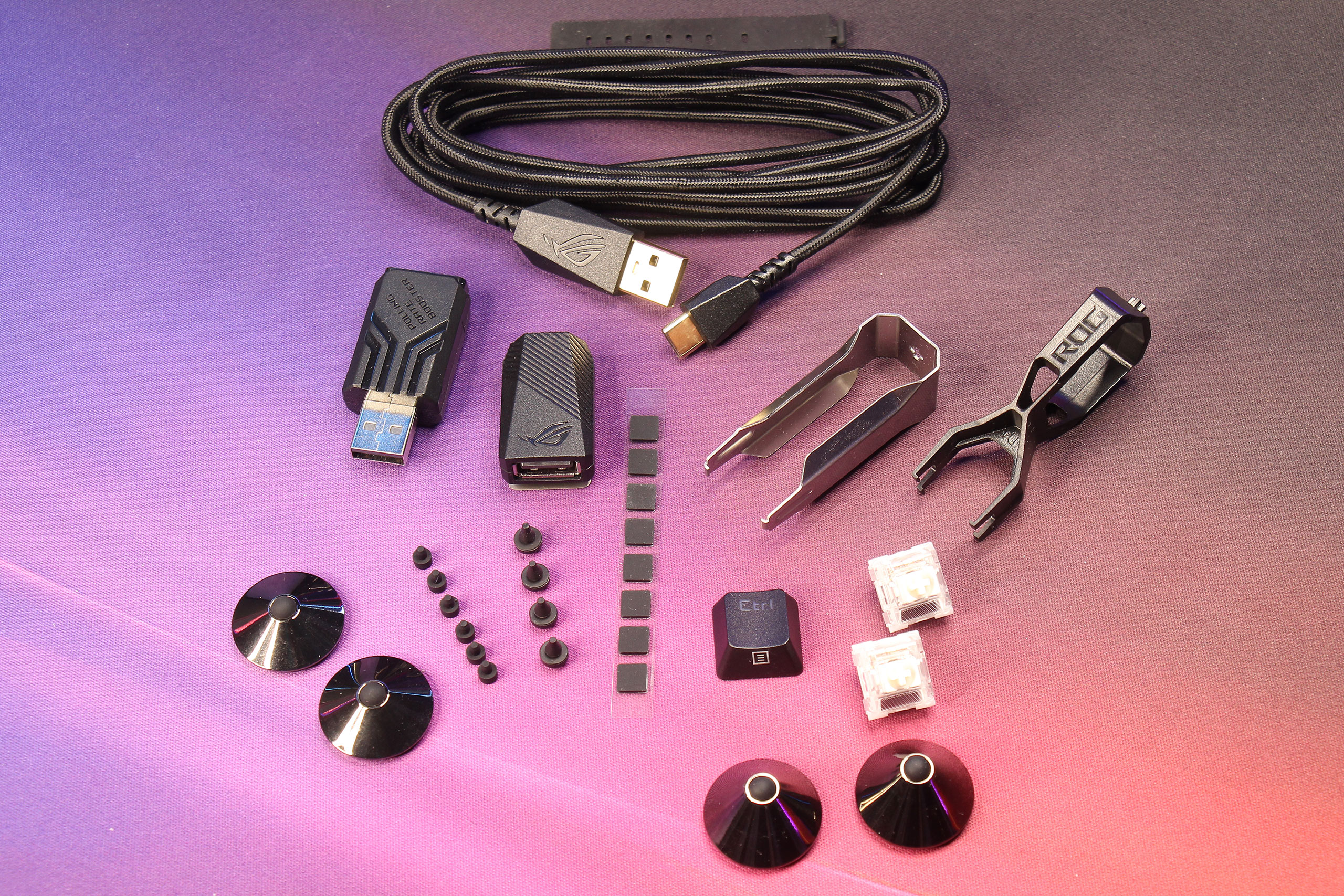Очевидно, що для заміни користувачу доступні будь-які стандартні кейкапи для перемикачів Cherry MX, з двома обмовками: формат 75% вимагає присутність в наборі декількох клавіш нестандартних розмірів/профілів, а для роботи RGB-підсвічування символи повинні просвічуватися. На жаль, досі на українському ринку вибір кейкапів з урахуванням обох вимог жахливо вузький, хоча це точно не провина ASUS…