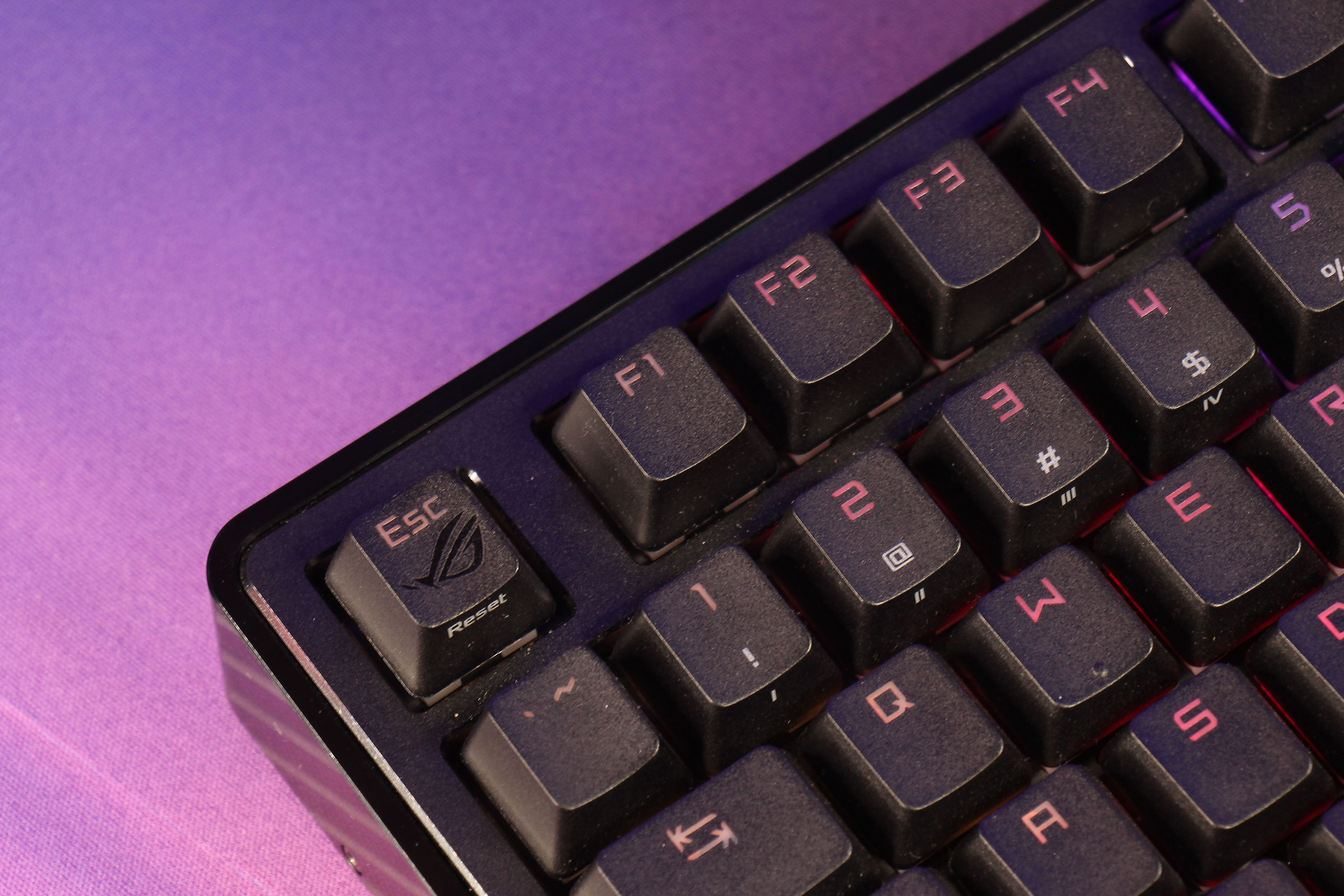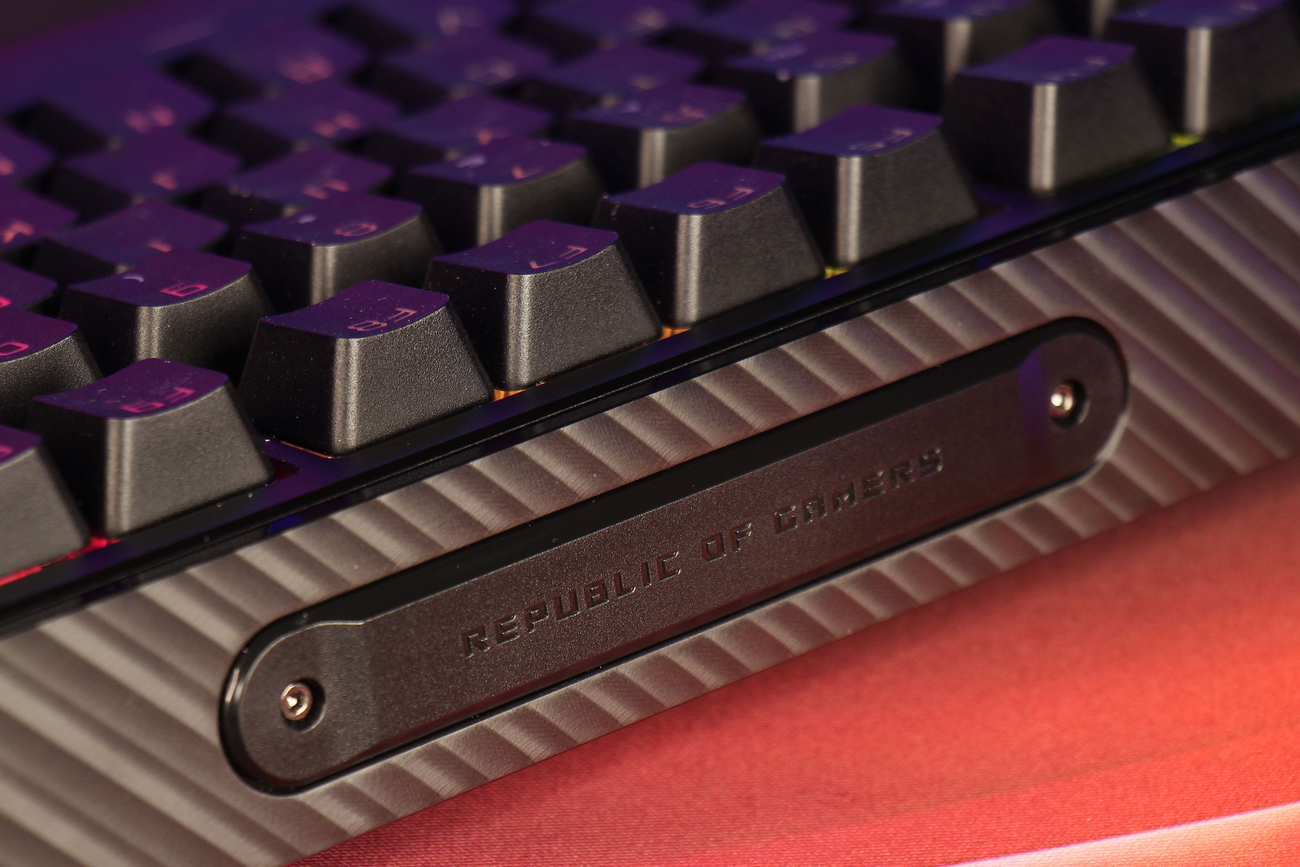 Текстура поверхні кейкапів агресивніша за звичайну, що забезпечує краще зчеплення з пальцями. Англомовні легенди розміщені по центру верхньої частини клавіш та відмінно пропускають світло завдяки North-facing орієнтації світлодіодів RGB-підсвітки. Вторинні функції клавіш нанесені або знизу основного символу, або на фронтальній частині кейкапа. Вперше в нас на тесті окрема клавіатура (не в складі ноутбука), яка має клавішу Copilot — праворуч від Fn. На клавіші Escape додатково нанесена емблема серії ROG. Оскільки на тесті в нас інженерний зразок, то ніяких висновків про україномовні легенди зробити не можна.