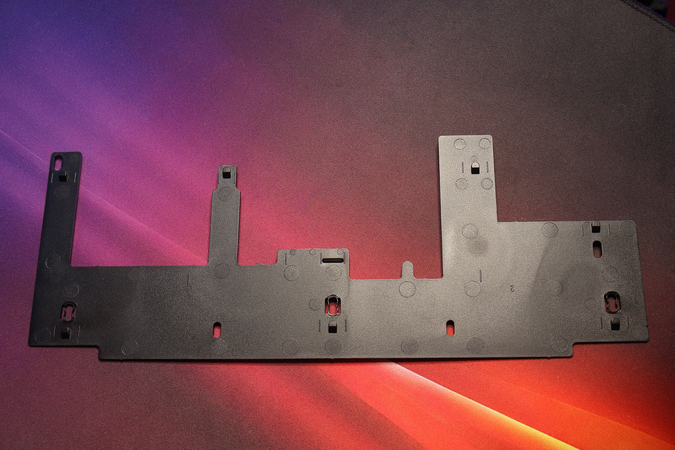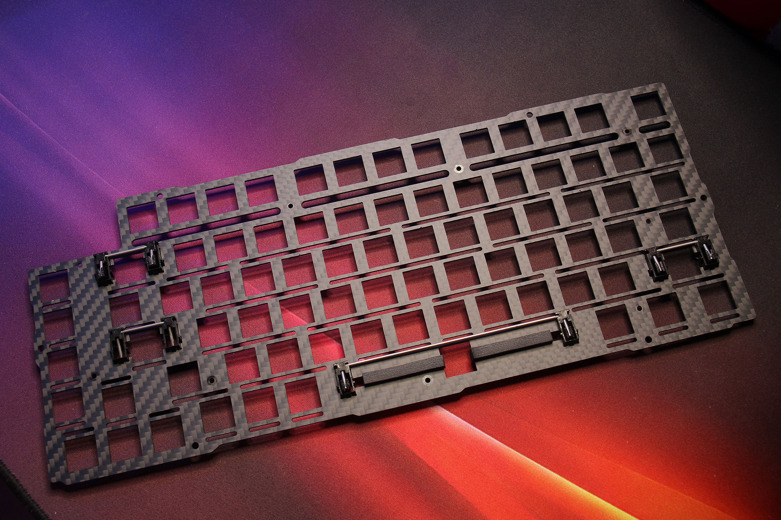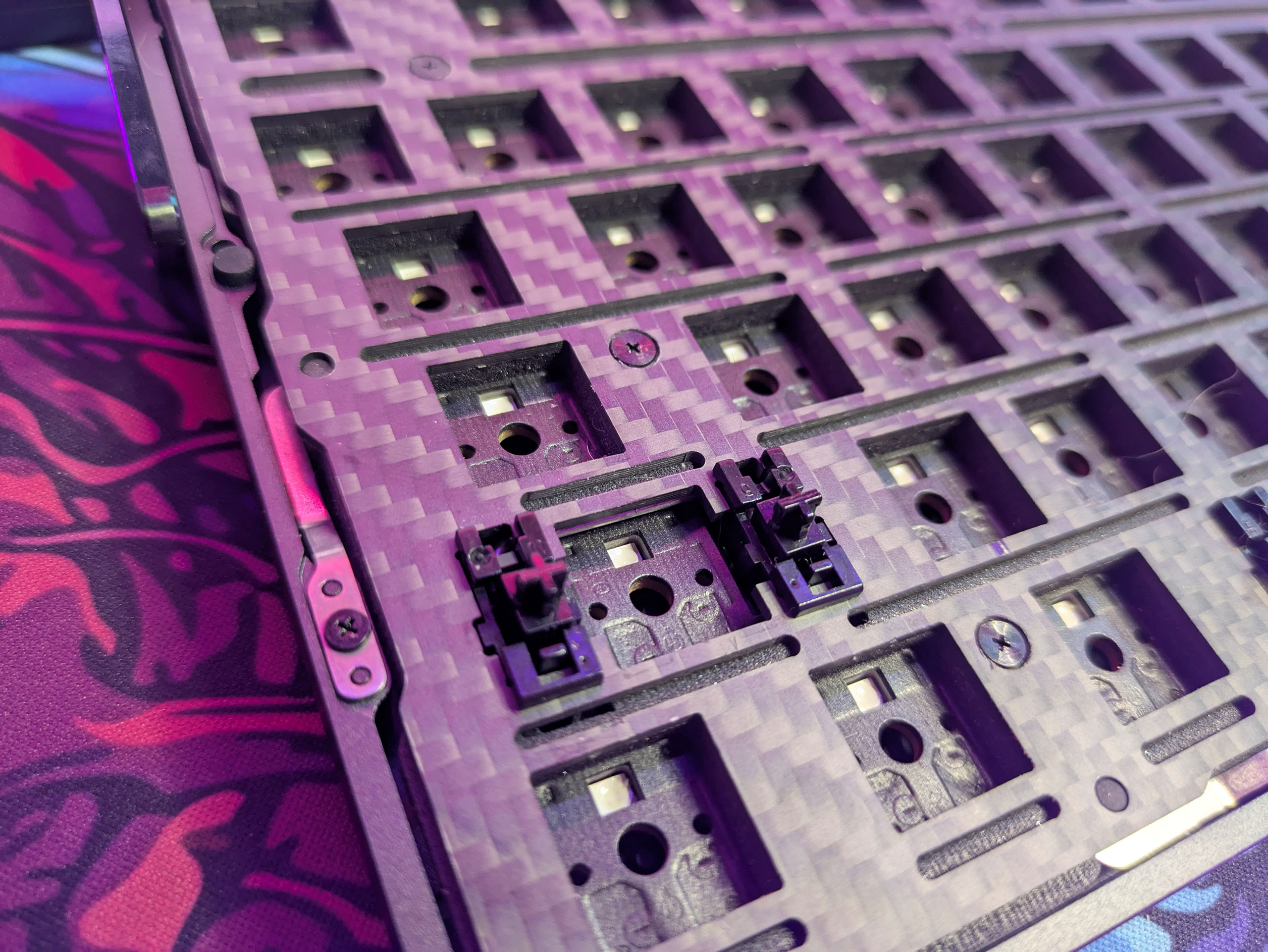 Першим бачимо карбоновий плейт, до якого кріпляться перемикачі. Вибір карбону як матеріалу — це не просто данина моді. При жорсткості, що не поступається металу, карбонове волокно має кращі характеристики поглинання вібрацій та створює особливий акустичний профіль при тайпінгу.