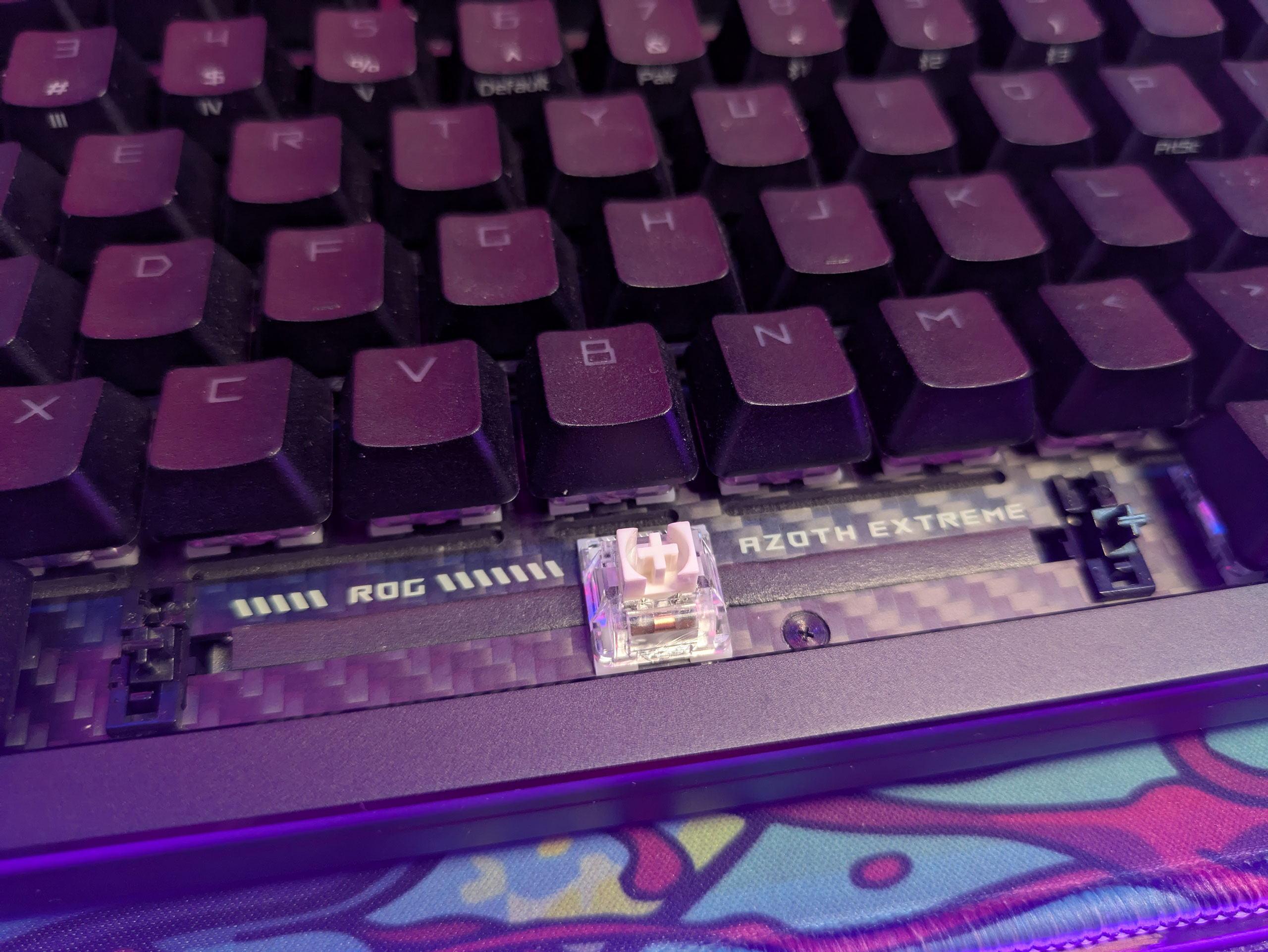 ROG Azoth Extreme комплектується на вибір двома типами фірмових перемикачів: лінійними ROG NX Snow або клікаючими ROG NX Storm. В нашому тестовому зразку встановлені ROG NX Snow — одні з найкращих лінійних перемикачів, що нам доводилося тестувати (вони вже були на огляді у складі ASUS ROG Strix Scope II 96 Wireless). Вони мають таку специфікацію: