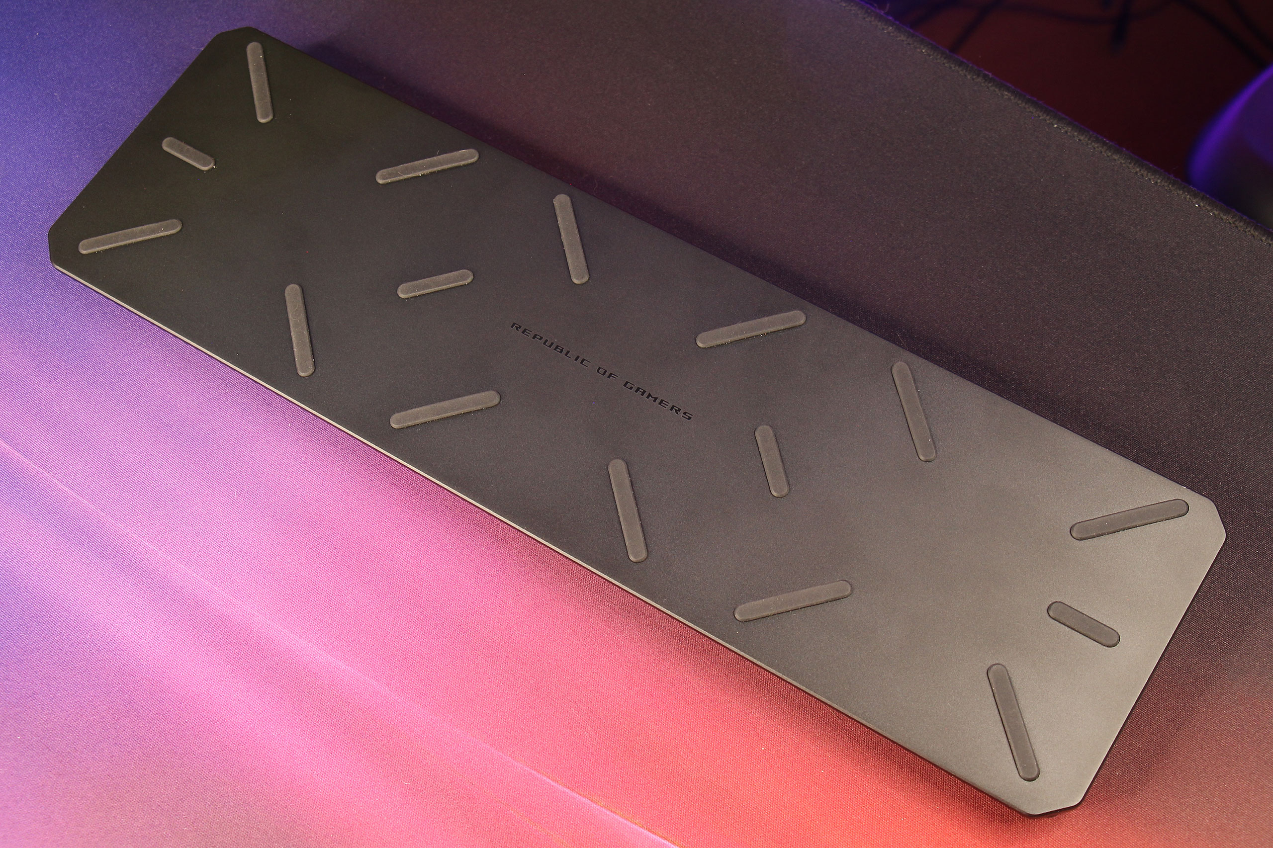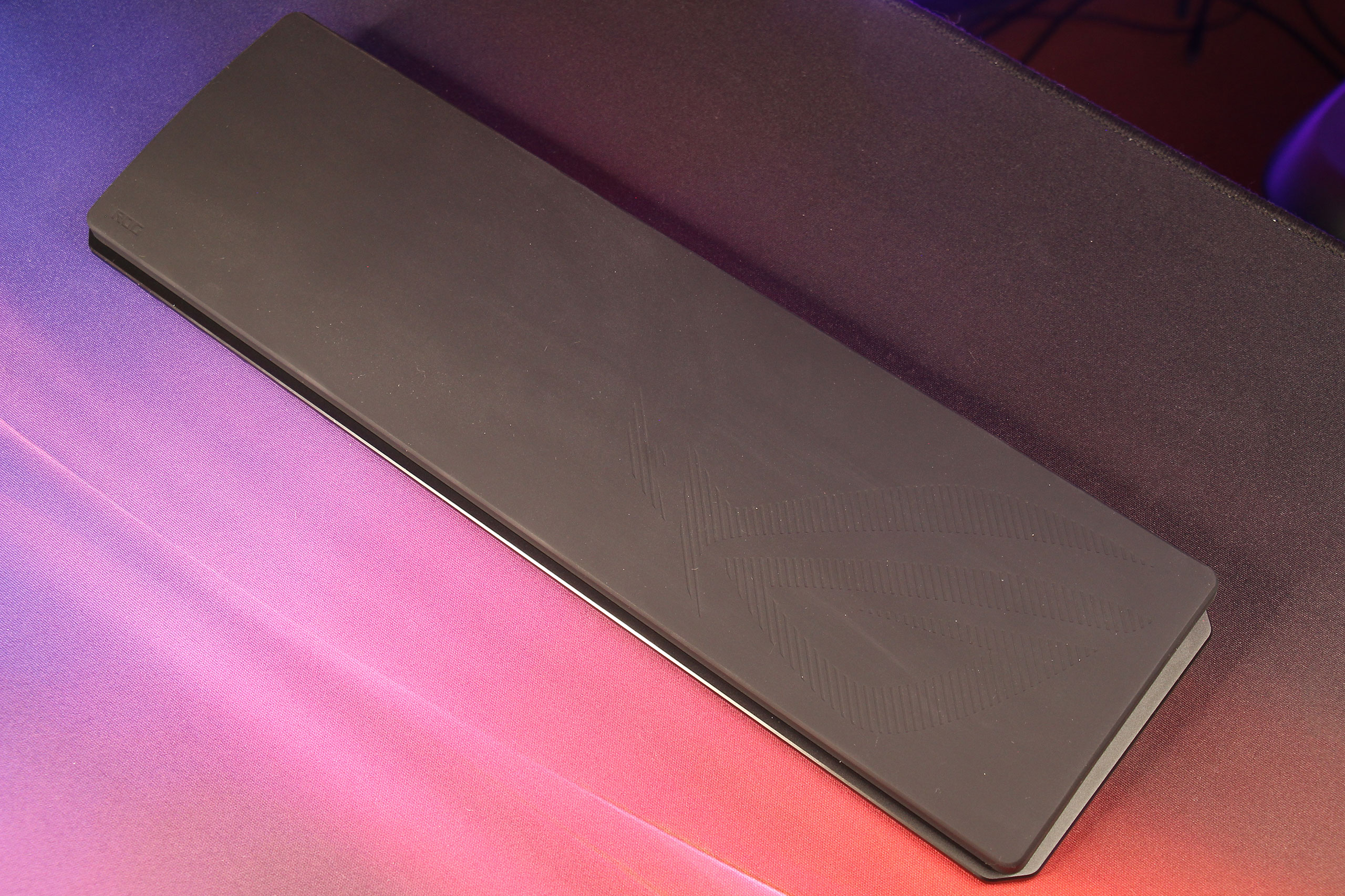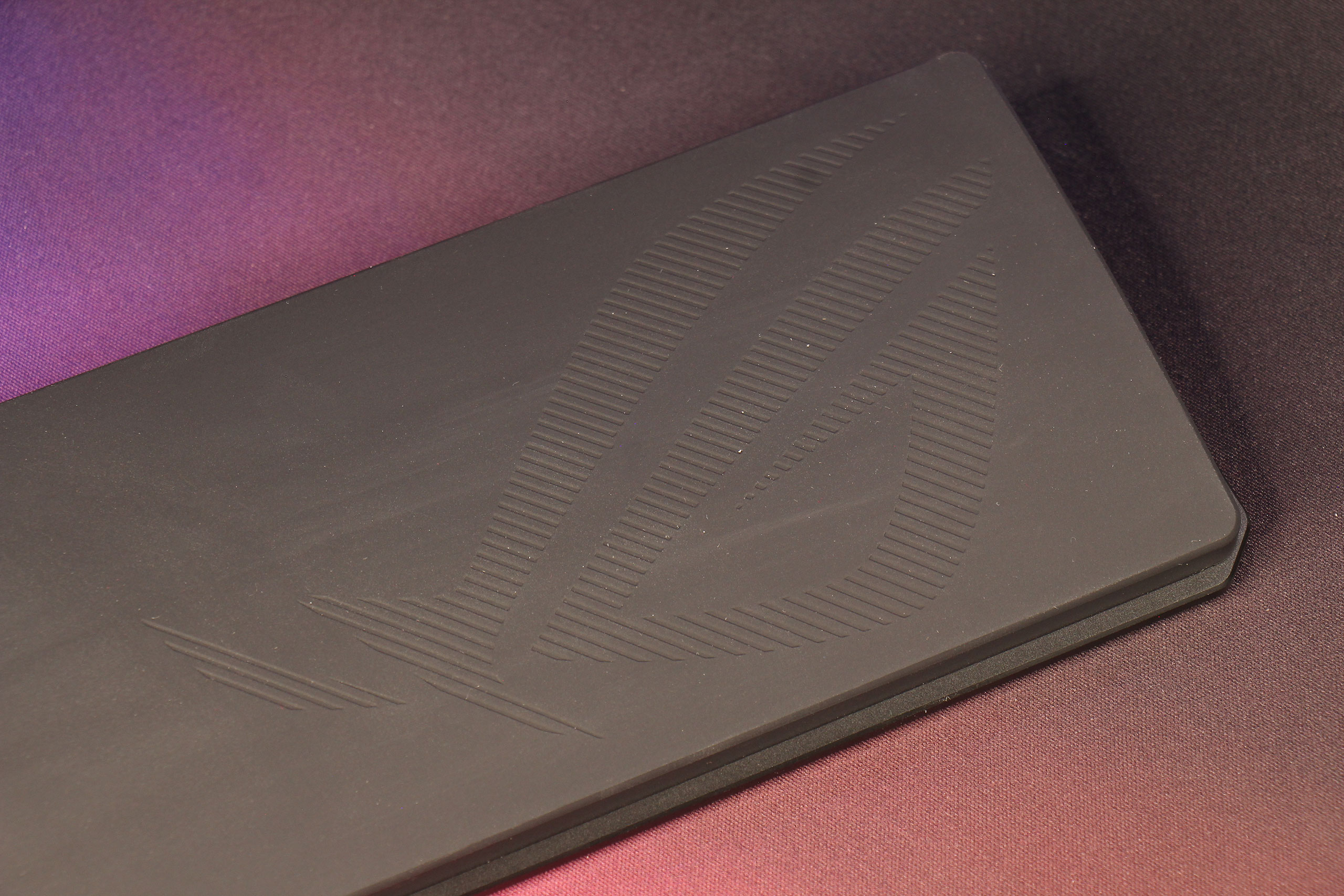 Інженери ASUS створили також цікаву конструкцію підставки під зап'ястя. Зовнішній шар виконано з високоякісного силікону преміумкласу зі спеціальною текстурою, що забезпечує оптимальне зчеплення та (в теорії) легко очищується від забруднень. На практиці, як виявилося, силікон добре працює пилобрудозбірником — витерти все не дуже складно, але порівняно з менш цупкими матеріалами все ж таки вимагає зусиль.