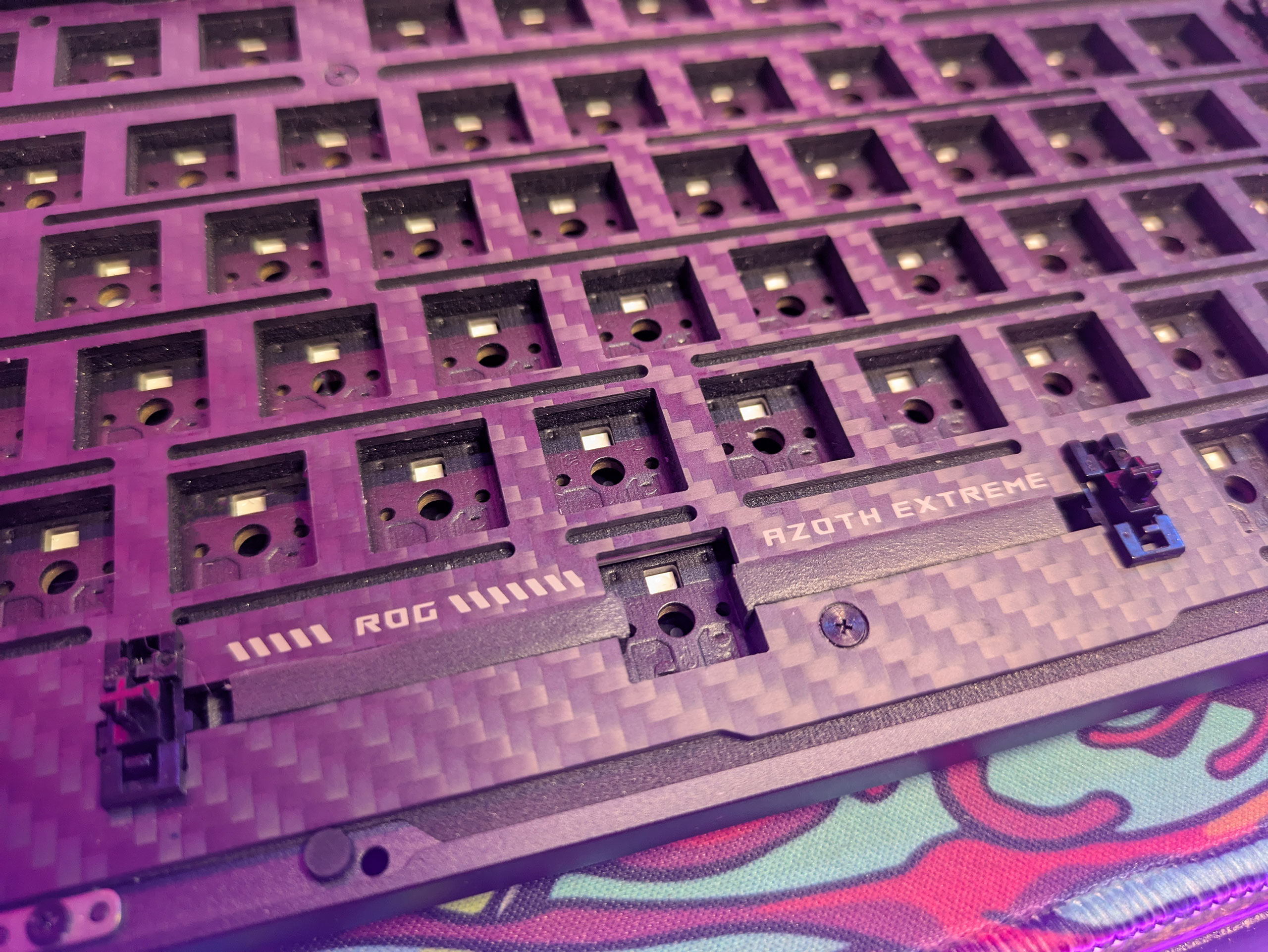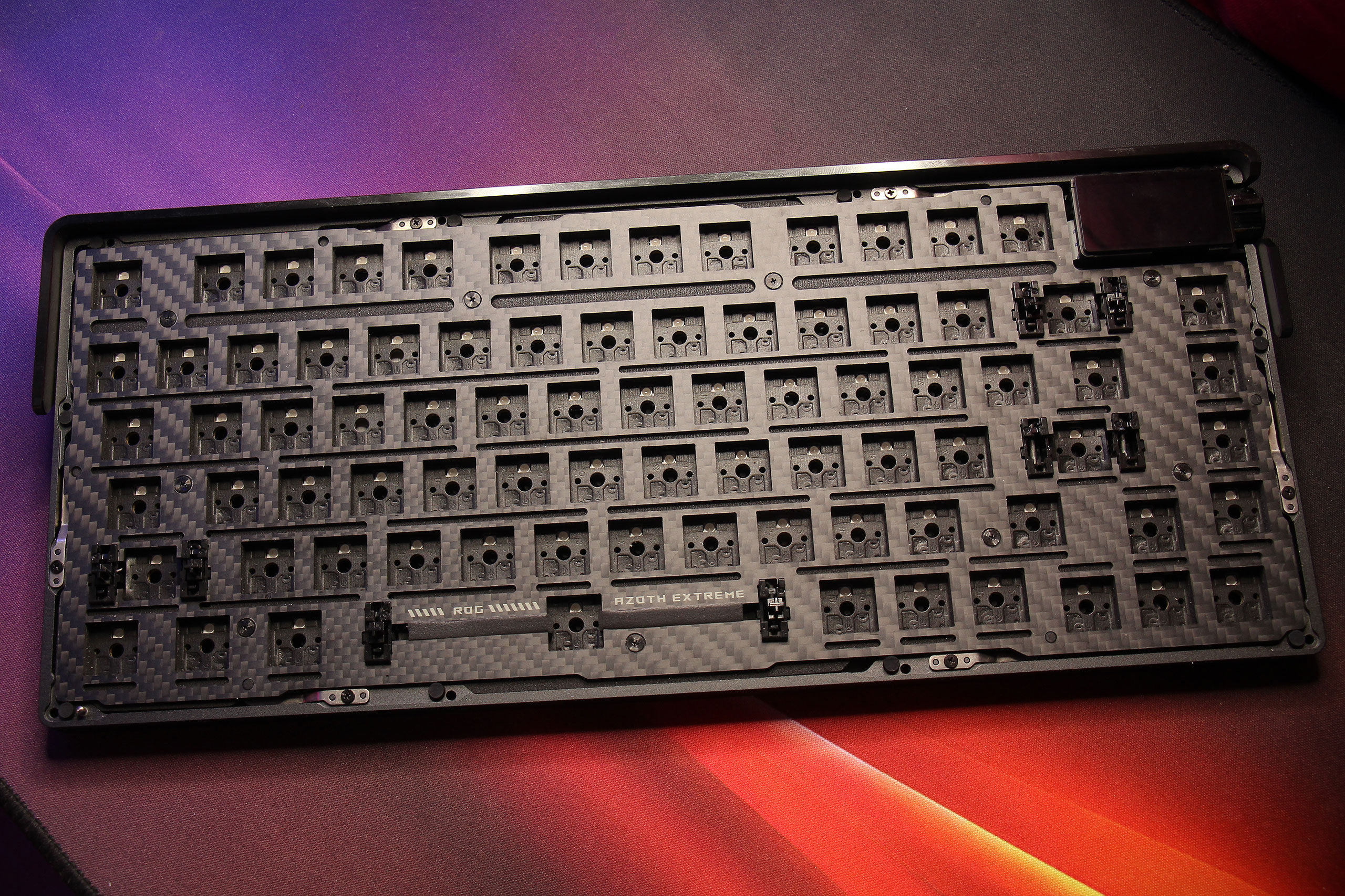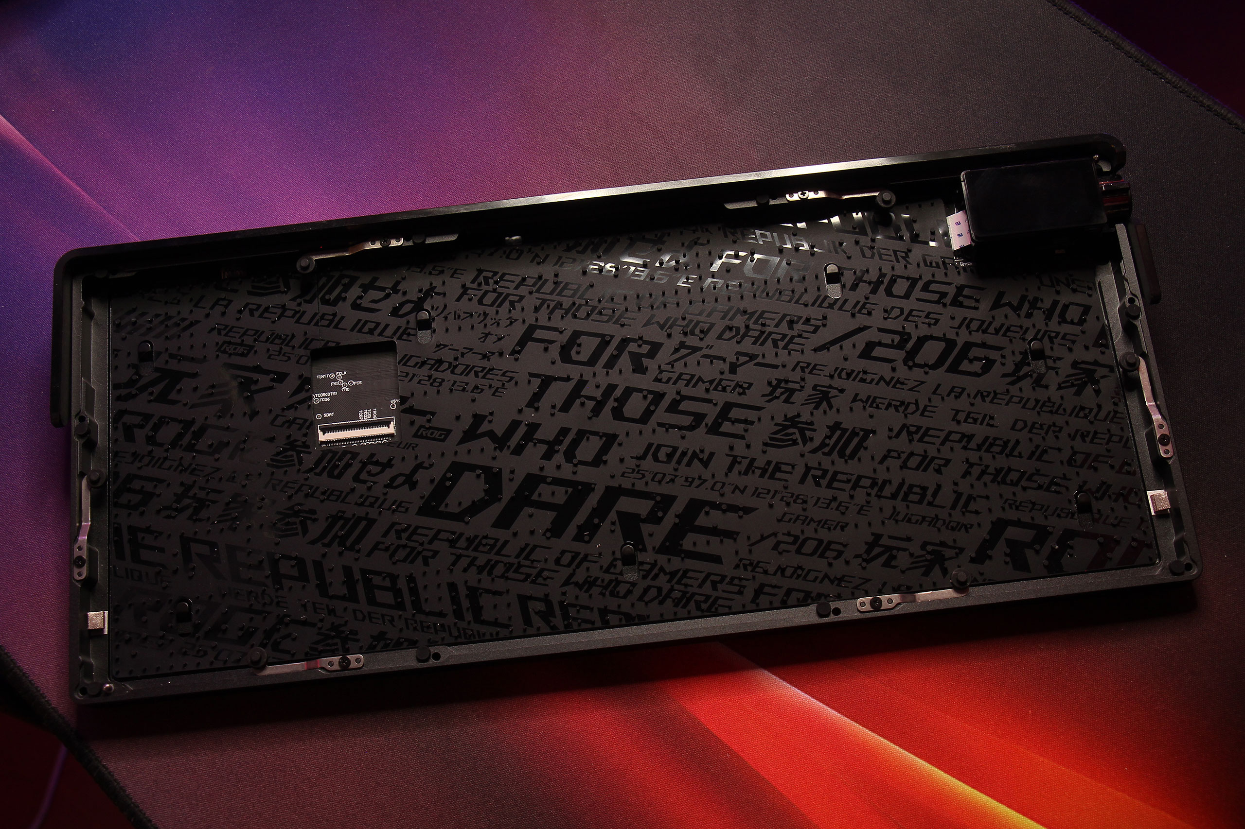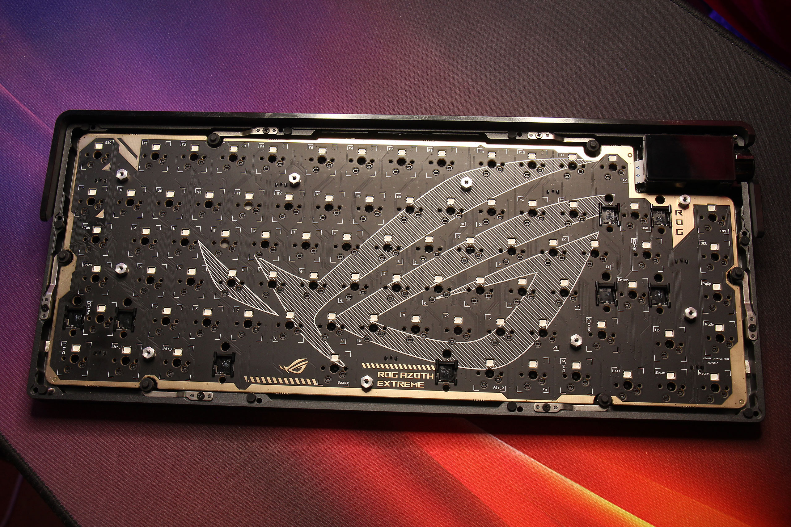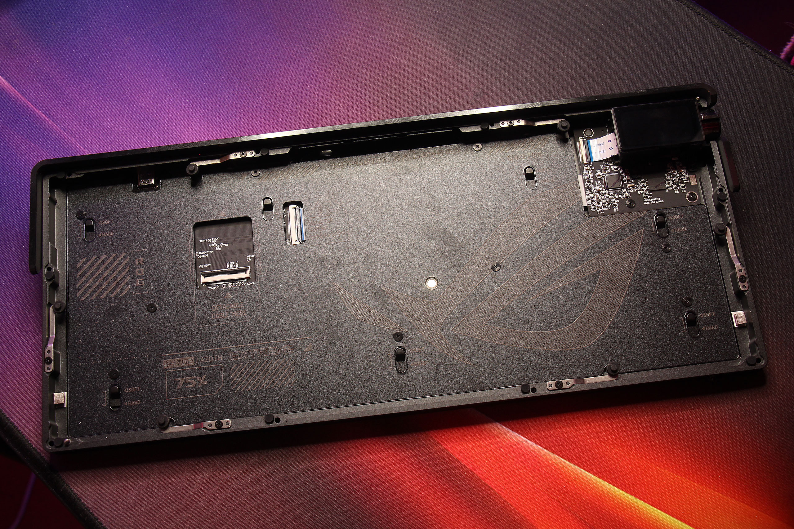 Внутрішня архітектура ROG Azoth Extreme демонструє надзвичайну увагу до деталей та промисловий підхід до реалізації ентузіастських концепцій. При цьому, на відміну від більшості клавіатур преміумкласу, де розбирання часто потрібне для модифікацій (а часто для початку потрібно ще й збирання зі стану «баребону»), тут ASUS подбала про те, щоб користувач отримав максимум можливостей без втручання у внутрішню конструкцію. Проте, розібрати її дуже цікаво, для чого достатньо відкрутити півтори десятки гвинтиків знизу.