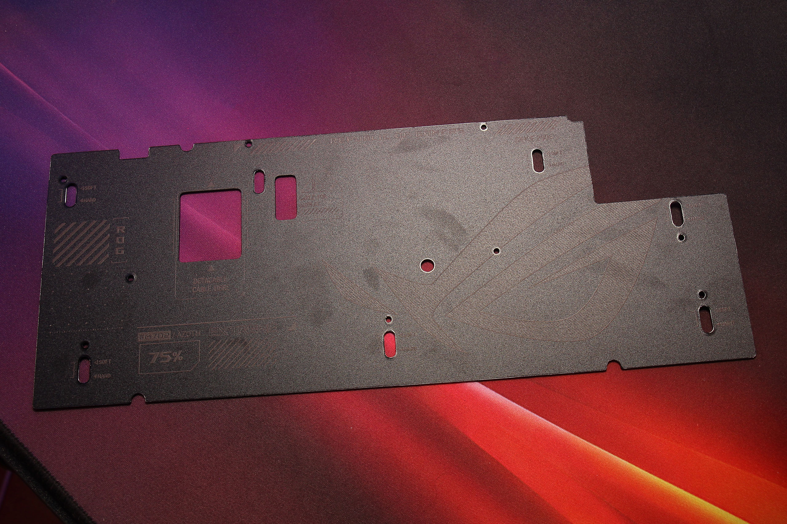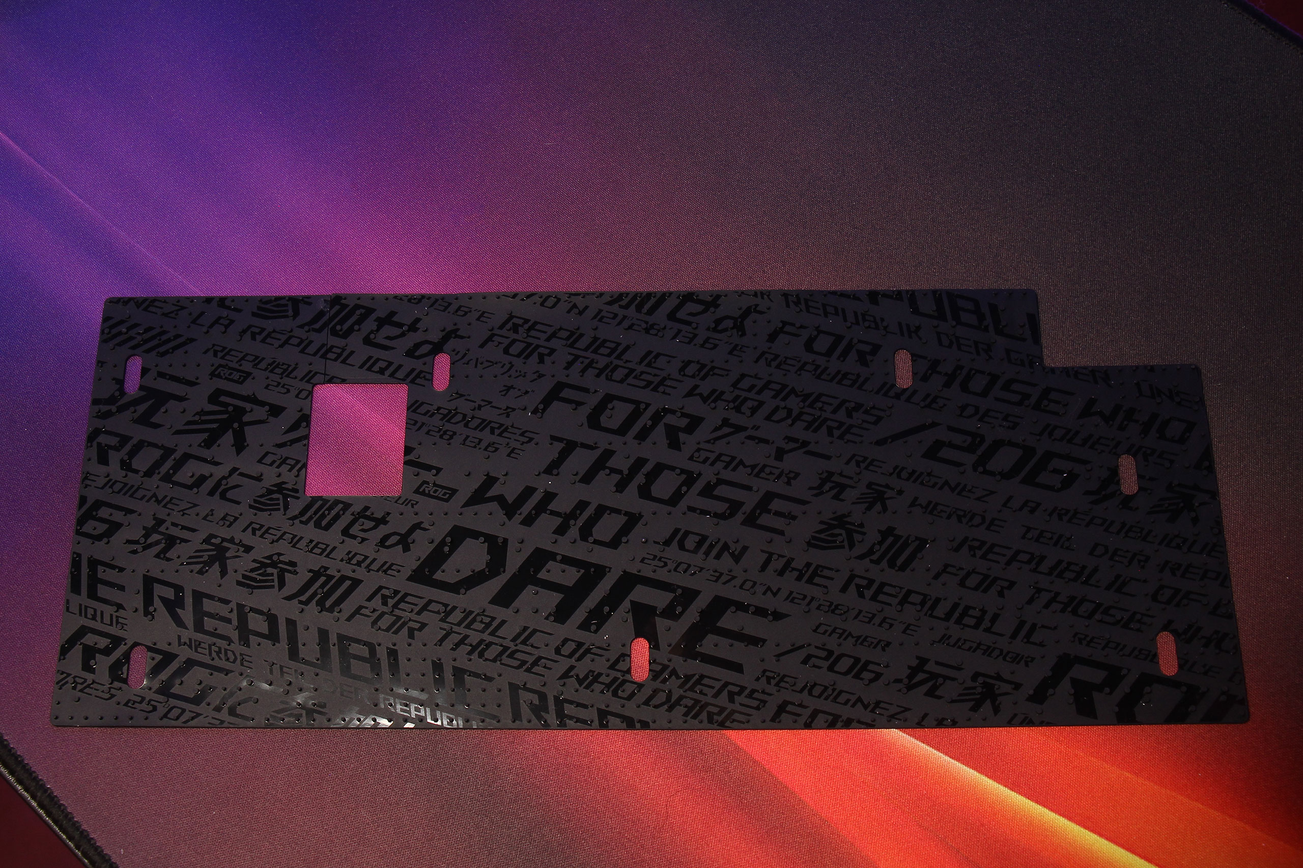 Додатковий силіконовий шар між платою та нижньою частиною корпусу ефективно запобігає виникненню небажаних резонансів. Цей шар виглядає таким чином, що додаткова модифікація навряд чи зможе покращити акустичні характеристики (тому й розбирати корпус особливого сенсу немає). А ще він також красивий: чорного кольору з символікою ROG.