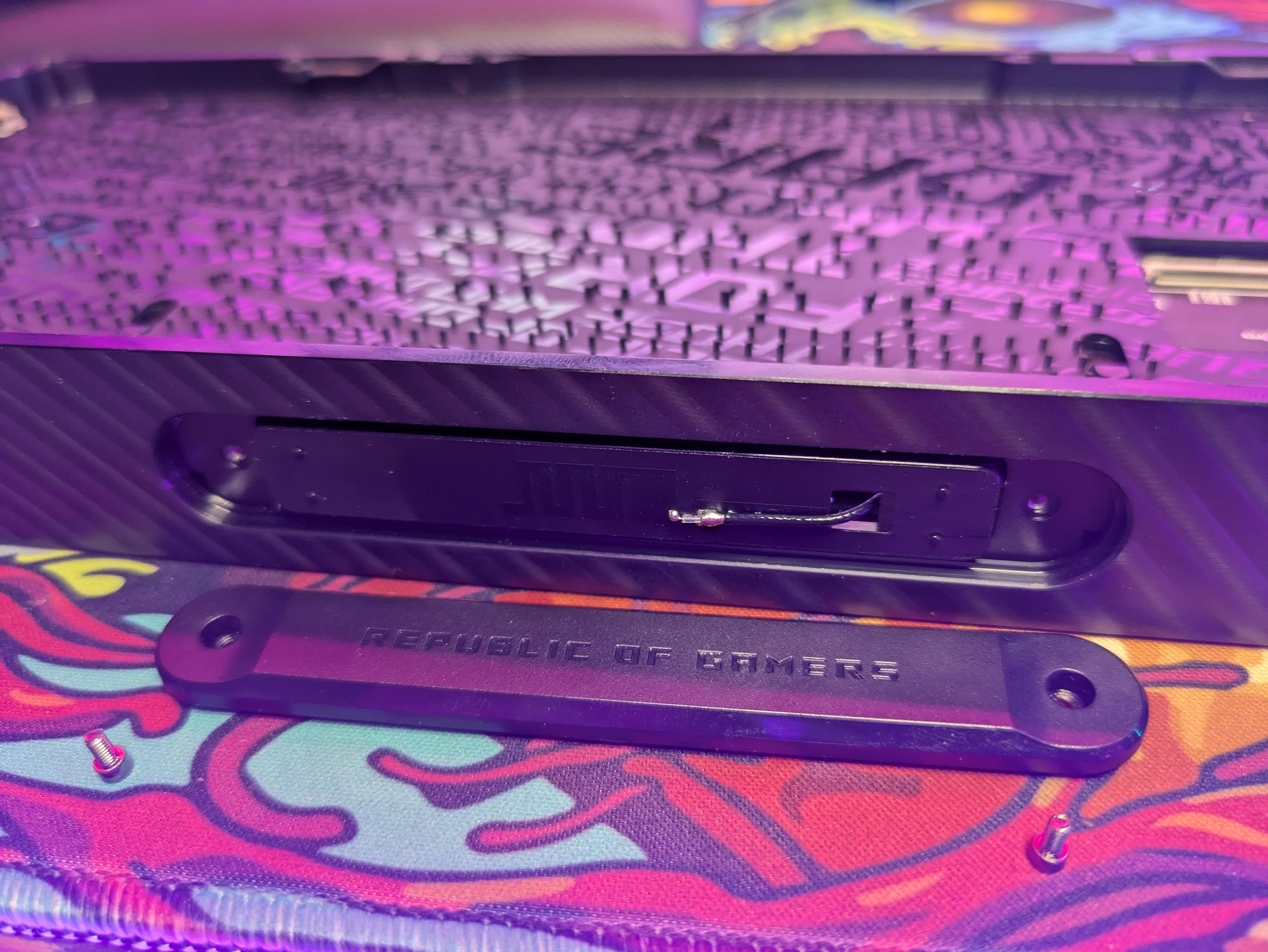 Нарешті, з повністю металевим корпусом інженери ASUS мали знайти якесь рішення для розміщення антени й вони його знайшли, приховавши її під пластиковою кришкою з написом Republic of Gamers на задньому торці пристрою.