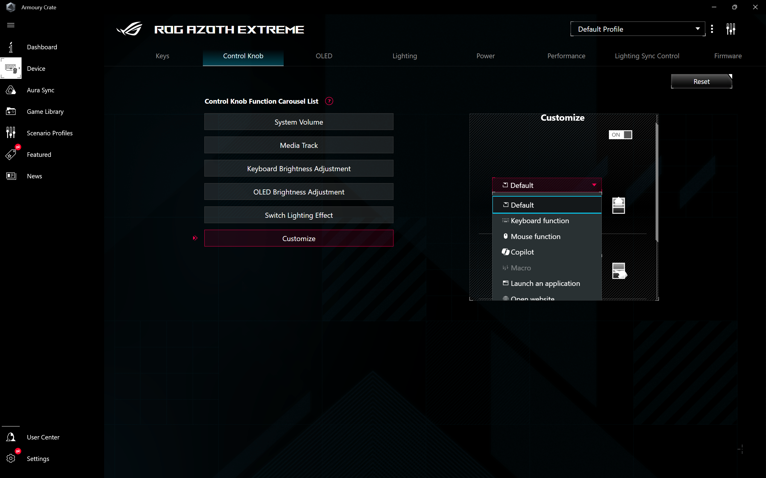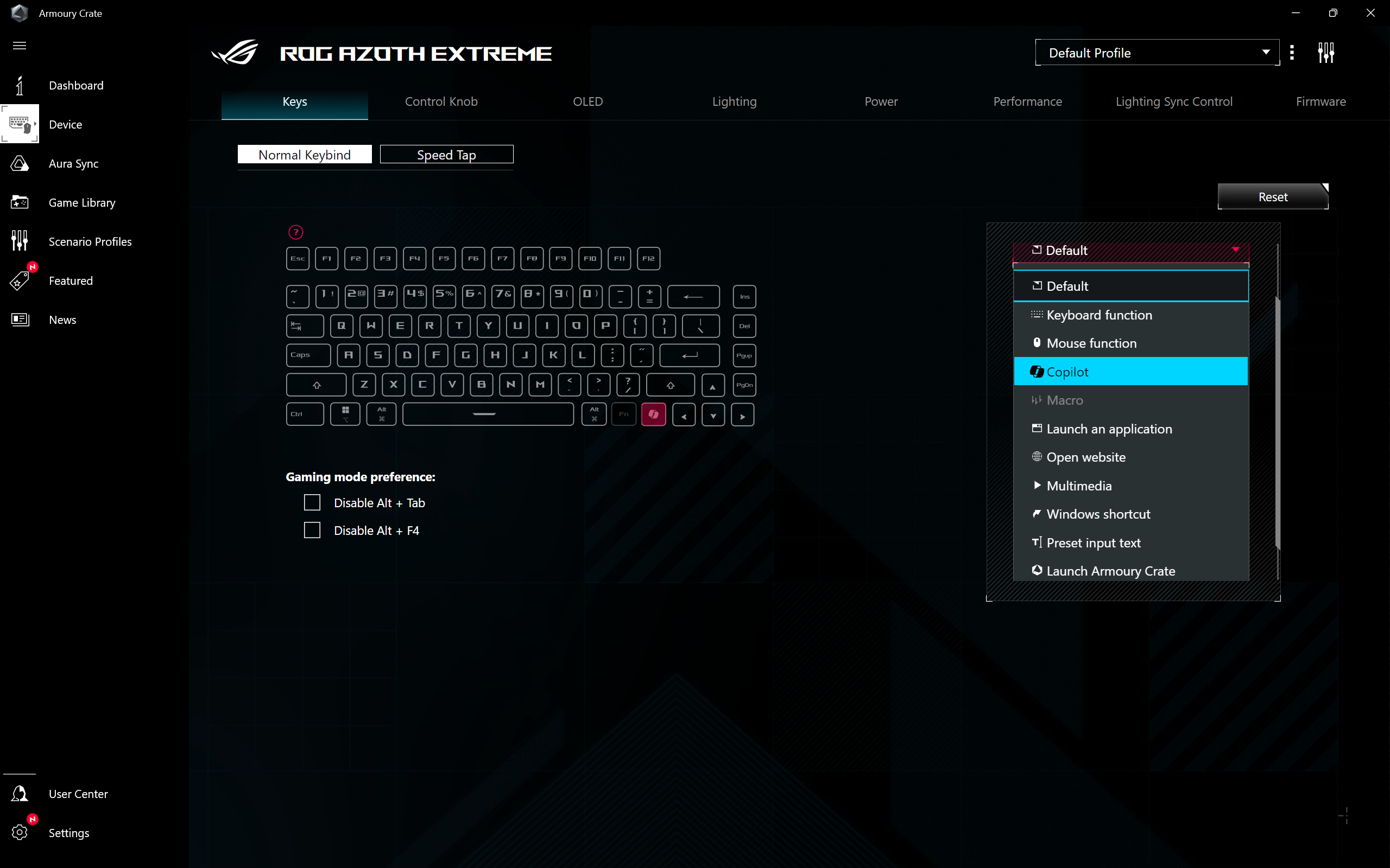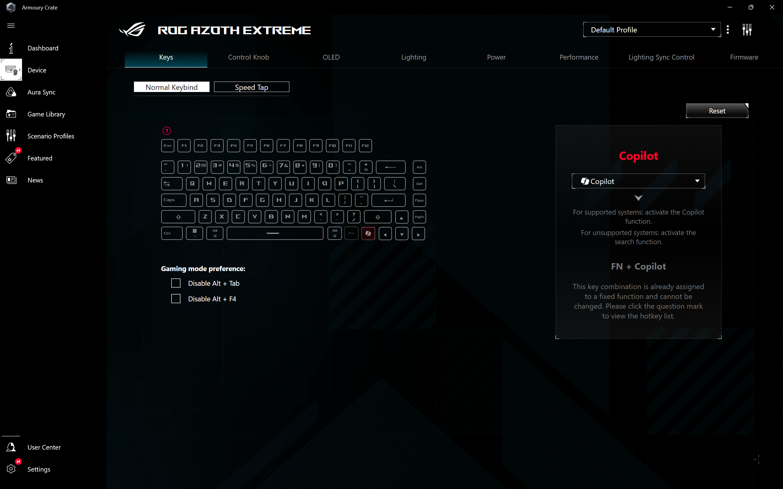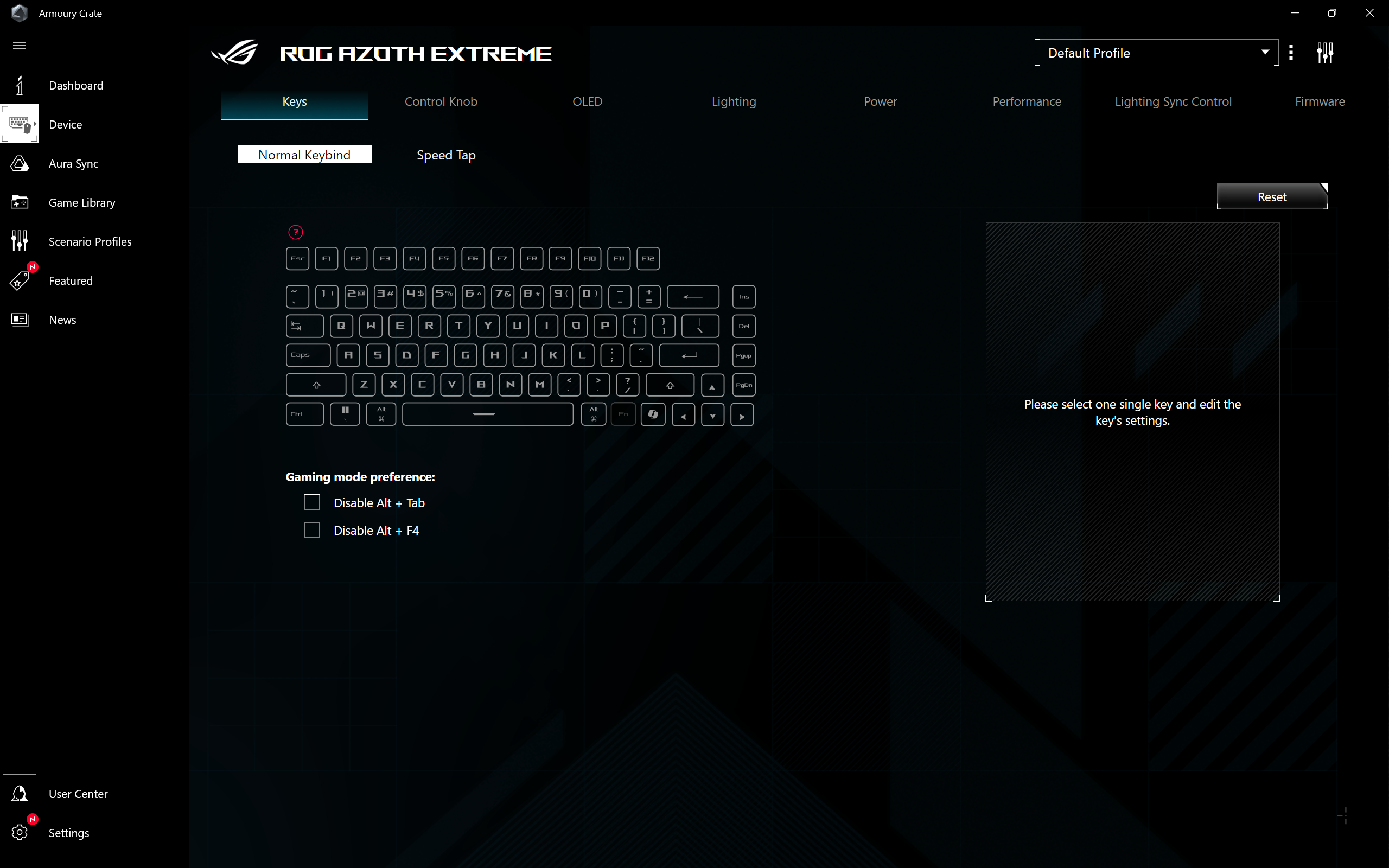 У пам'яті клавіатури зберігається до шести профілів (п'ять користувацьких), що дозволяє використовувати налаштування навіть без програми. Для налаштування ROG Azoth Extreme використовується фірмовий застосунок Armoury Crate. Хоча для базової роботи він не потрібен — клавіатура розпізнається як стандартний пристрій введення у всіх популярних операційних системах — саме через Armoury Crate розкривається весь потенціал пристрою. На жаль, як завжди, є відчуття, що сам по собі застосунок надто «роздутий» та не дуже стабільний, особливо коли працює в складній екосистемі з присутністю пристроїв інших виробників…