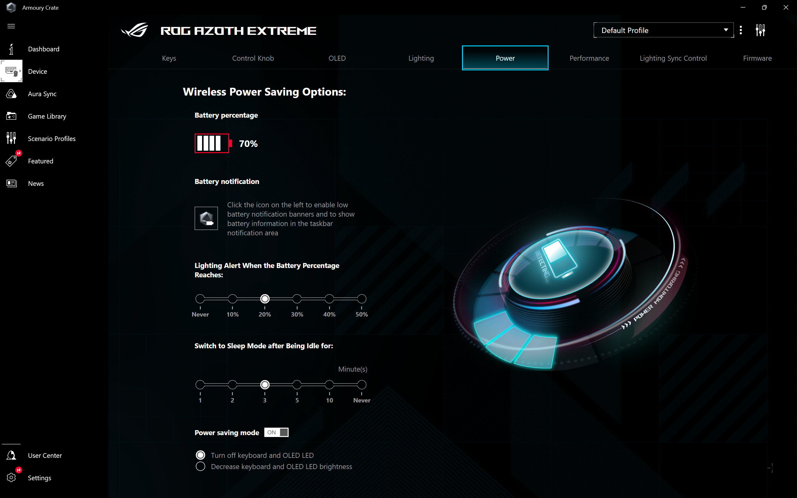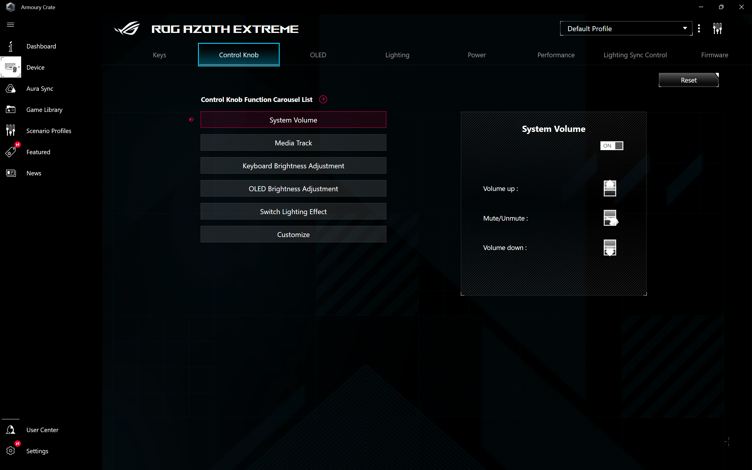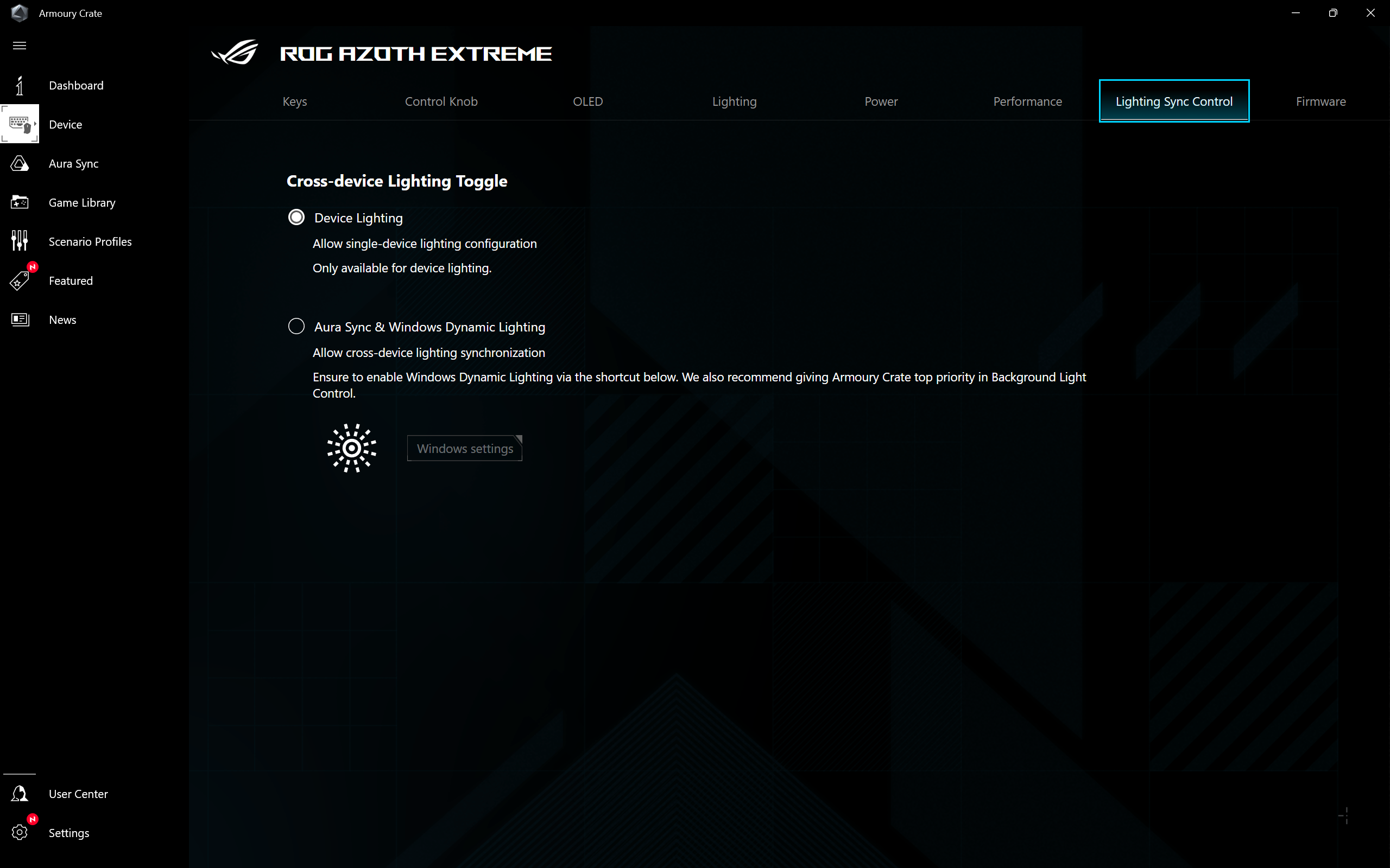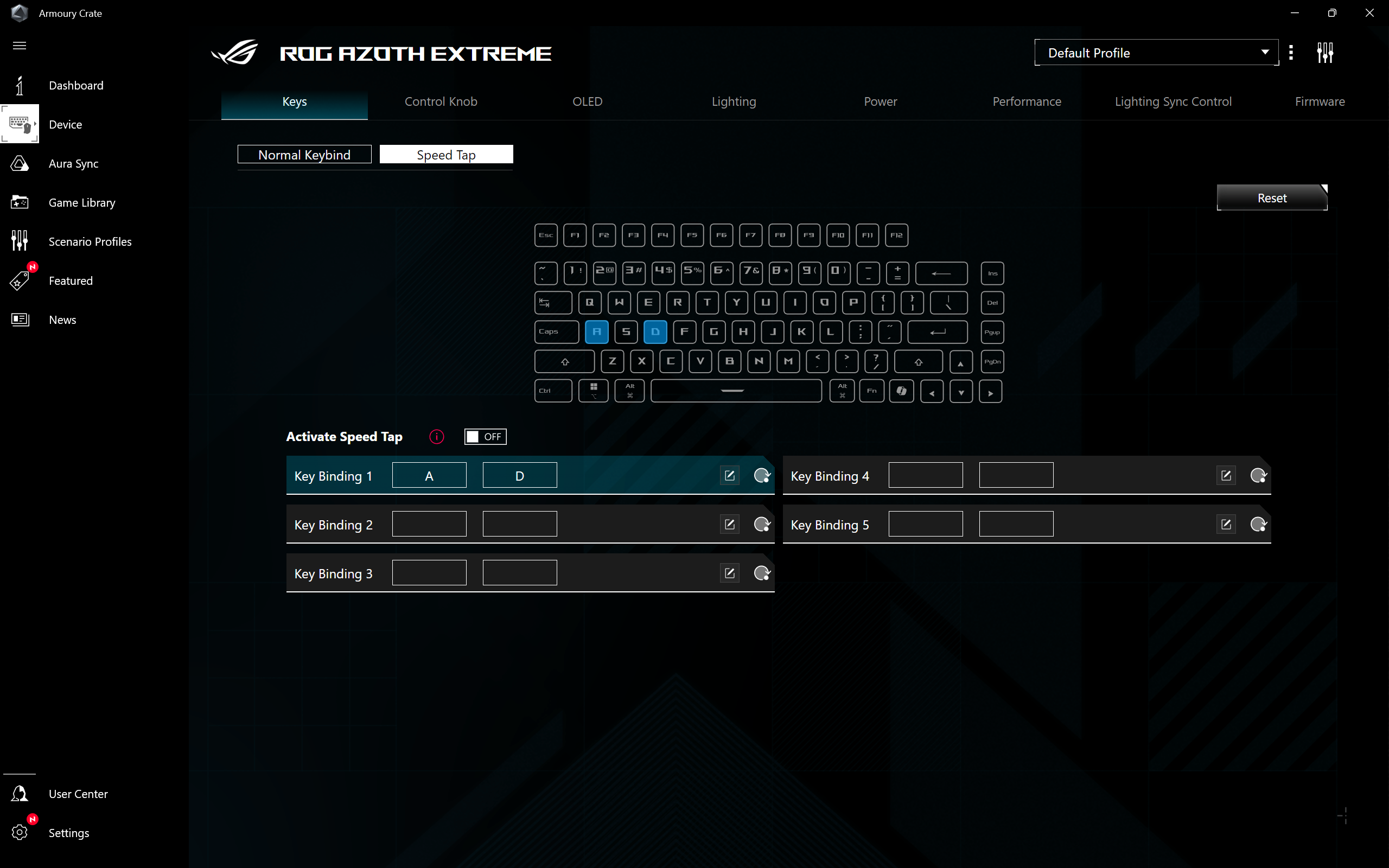 У пам'яті клавіатури зберігається до шести профілів (п'ять користувацьких), що дозволяє використовувати налаштування навіть без програми. Для налаштування ROG Azoth Extreme використовується фірмовий застосунок Armoury Crate. Хоча для базової роботи він не потрібен — клавіатура розпізнається як стандартний пристрій введення у всіх популярних операційних системах — саме через Armoury Crate розкривається весь потенціал пристрою. На жаль, як завжди, є відчуття, що сам по собі застосунок надто «роздутий» та не дуже стабільний, особливо коли працює в складній екосистемі з присутністю пристроїв інших виробників…
