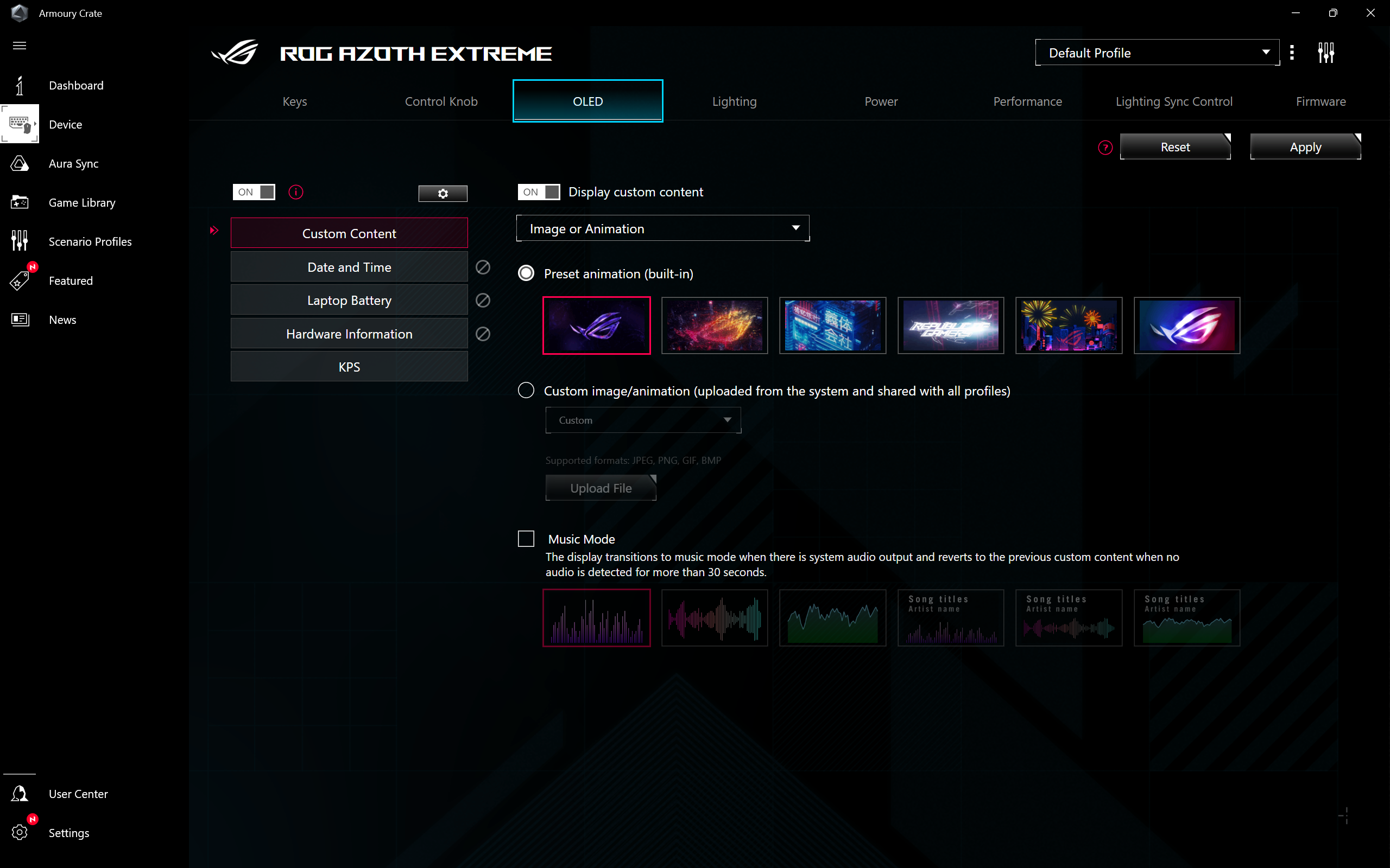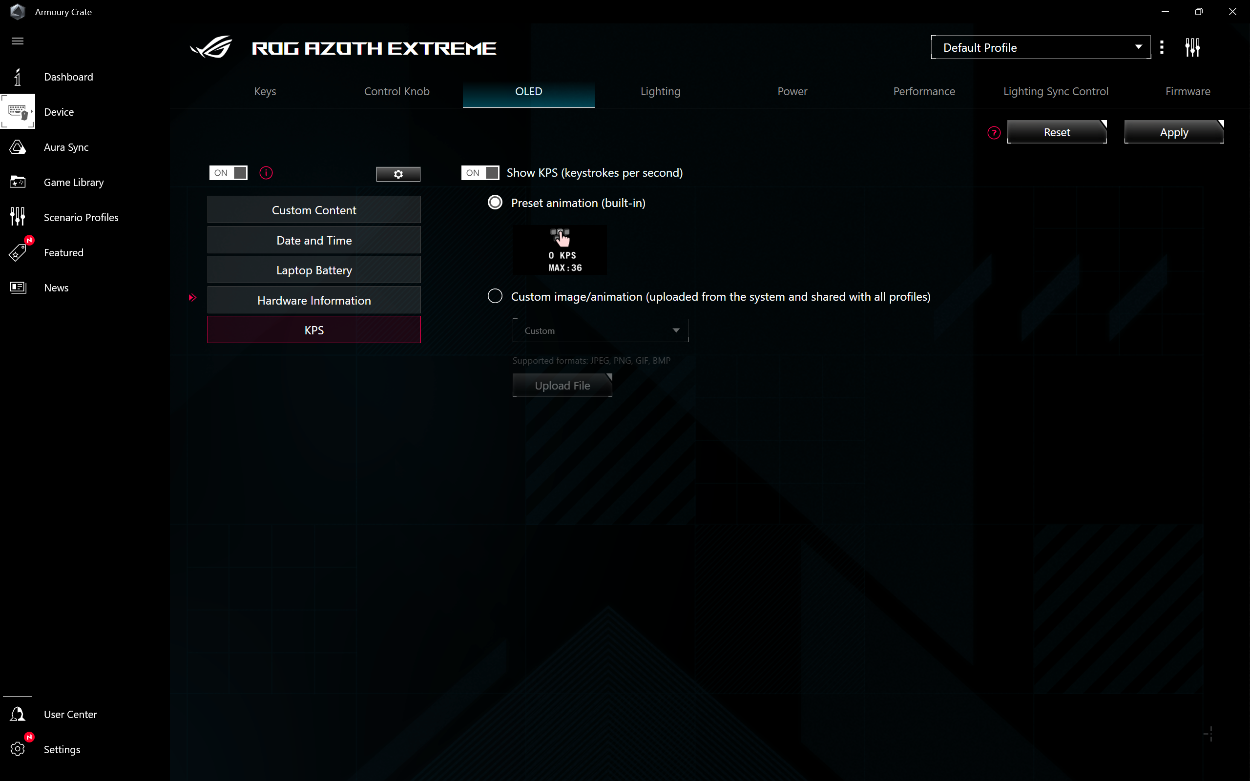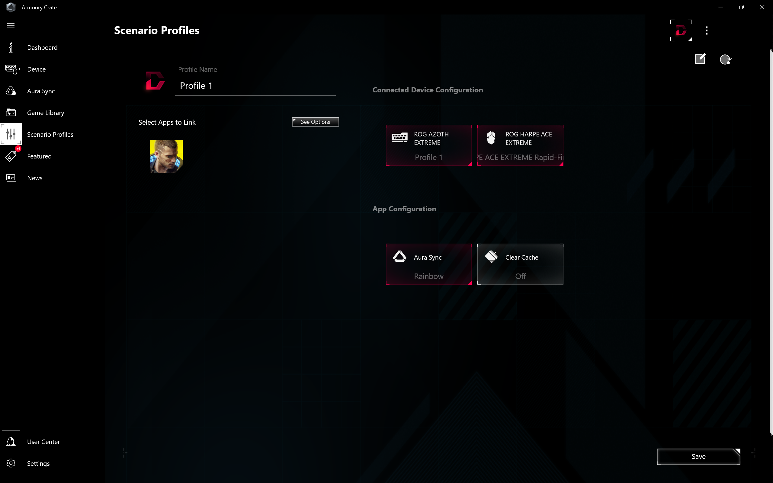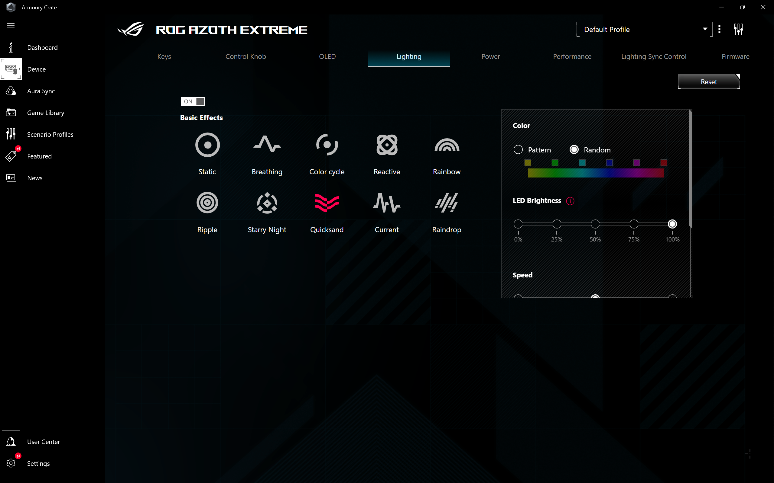 У пам'яті клавіатури зберігається до шести профілів (п'ять користувацьких), що дозволяє використовувати налаштування навіть без програми. Для налаштування ROG Azoth Extreme використовується фірмовий застосунок Armoury Crate. Хоча для базової роботи він не потрібен — клавіатура розпізнається як стандартний пристрій введення у всіх популярних операційних системах — саме через Armoury Crate розкривається весь потенціал пристрою. На жаль, як завжди, є відчуття, що сам по собі застосунок надто «роздутий» та не дуже стабільний, особливо коли працює в складній екосистемі з присутністю пристроїв інших виробників…