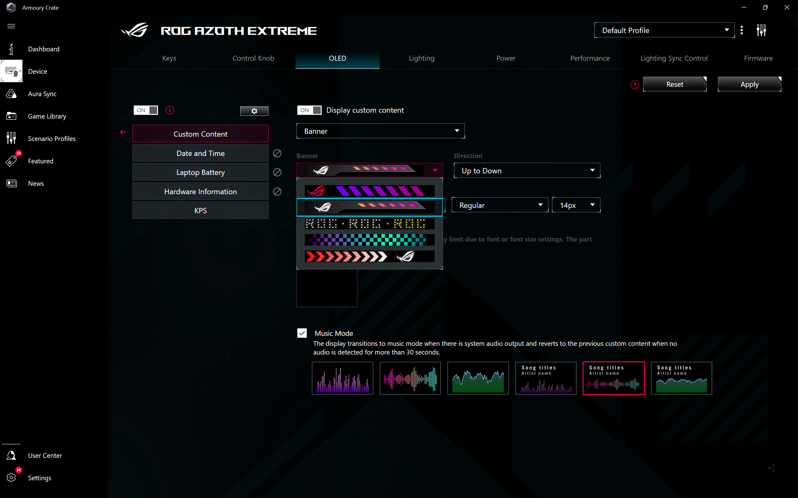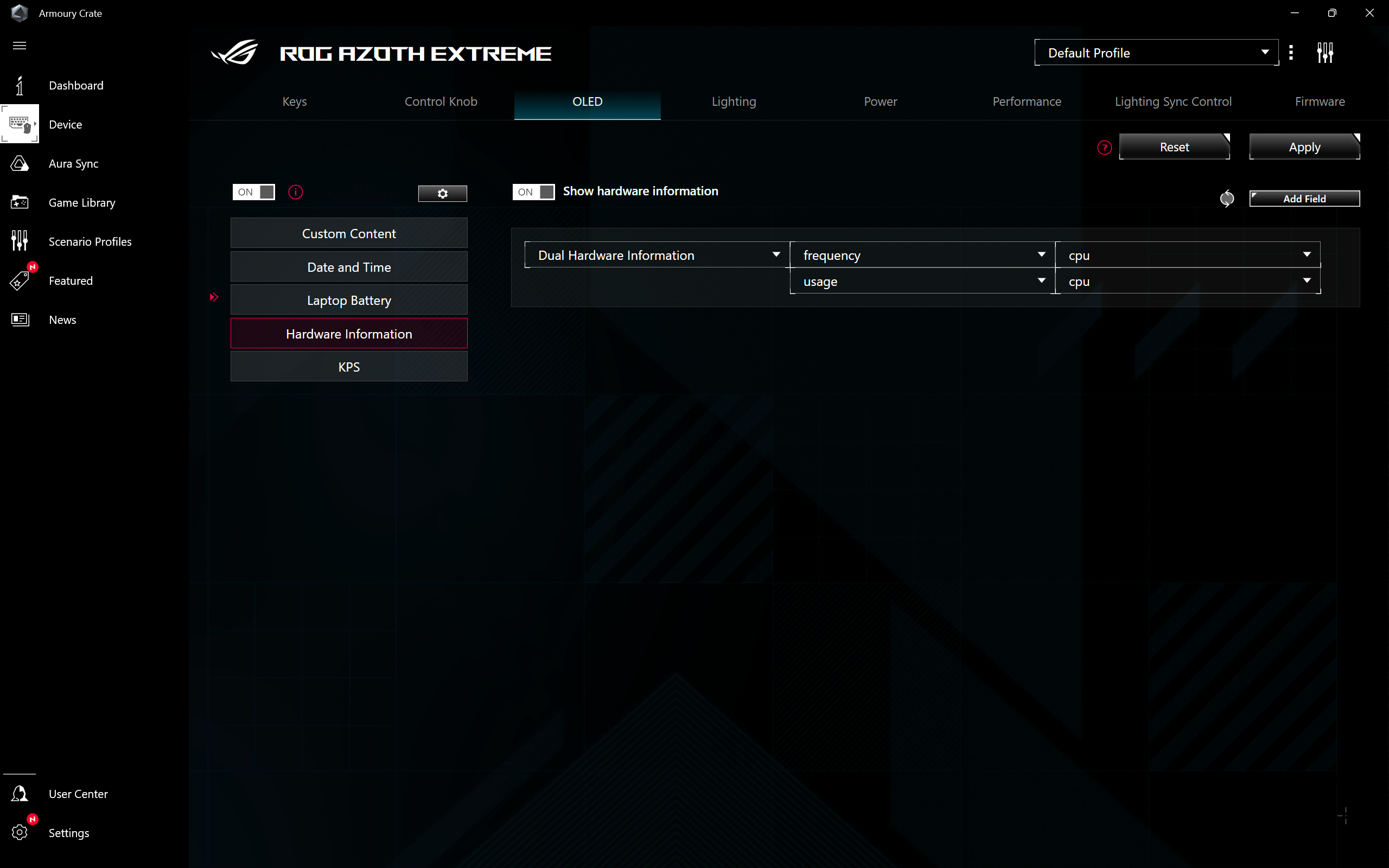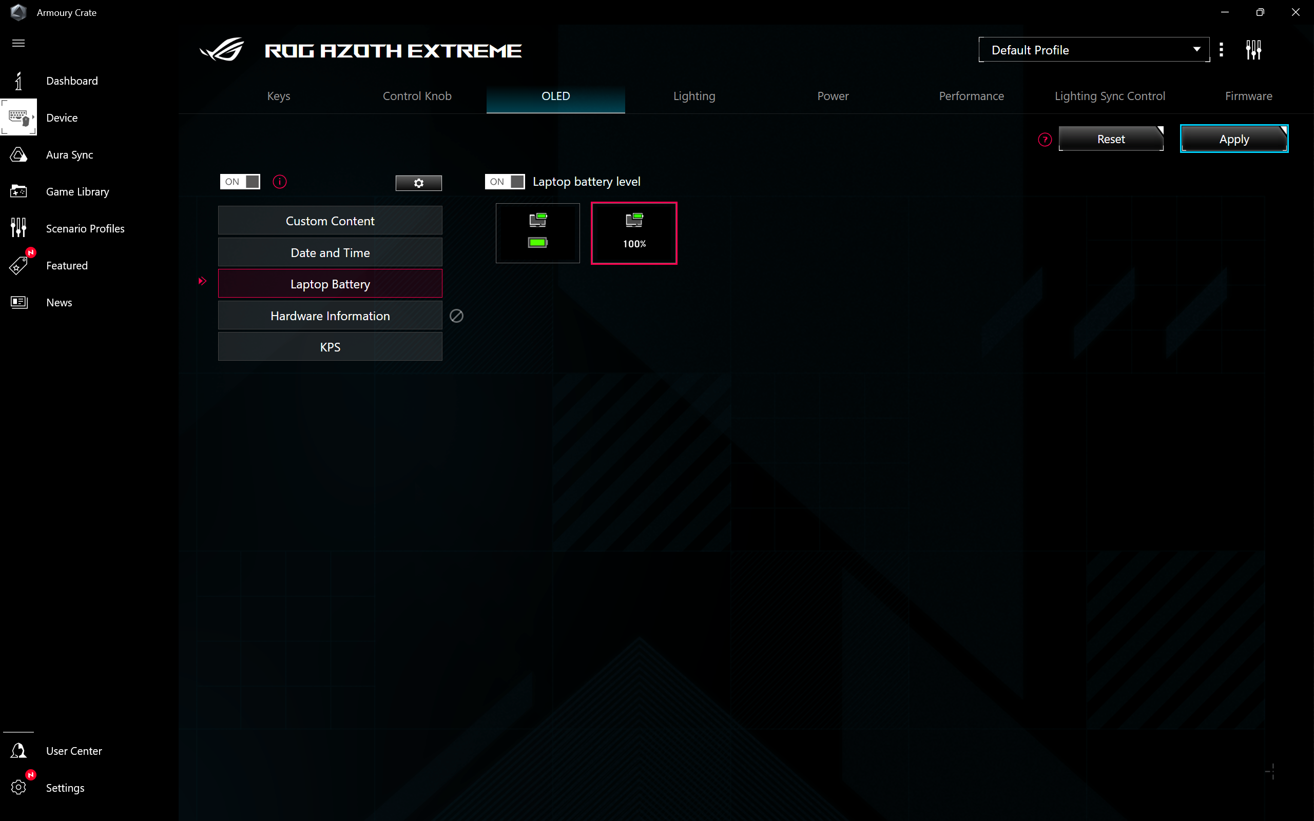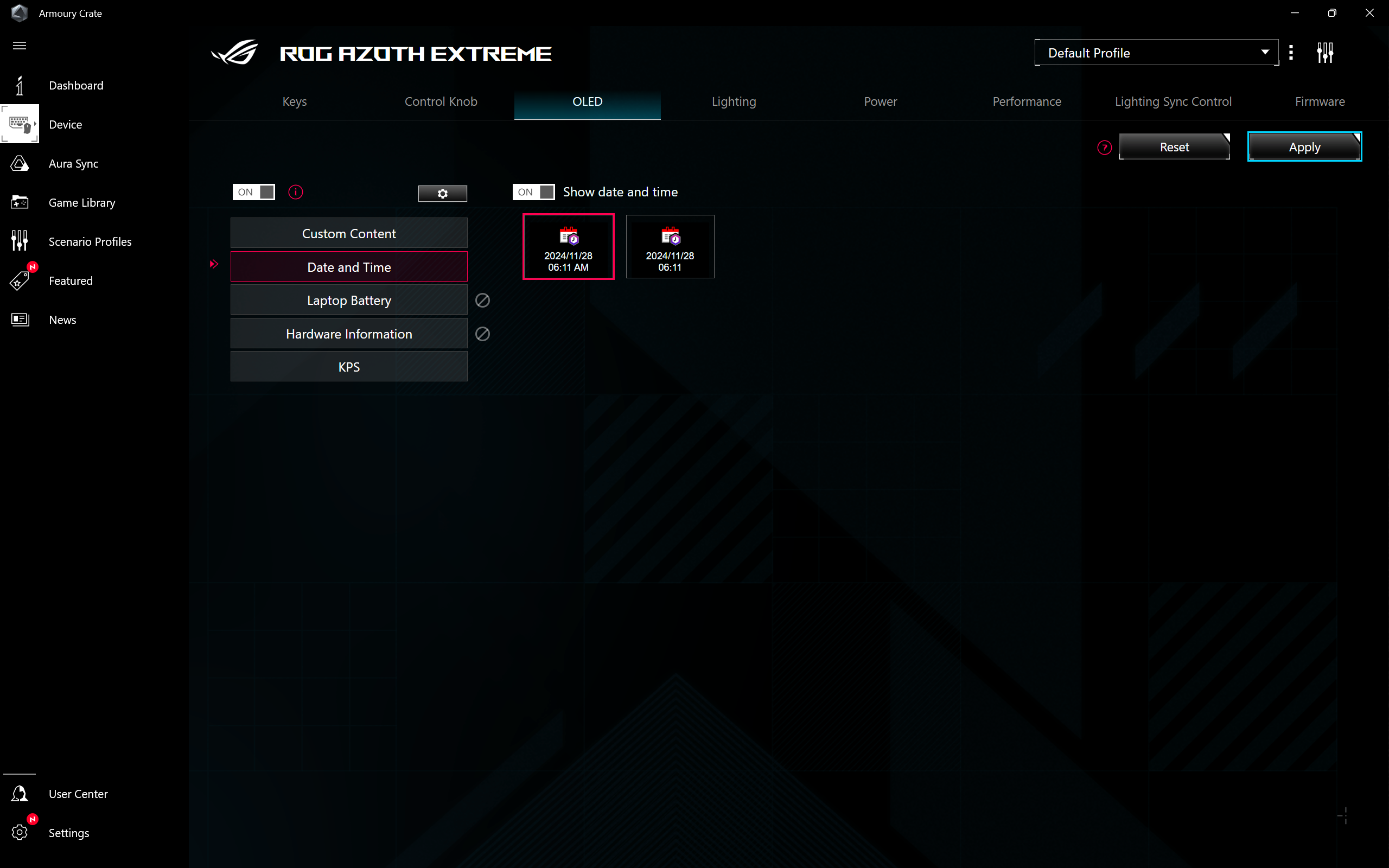 У пам'яті клавіатури зберігається до шести профілів (п'ять користувацьких), що дозволяє використовувати налаштування навіть без програми. Для налаштування ROG Azoth Extreme використовується фірмовий застосунок Armoury Crate. Хоча для базової роботи він не потрібен — клавіатура розпізнається як стандартний пристрій введення у всіх популярних операційних системах — саме через Armoury Crate розкривається весь потенціал пристрою. На жаль, як завжди, є відчуття, що сам по собі застосунок надто «роздутий» та не дуже стабільний, особливо коли працює в складній екосистемі з присутністю пристроїв інших виробників…