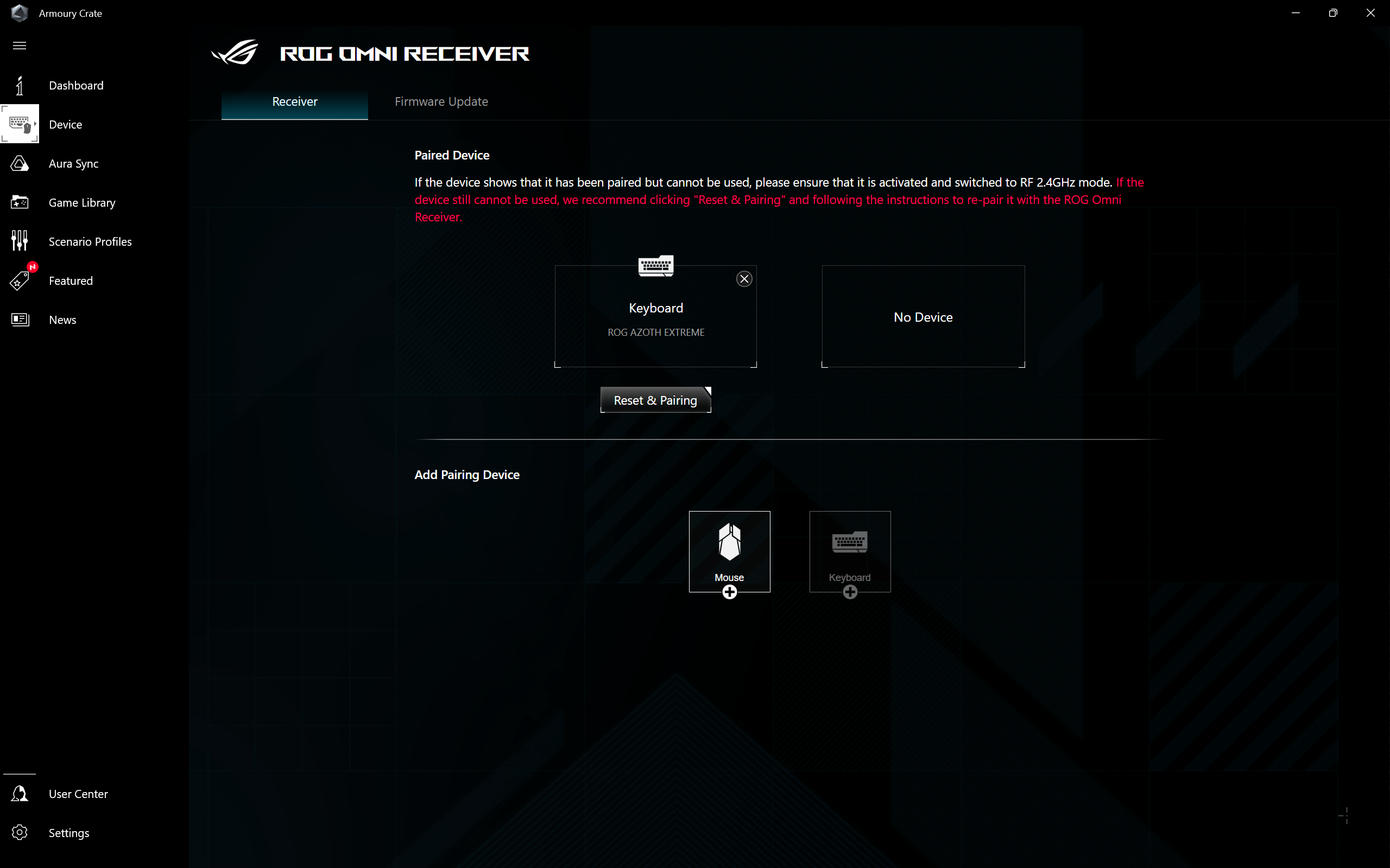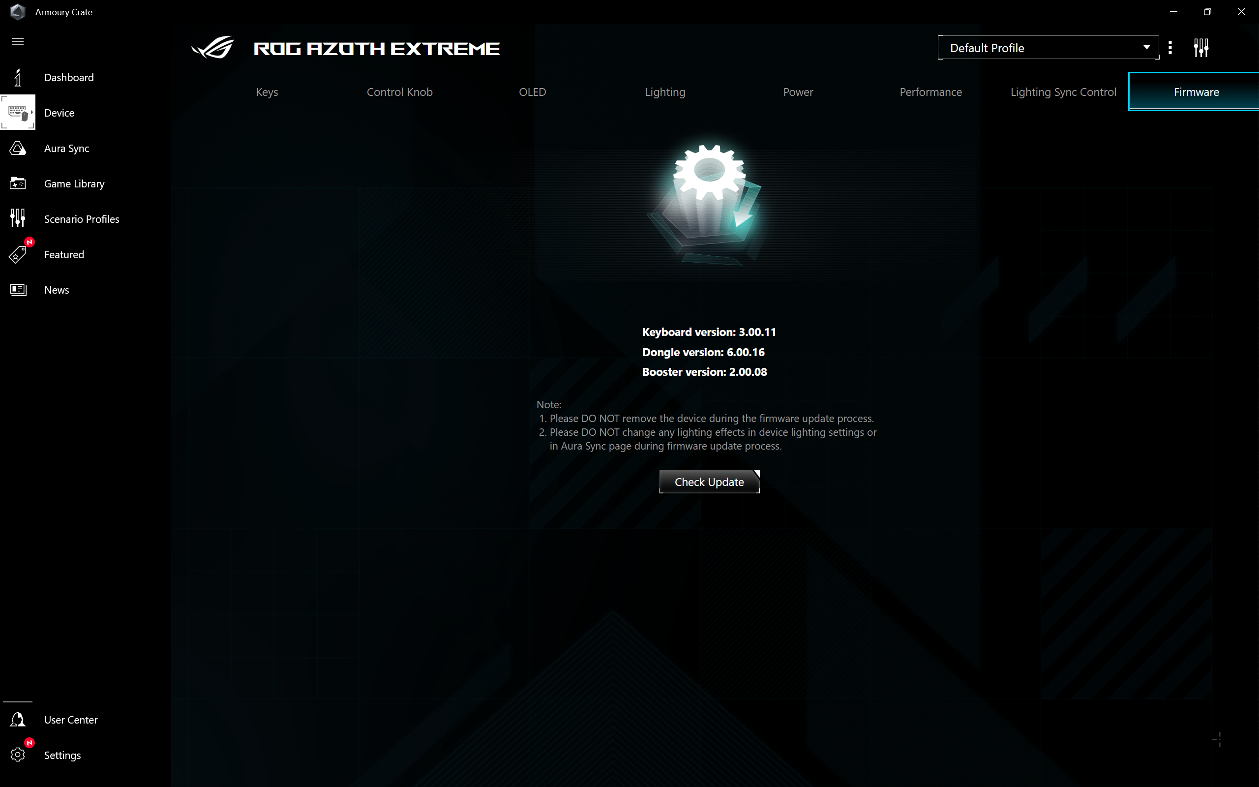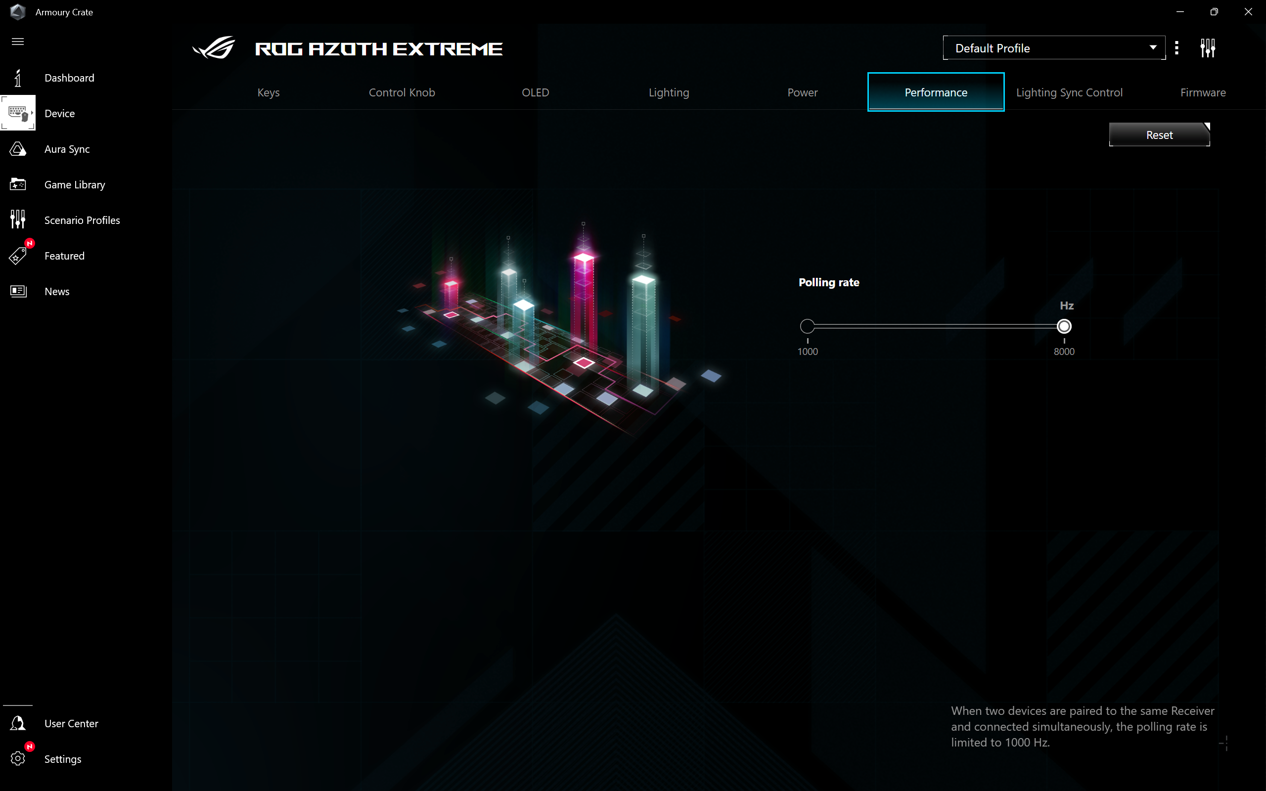 Також через Armoury Crate можливе налаштування роботи одного Omni Receiver одночасно з клавіатурою та мишею (але не вище 1000 Гц у такому випадку), оновлення прошивки самої клавіатури та ресиверу, а також окремі профілі для кожного застосунку чи гри, які будуть вмикатися автоматично.