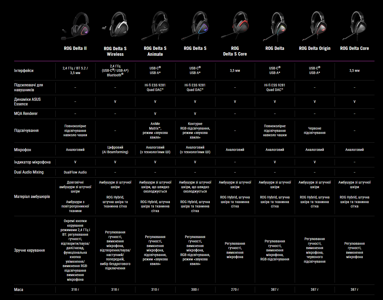 Порівняти всі моделі ROG Delta допоможе таблиця з сайту виробника: