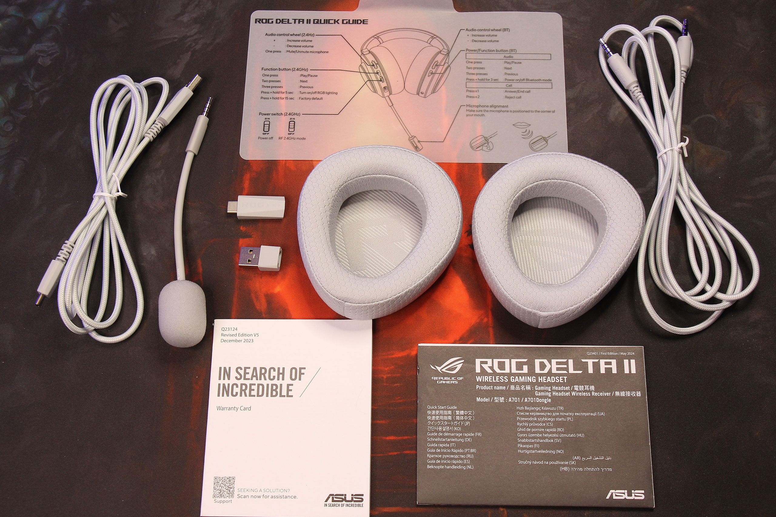З двох можливих кольорів на тестування прийшла біла версія. Чорна не відрізняється нічим, крім кольору. Ззовні ASUS ROG Delta II демонструє еволюційний розвиток дизайну попередника, зберігаючи впізнаваний стиль Republic of Gamers. При вазі 318 грамів гарнітура відчувається збалансованою та не створює надмірного навантаження на голову, що важливо для тривалих ігрових сесій.