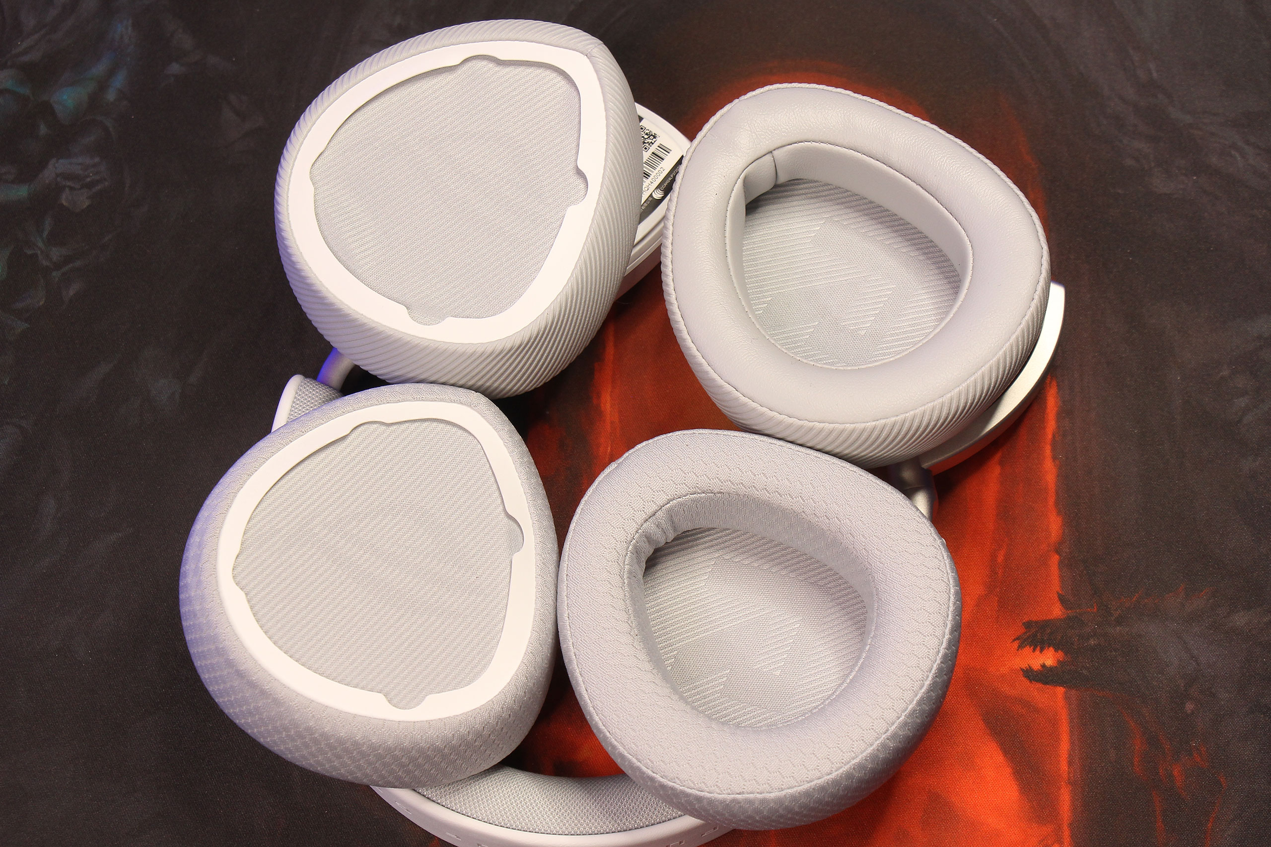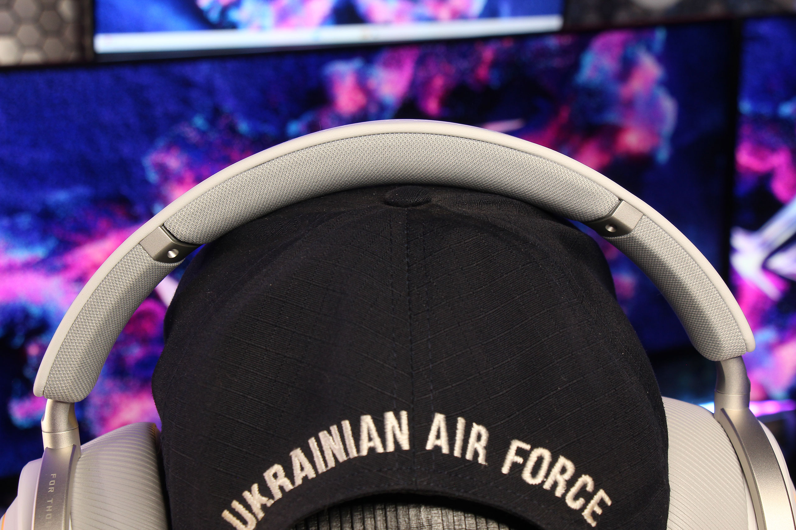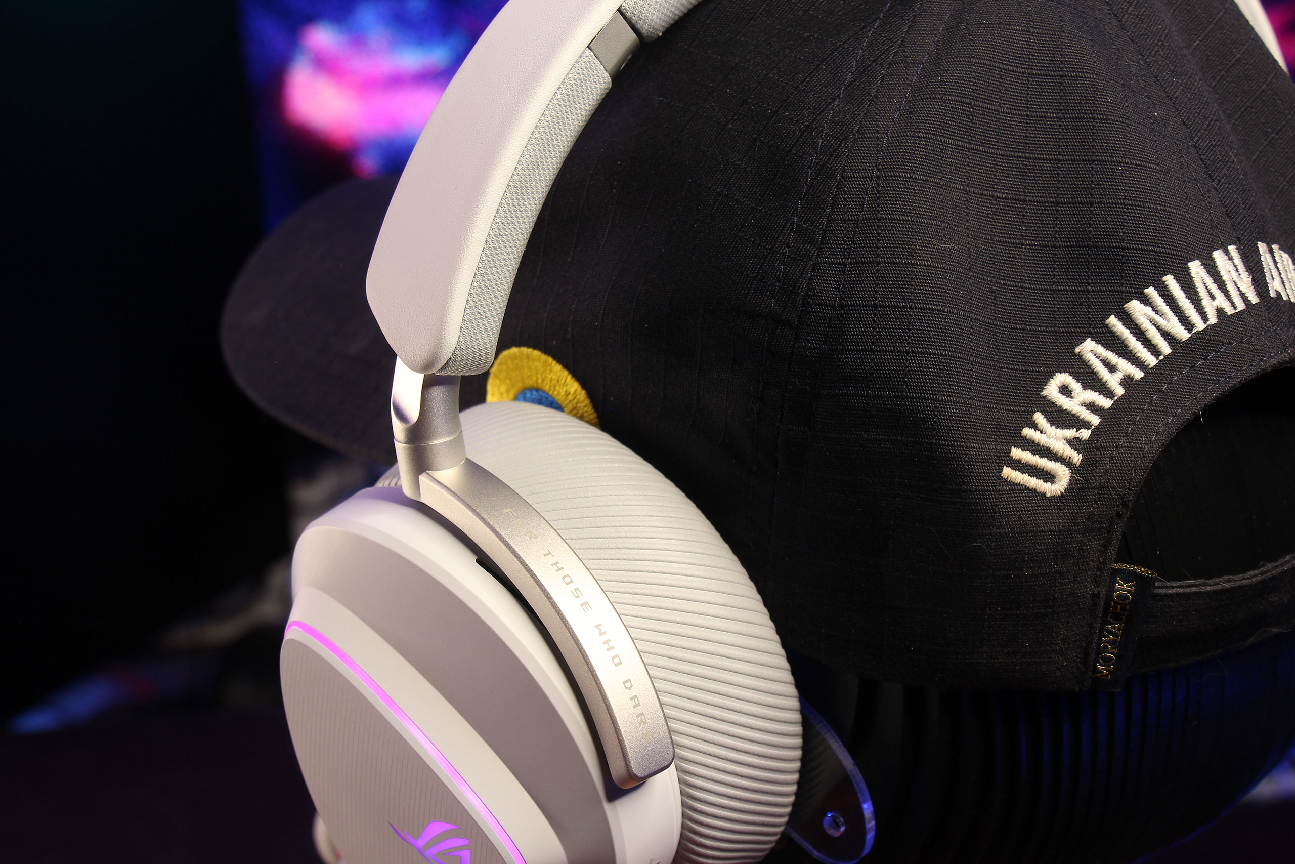 Регульоване оголів’я має металеву основу, обгорнуту м’якою штучною шкірою. На верхній частині ненав’язливо тиснено напис Republic of Gamers. Механізм регулювання працює плавно та надійно фіксує обрану позицію. Сила притискання збалансована — достатня для надійної фіксації, але не надмірна, щоб не викликати дискомфорт. Користувачі окулярів відзначають, що товсті подушки та помірний притиск роблять гарнітуру комфортною навіть при носінні окулярів протягом тривалого часу. Амбушури можуть повертатися та складатися горизонтально, що зручно для зберігання або носіння навколо шиї.