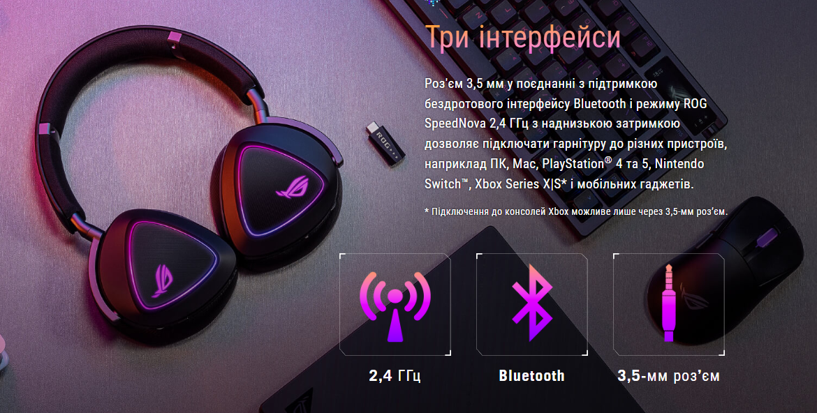 | Інтерфейс підключення гарнітури | 2,4 ГГц ROG SpeedNova, Bluetooth 5.3, 3,5 мм |