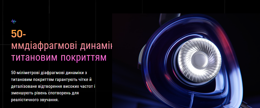 | Динаміки, мм | 50 мм з титановим покриттям діафрагми |