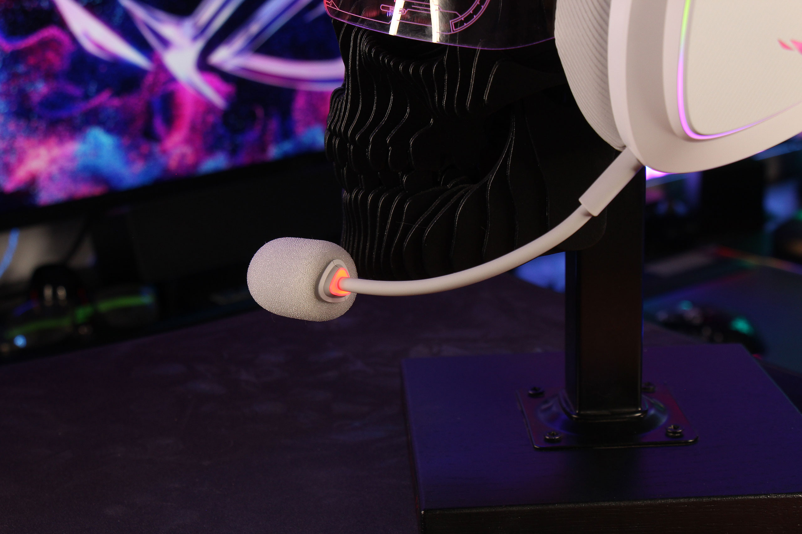 Мікрофон забезпечує чіткий та насичений звук з приємним басовим відтінком, уникаючи типової для багатьох гарнітур «металевості» або тонкості. Співрозмовники чують користувача голосно та зрозуміло. Область, яка потребує покращення — це шумозаглушення. Мікрофон не має активної системи придушення шуму, покладаючись на програмні фільтри в Armoury Crate. На практиці це означає, що в тихому приміщенні мікрофон може підхоплювати звуки механічної клавіатури, кліки миші або інші фонові шуми. Налаштування «шумових воріт» у програмному забезпеченні частково розв’язує проблему, припиняючи передачу звуку при відсутності мовлення, але не може повністю усунути шуми, які відбуваються під час розмови.