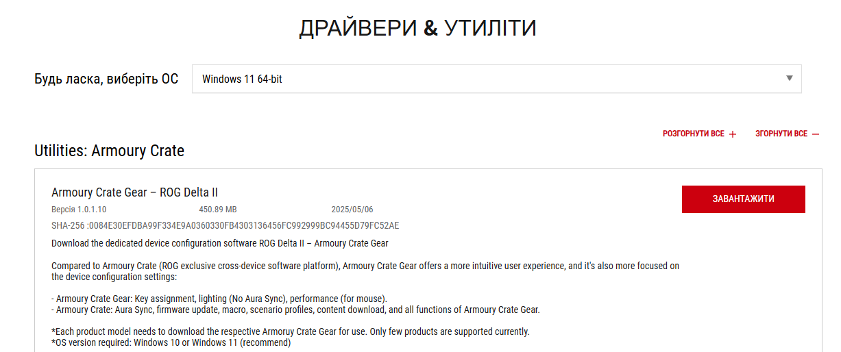 ASUS ROG Delta II підтримується програмним забезпеченням Armoury Crate, яке надає широкі можливості для налаштування та керування гарнітурою. Користувачі можуть встановити як повну версію Armoury Crate для керування всією екосистемою ROG, так і легшу версію Armoury Crate Gear виключно для цього пристрою. Другий варіант краще, якщо в системі присутньо менш як три сумісні пристрої ASUS.