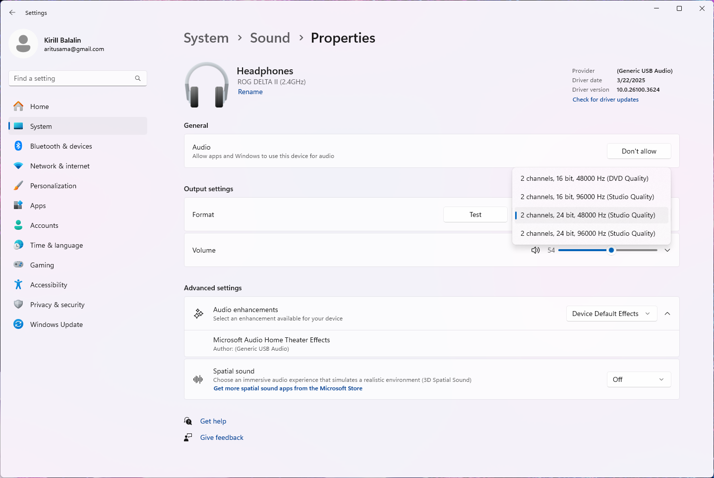 Аудіо характеристики ASUS ROG Delta II демонструють цікавий підхід до налаштування звуку, орієнтований перш за все на ігрове застосування. 50-міліметрові драйвери з титановим покриттям діафрагми забезпечують частотний діапазон 20–20000 Гц та імпеданс 32 Ом, що робить гарнітуру пригідною для більшості пристроїв. Delta II підтримує кодек LC3+ у режимі Bluetooth та забезпечує аудіо 24 біт/96 кГц у режимі 2,4 ГГц (хоча сертифікації Hi-Res Audio у пристрою немає через недостатній для цього частотний діапазон).
