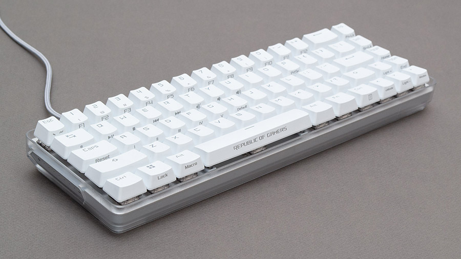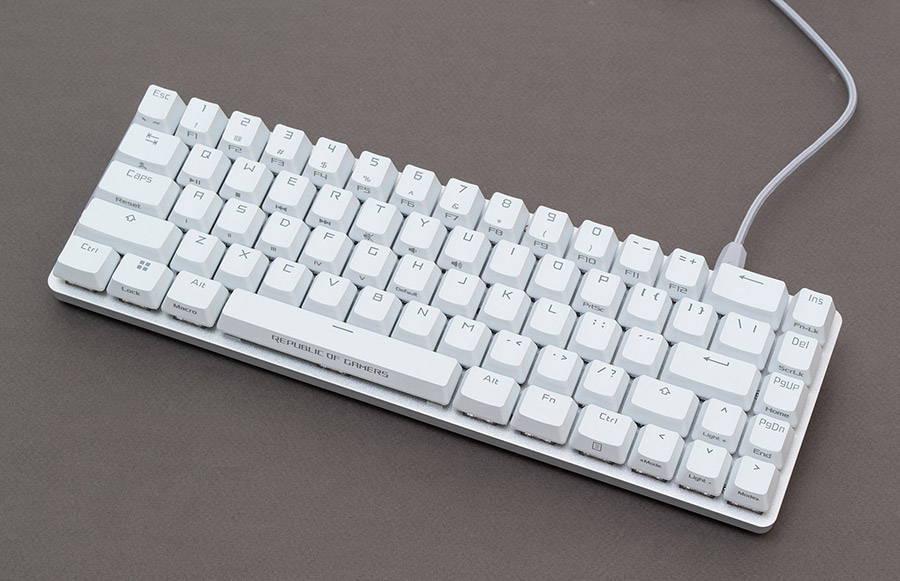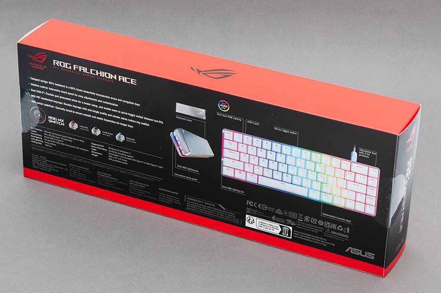 ASUS ROG Falchion Ace є компактною 65% клавіатурою, яка менше ніж на сантиметр ширша за мінімалістичний 60% формат, проте надає користувачу чотири додаткові стрілочні клавіші та кнопки Ins, Del, PgUp та PgDn для зручності редагування текстових документів. Недоліком такого рішення є незначне звуження стандартної ANSI розкладки, із-за чого користувачу доведеться витратити деякий час, щоб звикнути друкувати тут наосліп та не зачіпати додаткові кнопки з правої сторони. Проте, загальна ергономіка пристрою досить комфортна, хоча її можна зробити значно кращою завдяки підставці під долоні.