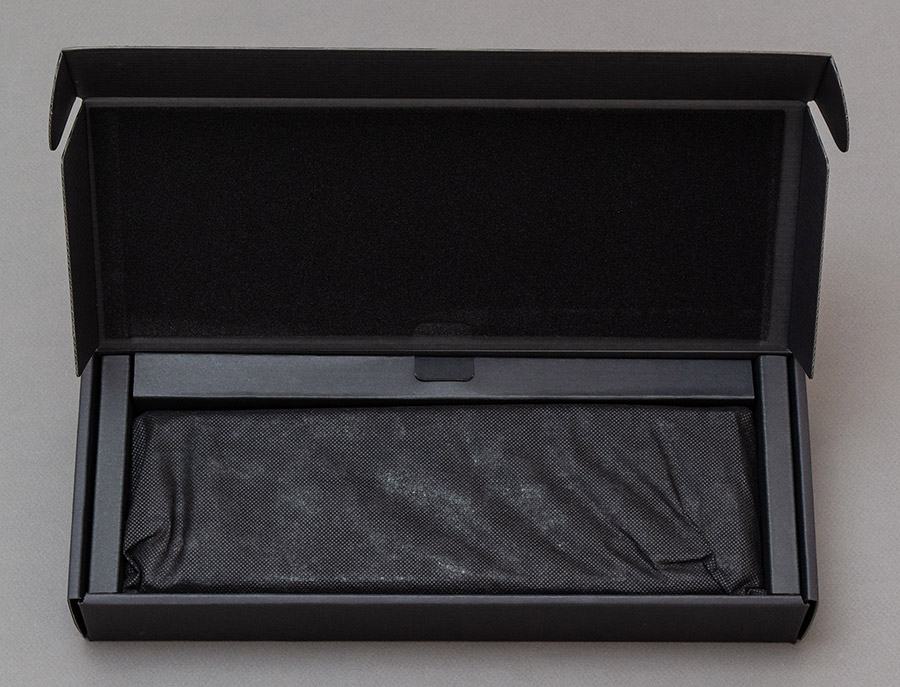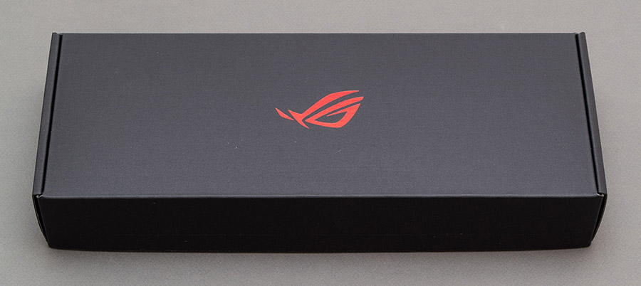 Основна чорна картонна коробка, що ховається під обкладинкою, містить на собі лише червоний логотип ROG посередині. Захист від пошкоджень забезпечують вставки з картону, пакет з поліетилену та штучної тканини, одна м’яка прокладка зверху.