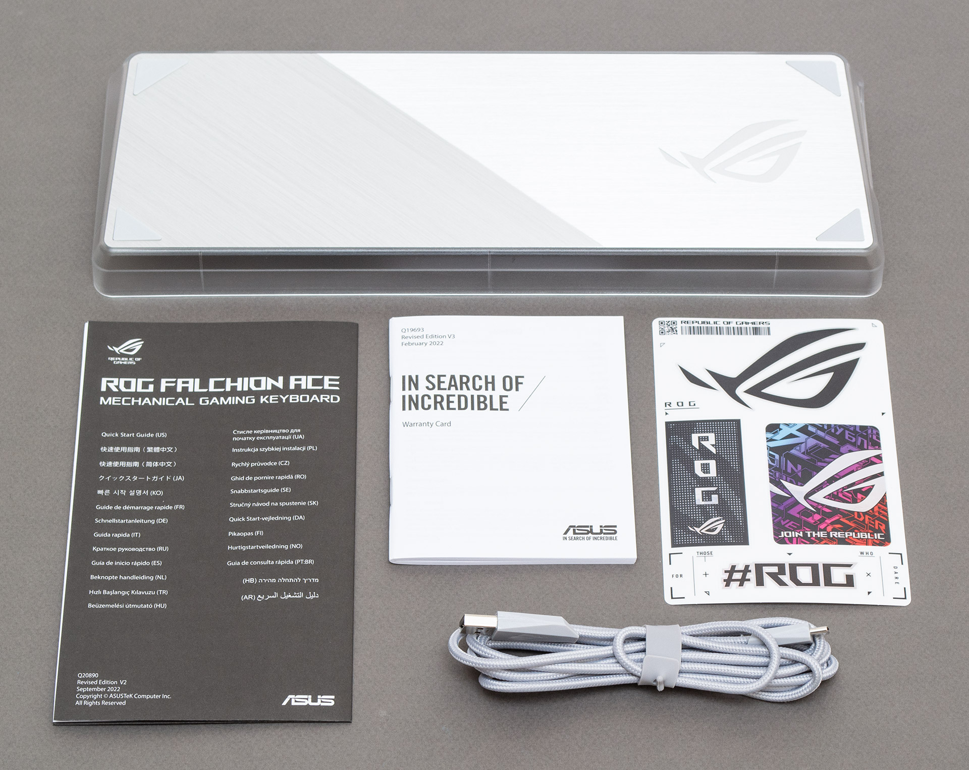 У комплекті окрім клавіатури є тверда захисна кришка, інструкція користувача, брошура з інформацією про гарантію, комплект наліпок та сигнальний кабель USB Type C на USB Type A.