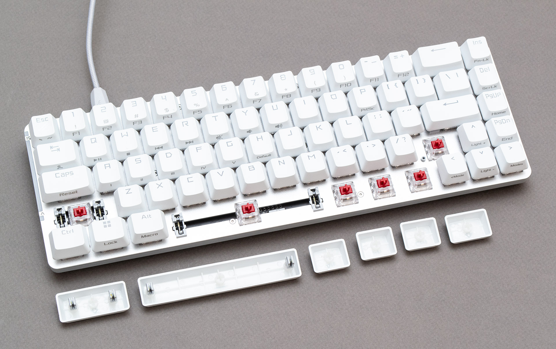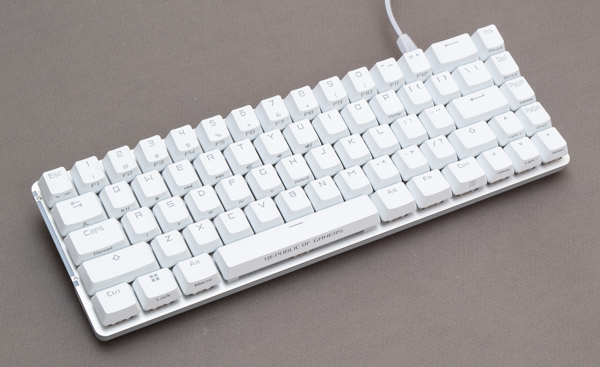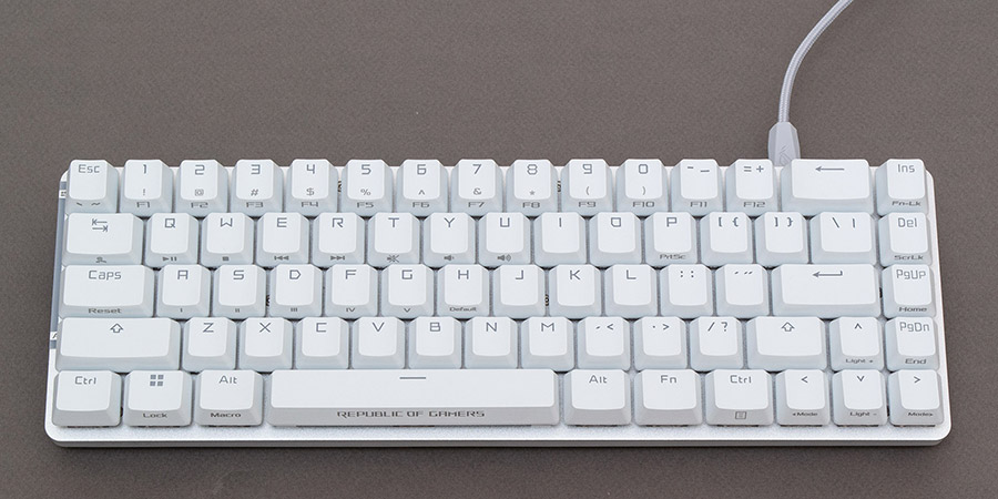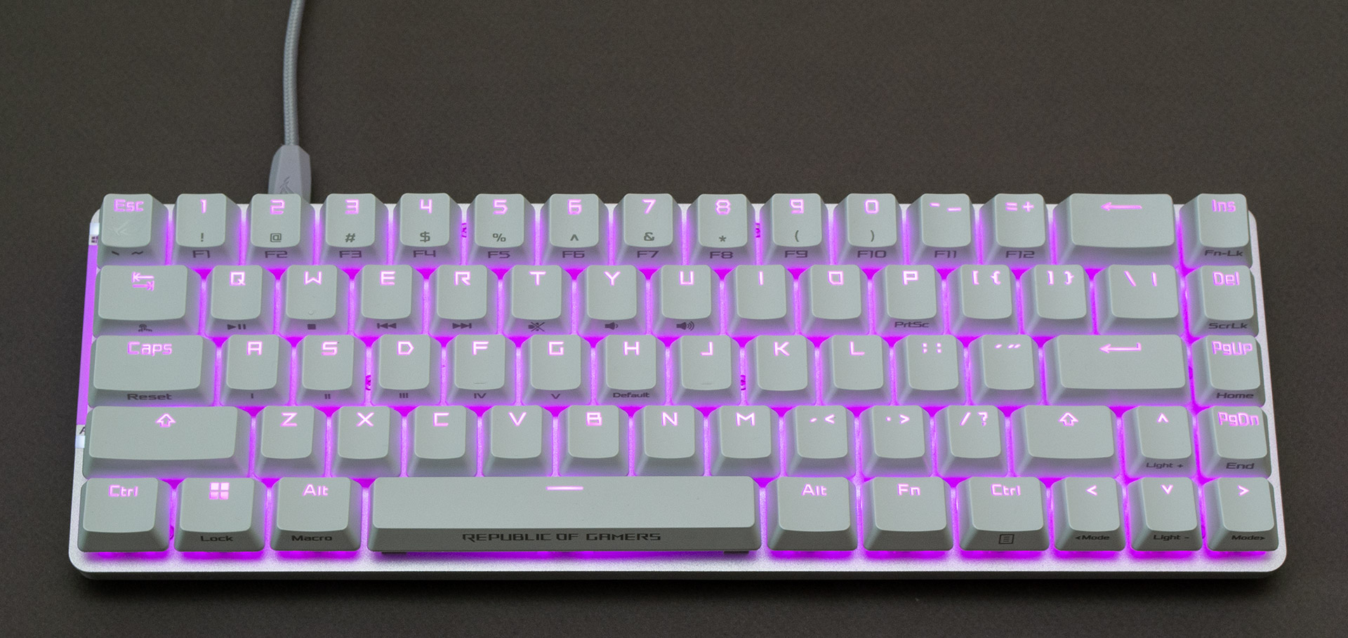 В клавіатурі використовуються фірмові механічні перемикачі ROG NX Red. Крім них можуть бути варіанти з перемикачами NX Blue та NX Brown. Детально про особливості та різновиди механізмів можна дізнатися за цим посиланням. ROG NX Red це класичні лінійні перемикачі. Вони мають точку спрацьовування на 1,8 мм ходу та повний хід у 4 мм. Початкова сила натискання дорівнює 40 грамам, точка активації — 45 грамам, а повне зусилля відповідає 55 грамам. Точка активації збігається з точкою деактивації механізму. Шток та корпус зсередини перемикача змащені з заводу. Приховані клинові стабілізатори довгих клавіш також змащені з заводу. Клавіші трішки похитуються, але загальний рівень їх стабілізації чудовий. А ще між корпусом та платою перемикачів прокладено шар спіненого матеріалу для ізолювання шуму. Ковпачки клавіш виготовлені зі зносостійкого PBT пластику методом подвійного лиття. В результаті тактильні відчуття від користування цією клавіатурою досить приємні. Нема зайвих призвуків, під час натискання кнопок, звук спрацьовування приглушений та солідний. До речі, довгі стабілізатори тут встановлені лише під лівим Shift та під кнопкою Space.