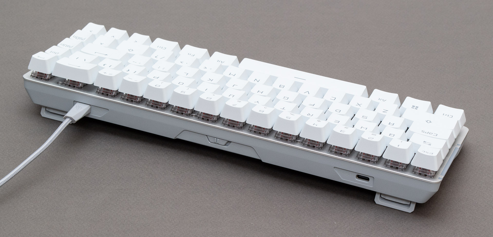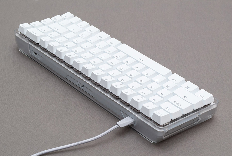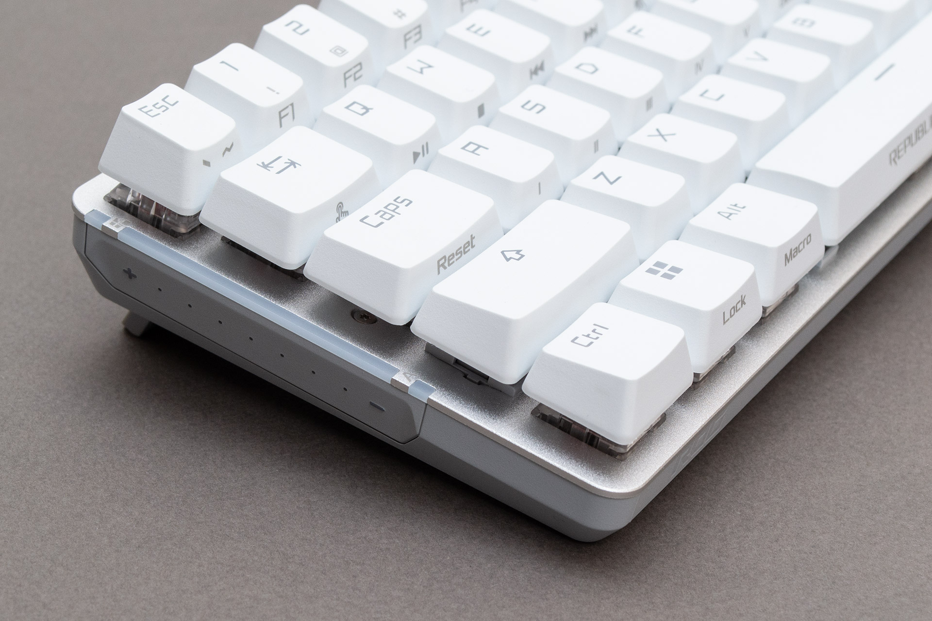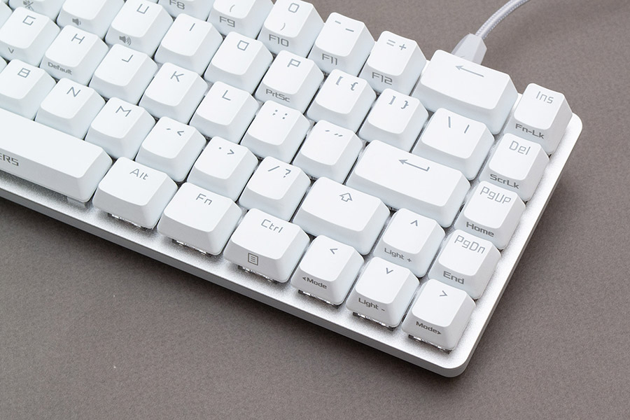 Розкладка клавіатури являє собою скорочений на половину довгих клавіш з правої сторони ANSI стандарт, позбавлений також і окремого верхнього ряду функціональних кнопок. З лівої сторони все звично, але починаючи з вкороченого Space нижній ряд зсунутий вліво, щоб вмістити стрілочки. Англійські літери знаходяться посередині зверху ковпачків клавіш. Нанесені вони шляхом подвійного лиття. Українське гравіювання на цьому екземплярі клавіатури відсутнє. Символи додаткових функцій відмічені на передніх гранях відповідних кнопок методом термічної сублімації. Кнопка Fn займає місце правої клавіші Win. На своєму місці присутні звичні тактильні насічки на клавішах «F» та «J», але вони дуже невиразні.