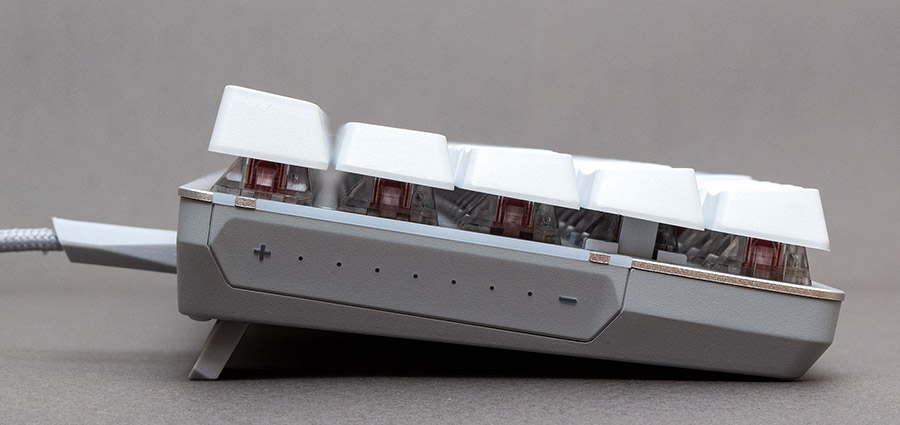 Висота клавіатури зі складеними ніжками по задньому ряду клавіш складає 36 мм. З розгорнутими ніжками першого рівня — 40 мм. З розгорнутими ніжками другого рівня — 45 мм. Тут використовується OEM-профіль ковпачків кнопок з циліндричним заглибленням по центру.