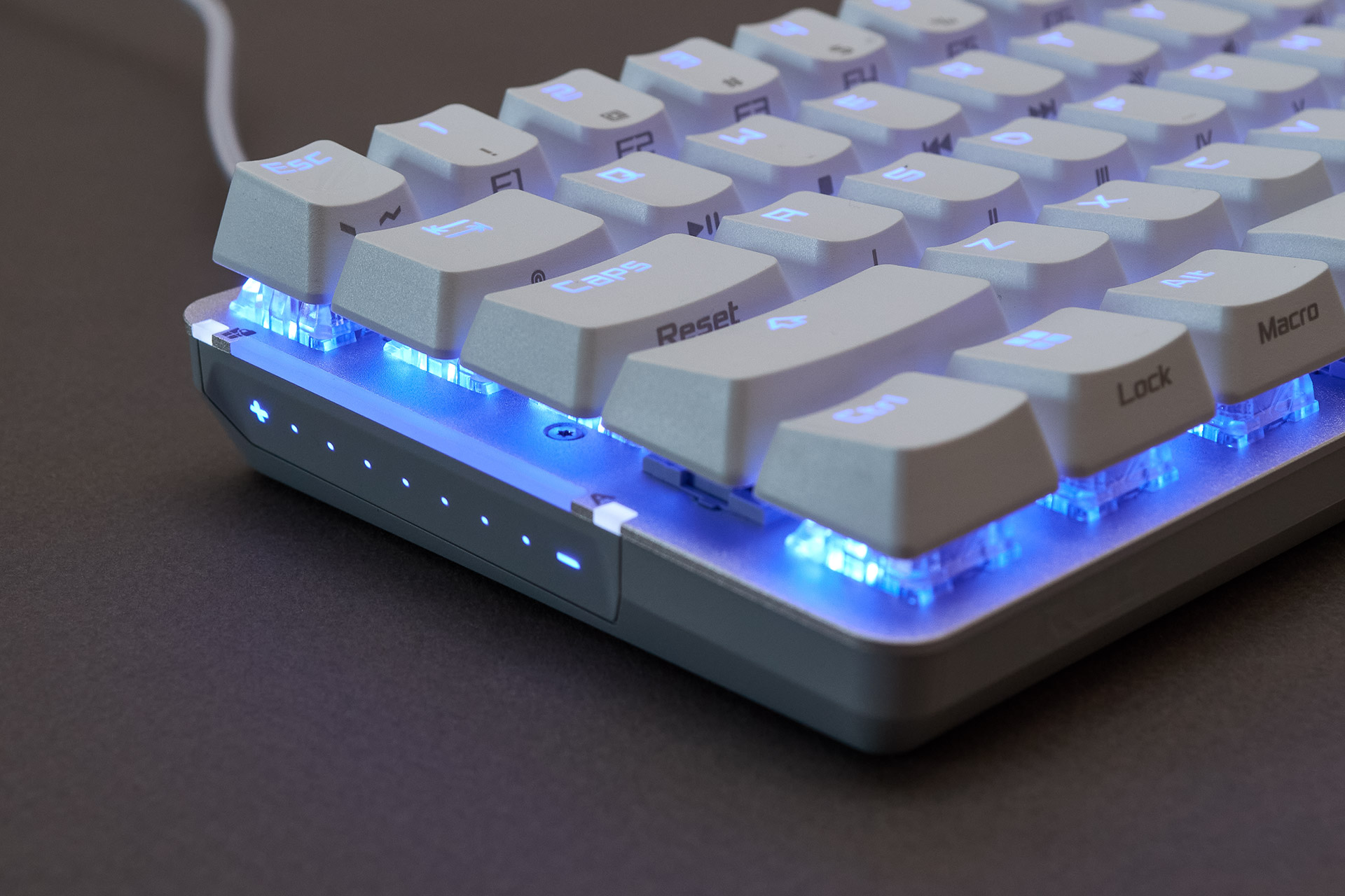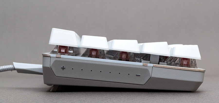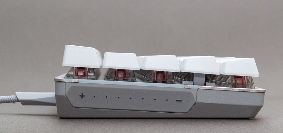 На лівій боковині вмонтовано сенсорну панель зі смугою з дев’яти білих світлодіодних індикаторів над нею. Якщо проводити пальцем по панелі вперед, або назад, регулюється гучність системного звуку. Крім того, можна торкатися пальцем в трьох окремих зонах панелі — попереду, посередині та позаду. Це активує три додаткові команди, якщо вони прописані там через програмне забезпечення. Все це супроводжується світловими ефектами. Відключається сенсор сполученням клавіш Fn+Tab. І включається так само. Світлодіодний індикатор Caps Lock знаходиться знизу смуги, а індикатор Win Lock — зверху. І вони також білі.