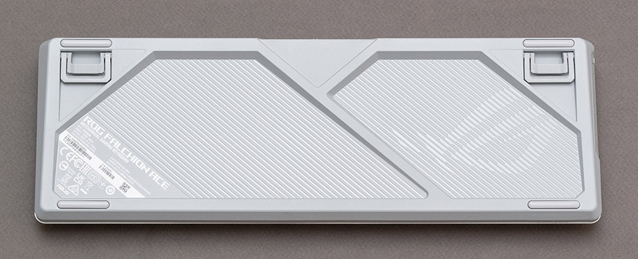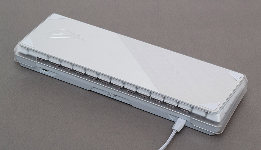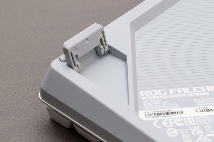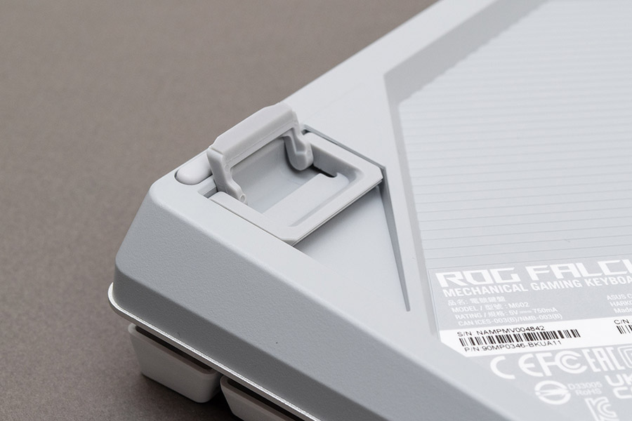 По міцності ROG Falchion Ace відчувається повністю монолітною, завдяки товстому пластику з ребрами жорсткості та металевій пластині під клавішами. З одного боку це досить легка клавіатура, її просто переставляти з місця на місце. З іншої сторони, гумові ніжки тут добре тримаються за поверхню як в складеному, так і в розкладеному вигляді. Ще досить дивним виглядає рішення з двома портами та перемикачем. Добре, що таке є, але на перемикання повзунка витрачається приблизно стільки ж часу, як і на підключення другого кабелю в той самий USB Type C порт, за потреби працювати з іншим ПК.