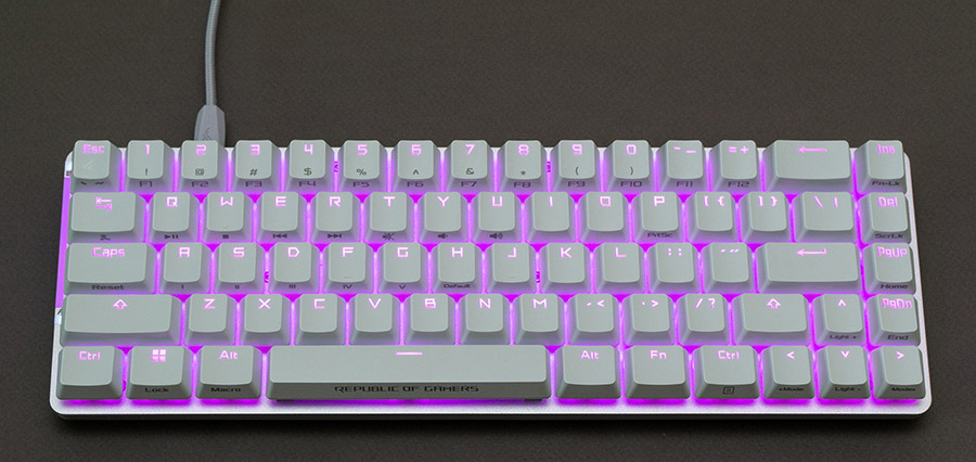 В бездротовій версії ROG Falchion використовувалися перемикачі Cherry MX. В ROG Falchion Ace вони замінені на фірмові ROG NX. І, як на мене, це непогано. По-перше, Cherry MX вже давно перестали бути синонімом абсолютної якості, а от по вартості завжди займали перше місце. А на практиці потребували хоча б додаткового змащування. По-друге, майже всі провідні виробники ігрової периферії зараз перейшли на перемикачі власних брендів. І варіант ASUS ROG NX вийшов досить вдалим. Хороша загальна якість, добре підігнані деталі, змащені корпуси й штоки з заводу. А в даному екземплярі клавіатури це доповнюється прошарком шумоізоляції під клавішами, непоганими та також змащеними стабілізаторами довгих клавіш (яких тут по факту лишилося лише дві), та приємними на дотик і стійкими до зносу ковпачками клавіш з PBT пластику. В результаті, тактильні відчуття від друку на цій клавіатурі дуже і дуже хороші.