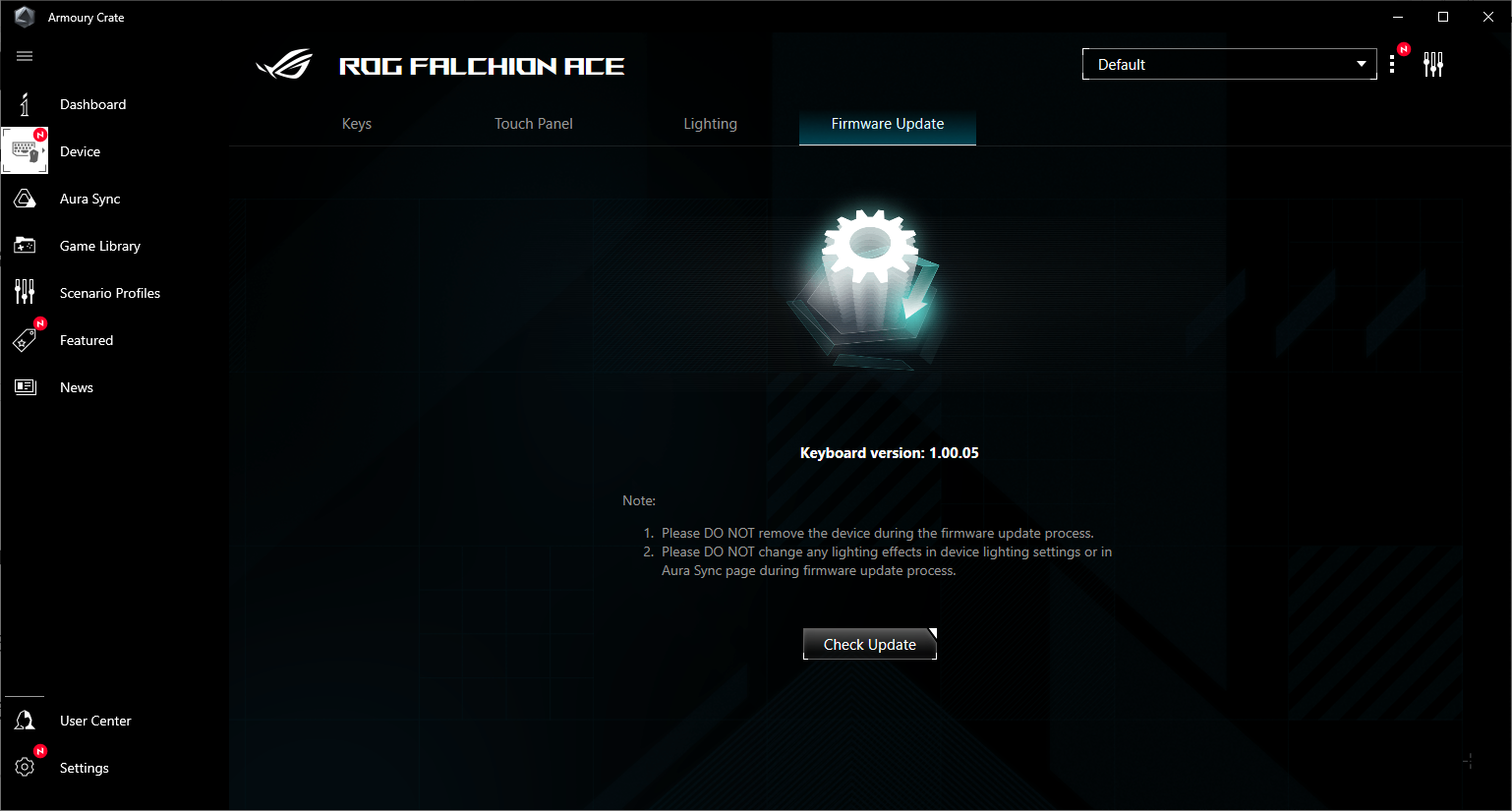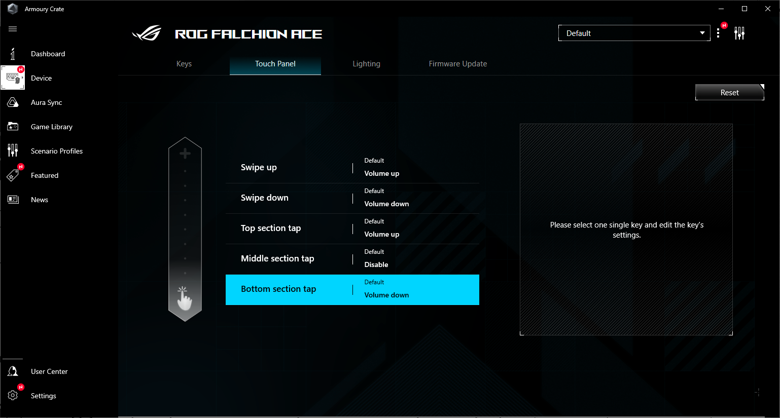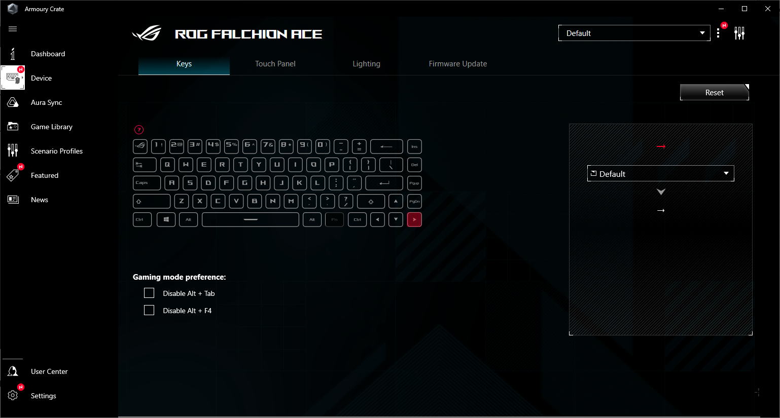 Як програмне забезпечення ASUS ROG Falchion Ace використовує вимогливий до ресурсів системи застосунок Armoury Crate. ПЗ потребує завантаження та інсталяції. Для налаштування клавіатури є п'ять вкладок. Перша відповідає за зміну призначення кнопок. Для цього доступні усі клавіші окрім Fn. Призначити можна команди клавіатури та миші (лише лівої чи правої кнопки), макрокоманди, запуск програм чи відкривання сайтів, мультимедійні та Windows команди, запуск самого драйвера Armoury Crate, введення певного тексту, повне відключення клавіші, або повернення її функції за налаштуванням. Є і кнопка скидання всього на початкові налаштування. Також в ігровому режимі окрім кнопки Win можна відключити комбінації Alt+Tab та Alt+F4.