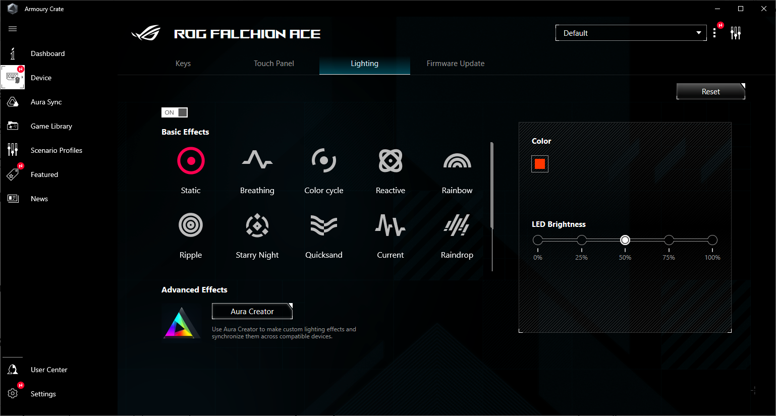 В налаштуваннях підсвітки доступні 11 видів ефектів включно зі статичним підсвічуванням. Підсвітку можна відключити повністю. Для індивідуального налаштування підсвітки кожної кнопки потрібно буде завантажити програму Aura Creator.