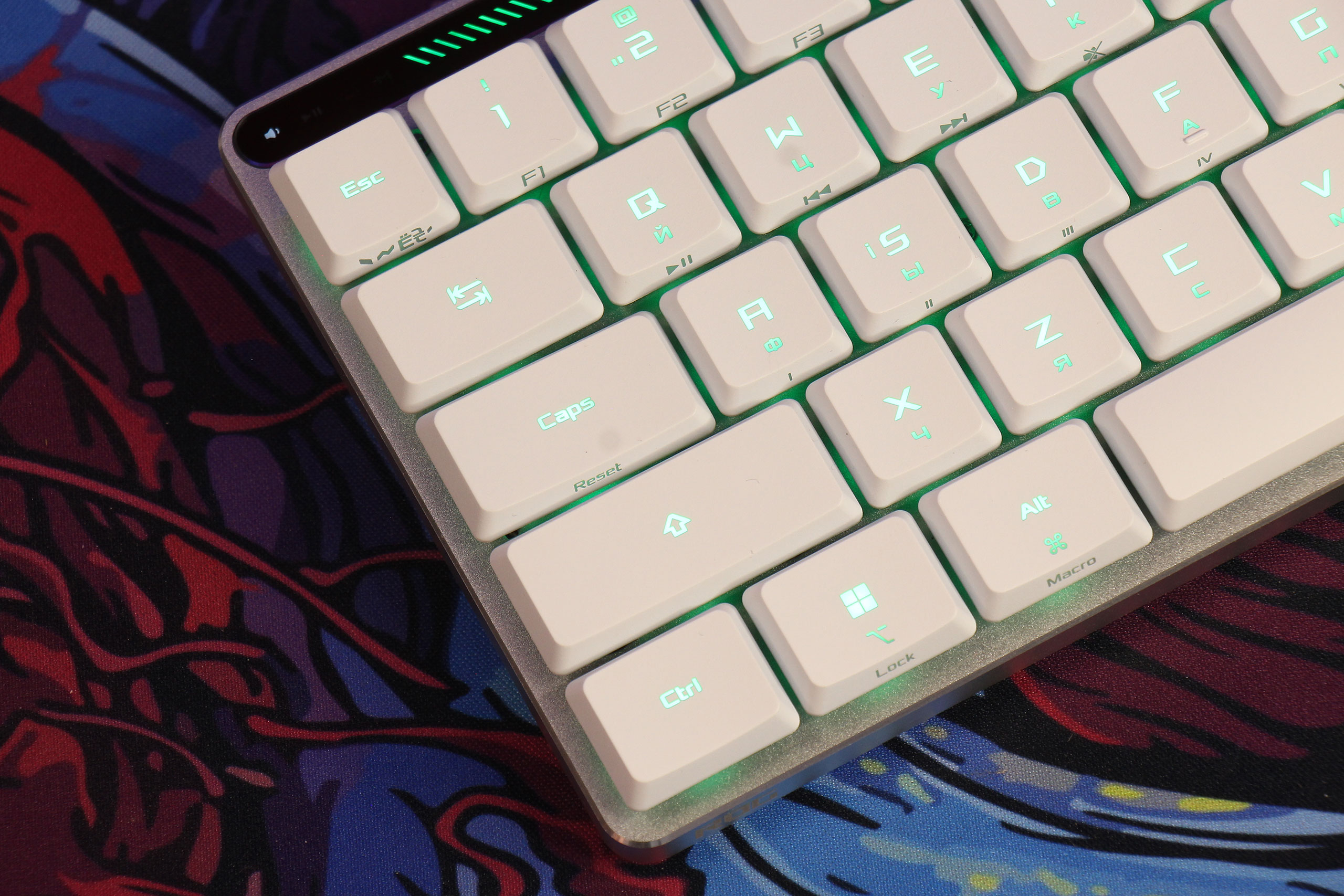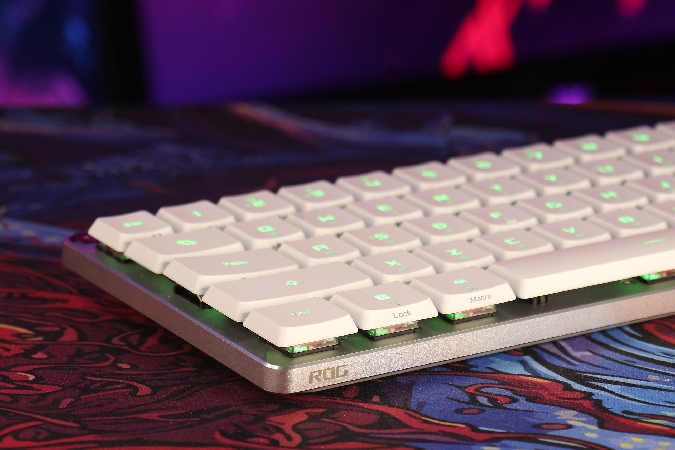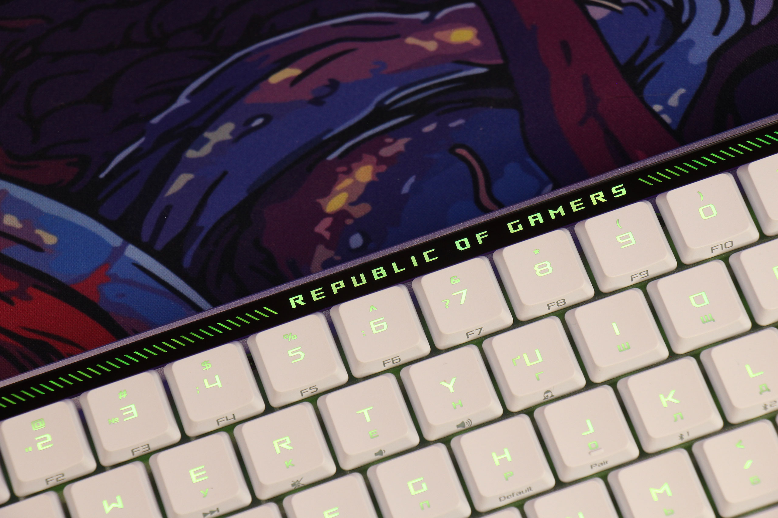 Низькопрофільні оптичні перемикачі ROG RX — ще одна важлива особливість. Вони пропонують хід 2,8 мм з точкою спрацьовування на 1 мм, що забезпечує швидкий відгук при натисканні. Доступні два варіанти: лінійні Red та тактильні Blue (в нас на тесті перший варіант, набагато універсальніший). Обидва типи попередньо змащені, що покращує плавність ходу та зменшує шум. Стабілізатори довгих клавіш також змащені, що забезпечує плавний хід без дратівливого деренчання. Важливо зазначити, що ці перемикачі не підтримують гарячу заміну, на відміну від деяких інших моделей ASUS, як-то ROG Azoth та ROG Strix Scope II 96. В теорії, ніщо не заважає робити низькопрофільну клавіатуру з «хот-свапом», відповідні перемикачі наявні на ринку від декількох виробників, але ASUS в цьому випадку зберегла традиційний підхід геймерського бренду, за який подібними продуктами одразу нехтують ентузіасти клавіатур. Це дещо помилково, адже хороша заводська клавіатура знайде величезну кількість прихильників у її серійному вигляді без доробок. Але голоси фанатів тюнінгу надто гучні й роками негативно впливали на імідж всіх геймерських А-брендів на клавіатурному ринку — ситуація почала змінюватися тільки останню пару років…