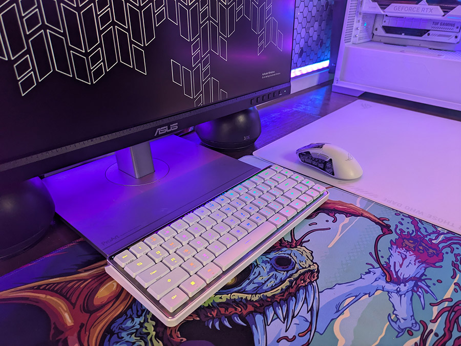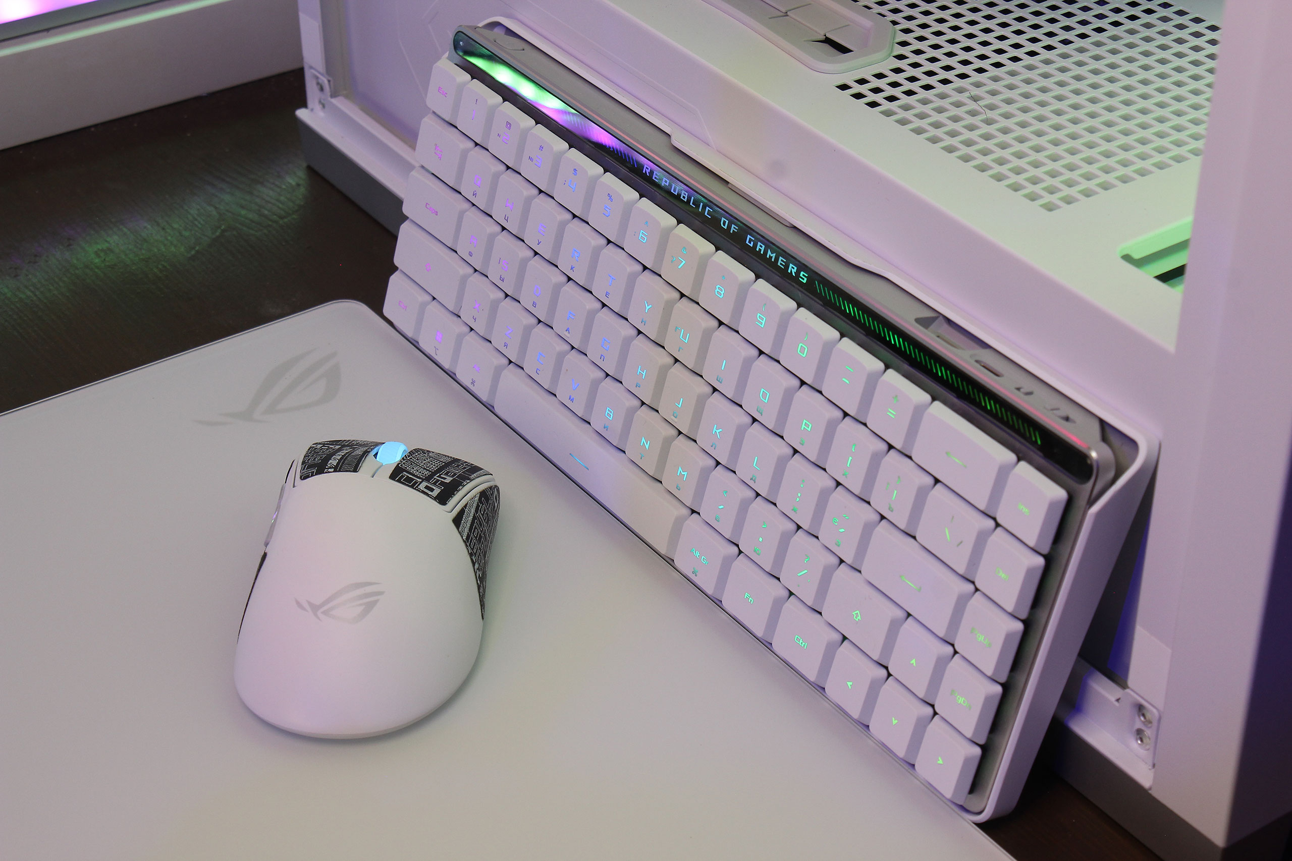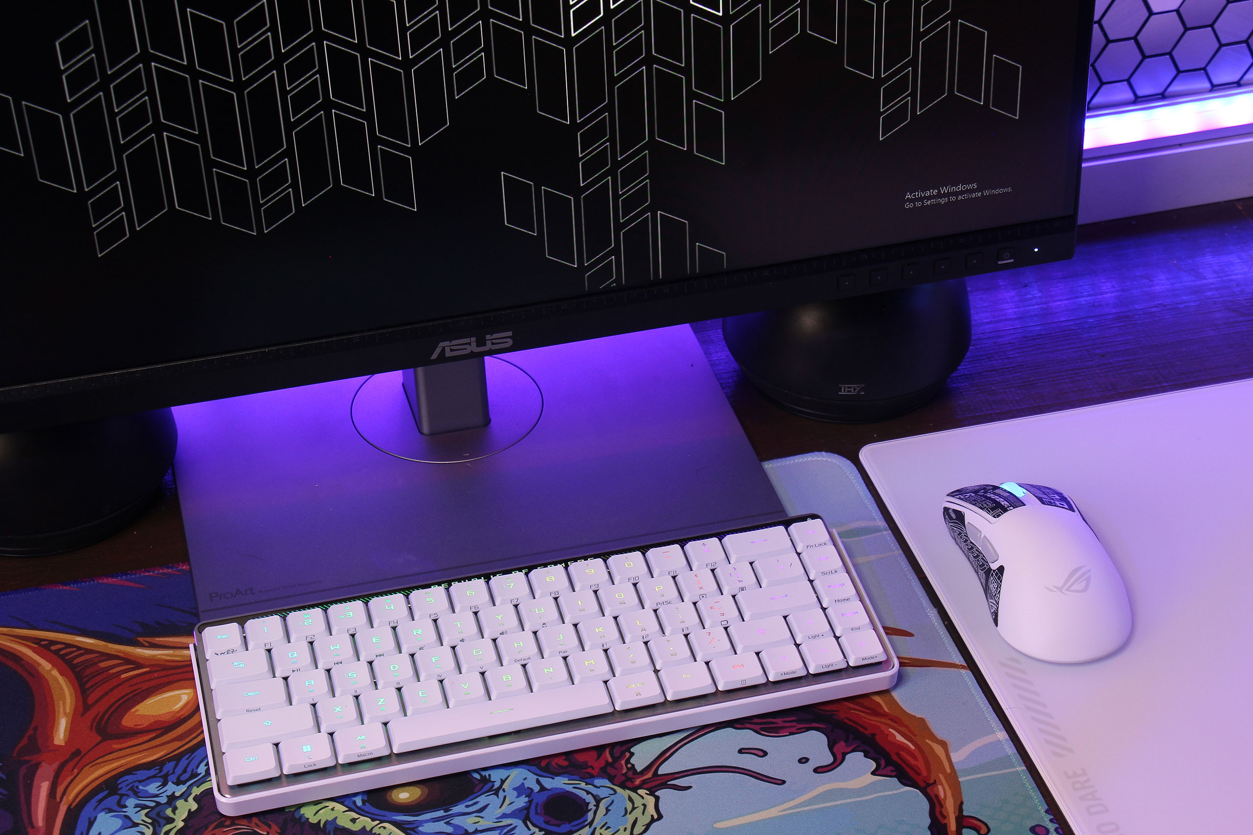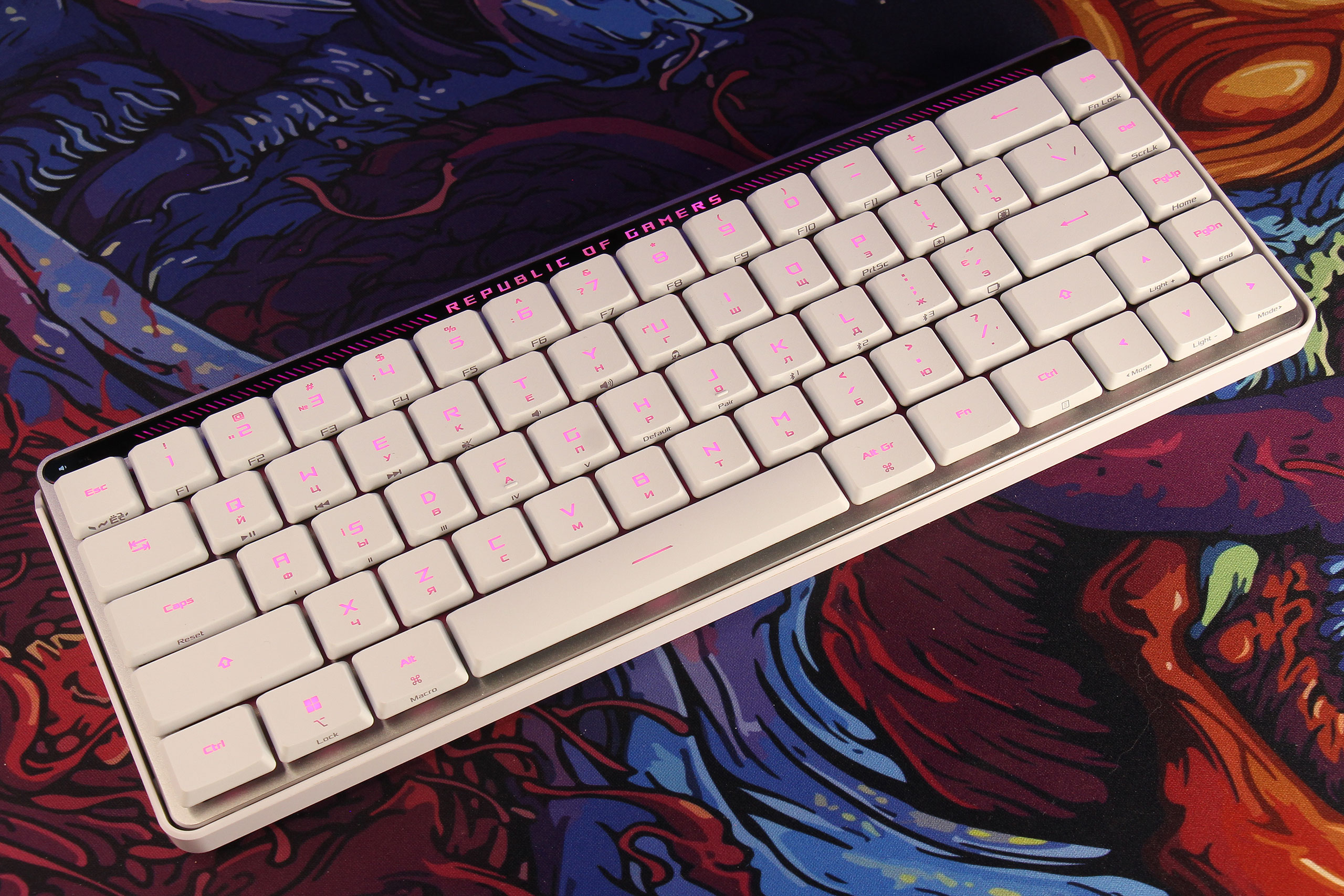 При роботі з текстом відчуття дещо відрізняються від звичайних механічних клавіатур. Низькопрофільні клавіші потребують певного часу на звикання, особливо якщо здійснювати перехід з традиційної механічної клавіатури, а не з ноутбука. Порівняно з ноутбуками, до речі, відчуття теж дивні, адже при схожій висоті це все ж таки механіка. Проте, після адаптації, швидкість набору тексту може навіть зрости завдяки коротшому ходу клавіш. Тактильний відгук достатній для комфортного друку, хоча деяким користувачам може не вистачати більш вираженого відчуття натискання. І з цим вже нічого не вдієш, адже hot swap немає. Це обмежує можливості кастомізації для ентузіастів, які люблять експериментувати з різними типами свічів. Проте, враховуючи цільову аудиторію клавіатури та її компактні розміри, це рішення можна зрозуміти — ASUS тільки починає відкривати для себе світ кастомних клавіатур, тож пристрої low-profile можна дещо відкласти, це й так екзотика на ринку…