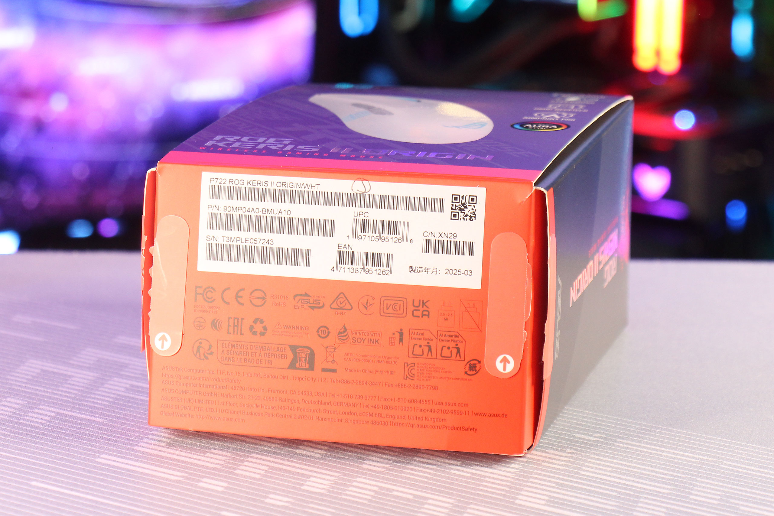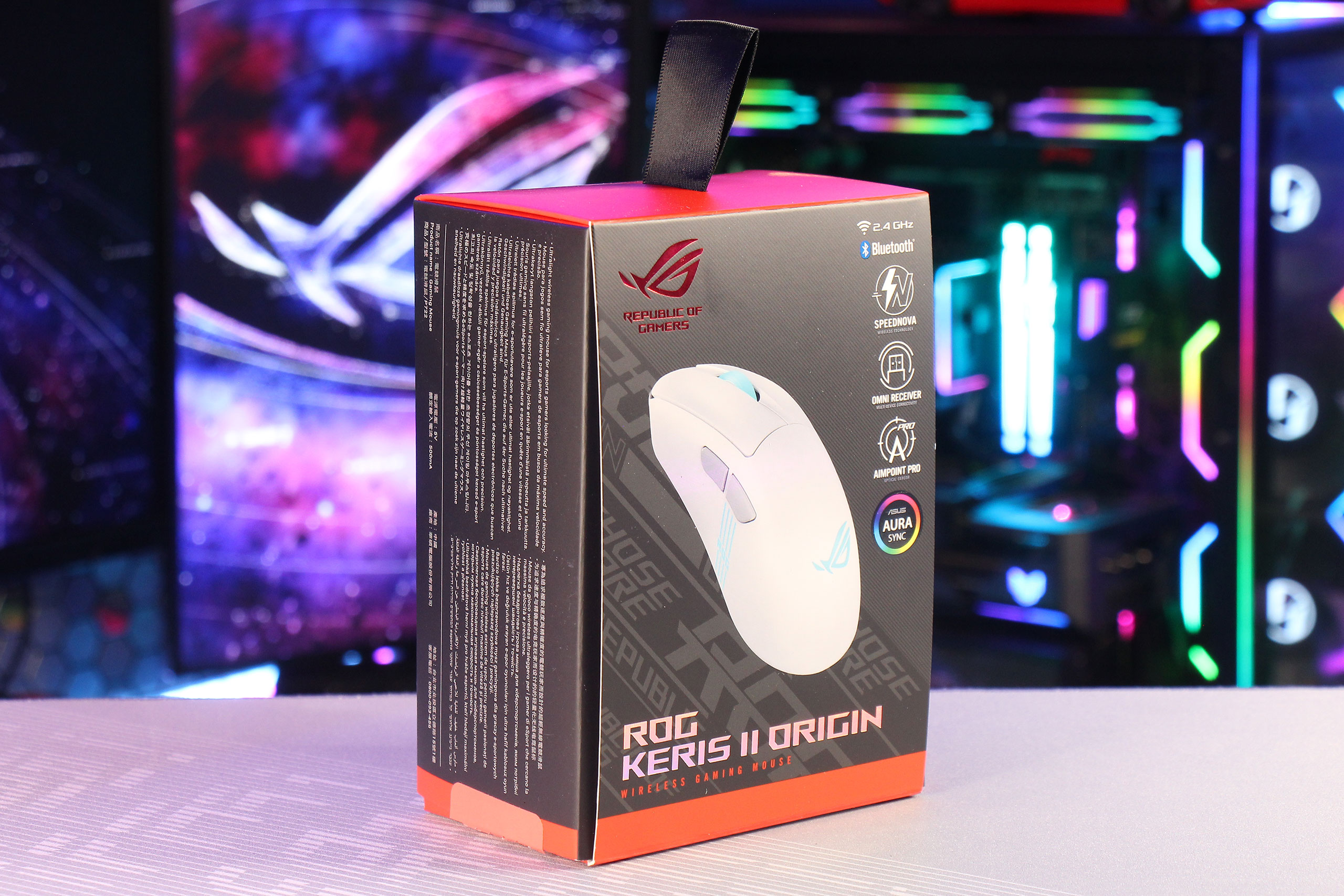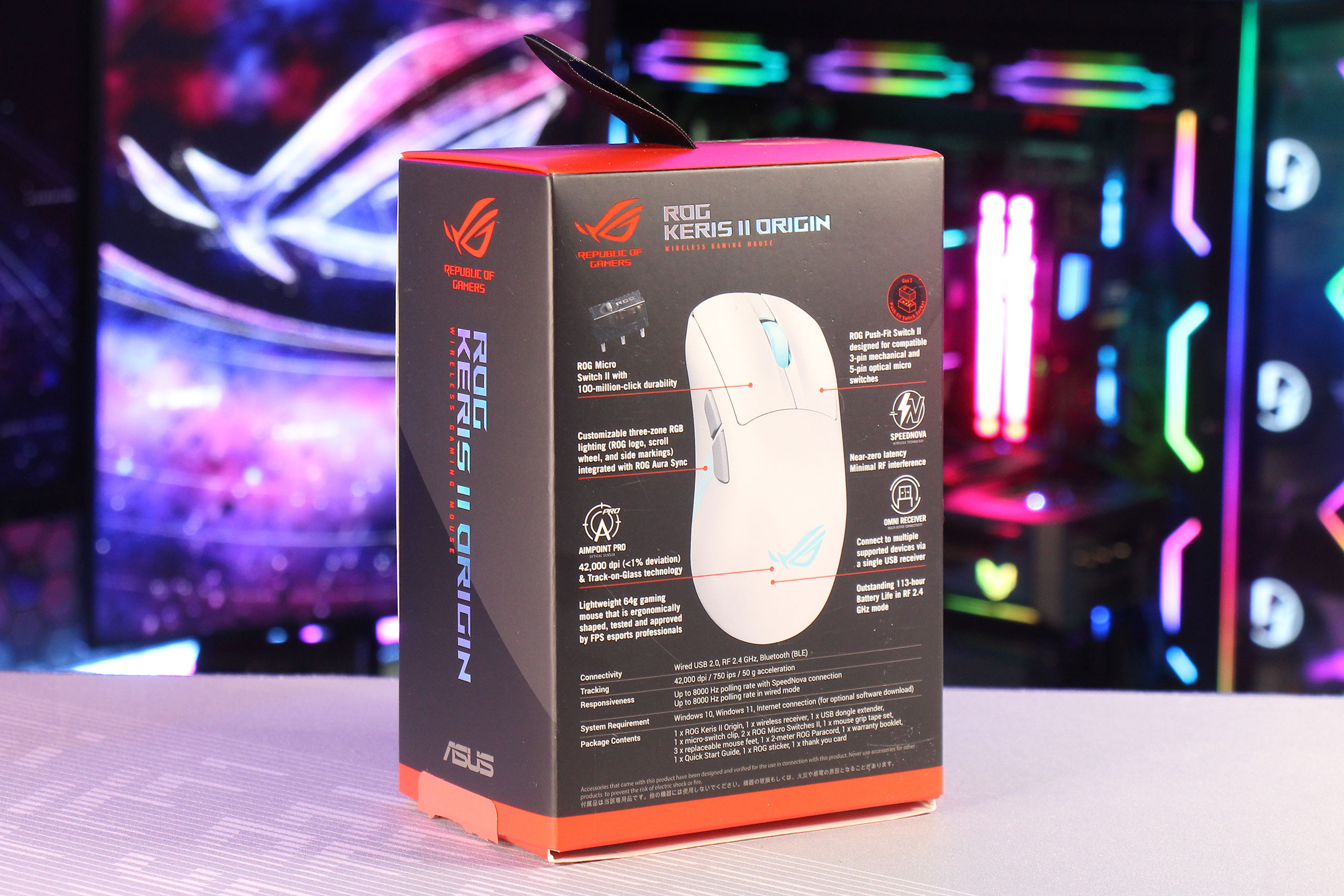 ASUS ROG Keris II Origin постачається в упаковці, характерній для флагманських продуктів лінійки ROG. Чорна коробка з акцентами червоного кольору одразу виділяється на полиці. Але при цьому виробник наголошує, що лише 1% ваги упаковки є пластиком задля екологічності.