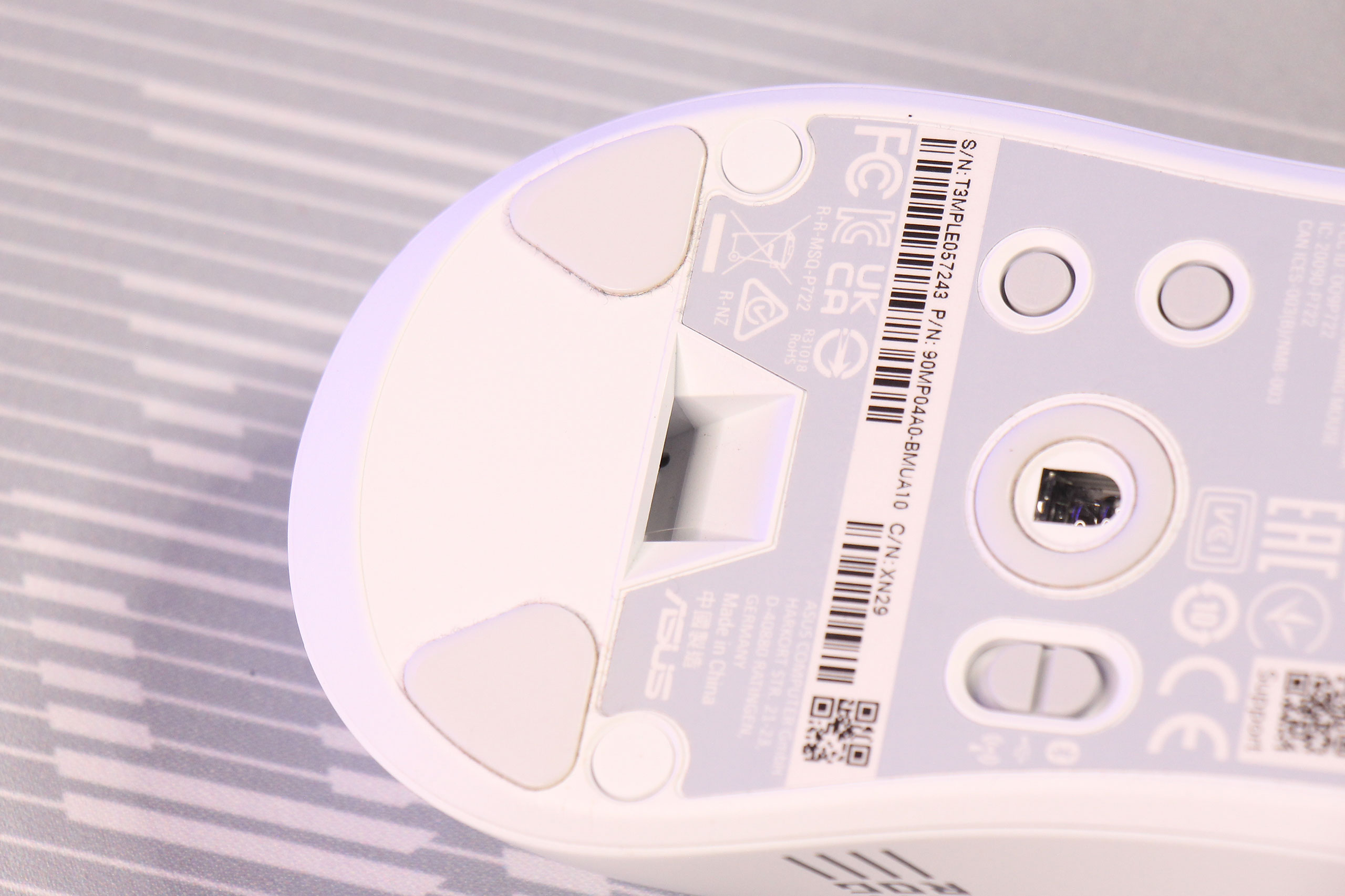 На нижній частині розташована кнопка перемикання DPI/профілів, парування Bluetooth та перемикач режимів. Чотири компактні PTFE-ніжки забезпечують плавне ковзання, а в комплекті є додаткові іншої форми для експериментів з відчуттями. Також бачимо приховані під декоративними заглушками (а не під ніжками!) гвинти для розбирання миші.