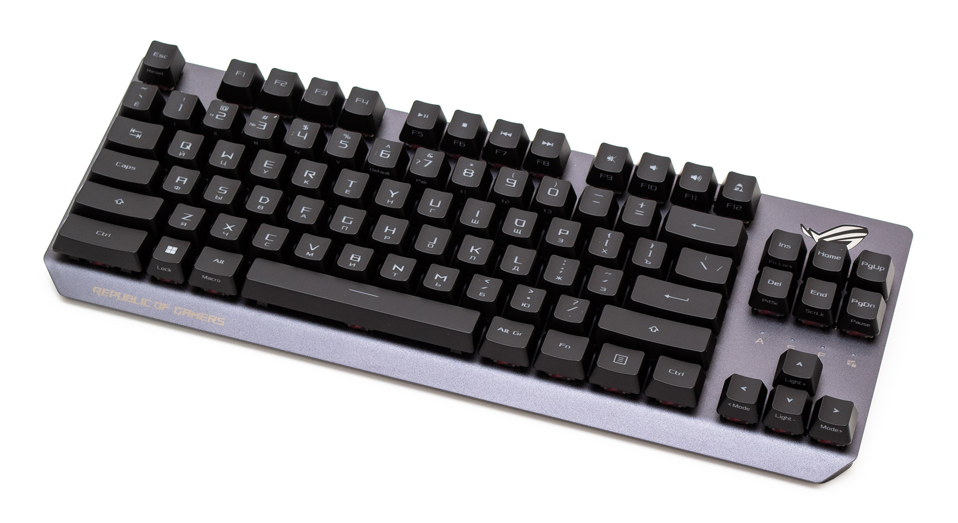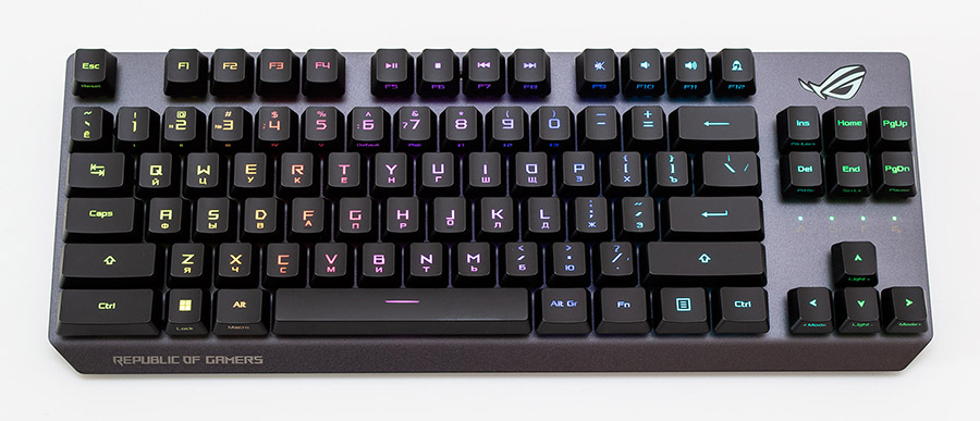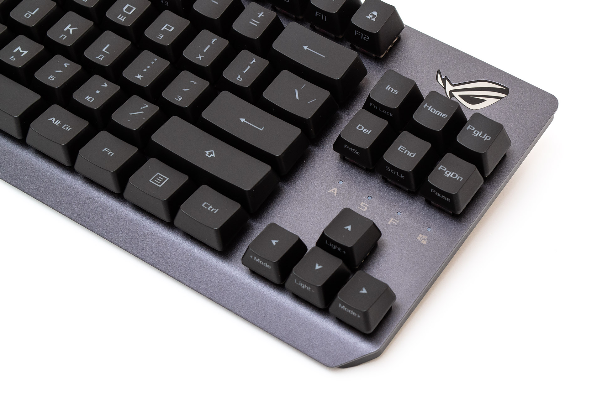 Цифрового блоку клавіш немає, оскільки це вкорочена TKL-клавіатура. Замість трьох кнопок PrtSc, ScrLk та Pause облаштовано сріблястий логотип ROG, який підсвічується та може виконувати роль індикатора заряду батареї. Над стрілочками знаходяться чотири точкові світлодіодні індикатори з позначками під ними — A (Caps Lock), S (Scroll Lock) F (Fn Lock) та символу Windows із замком (Win Lock).